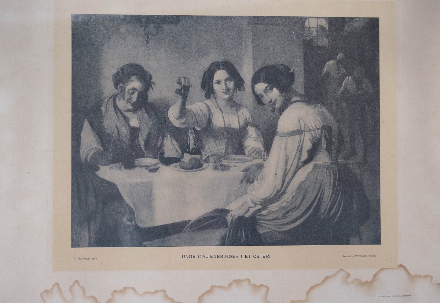 Print with portrait of three women and dark wooden frame from the 1940s.