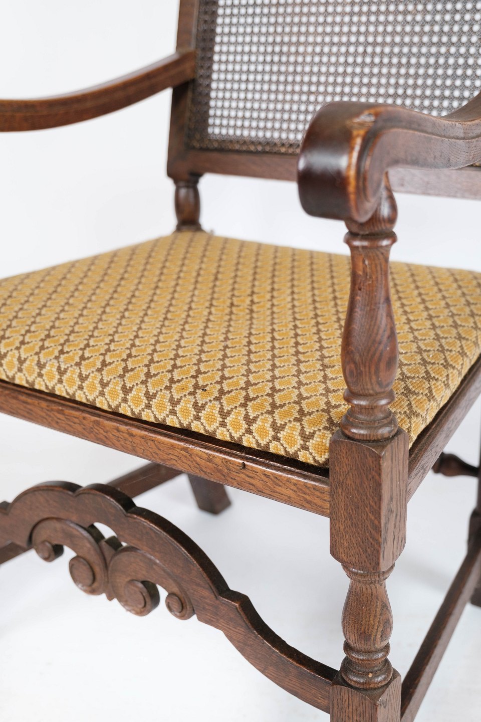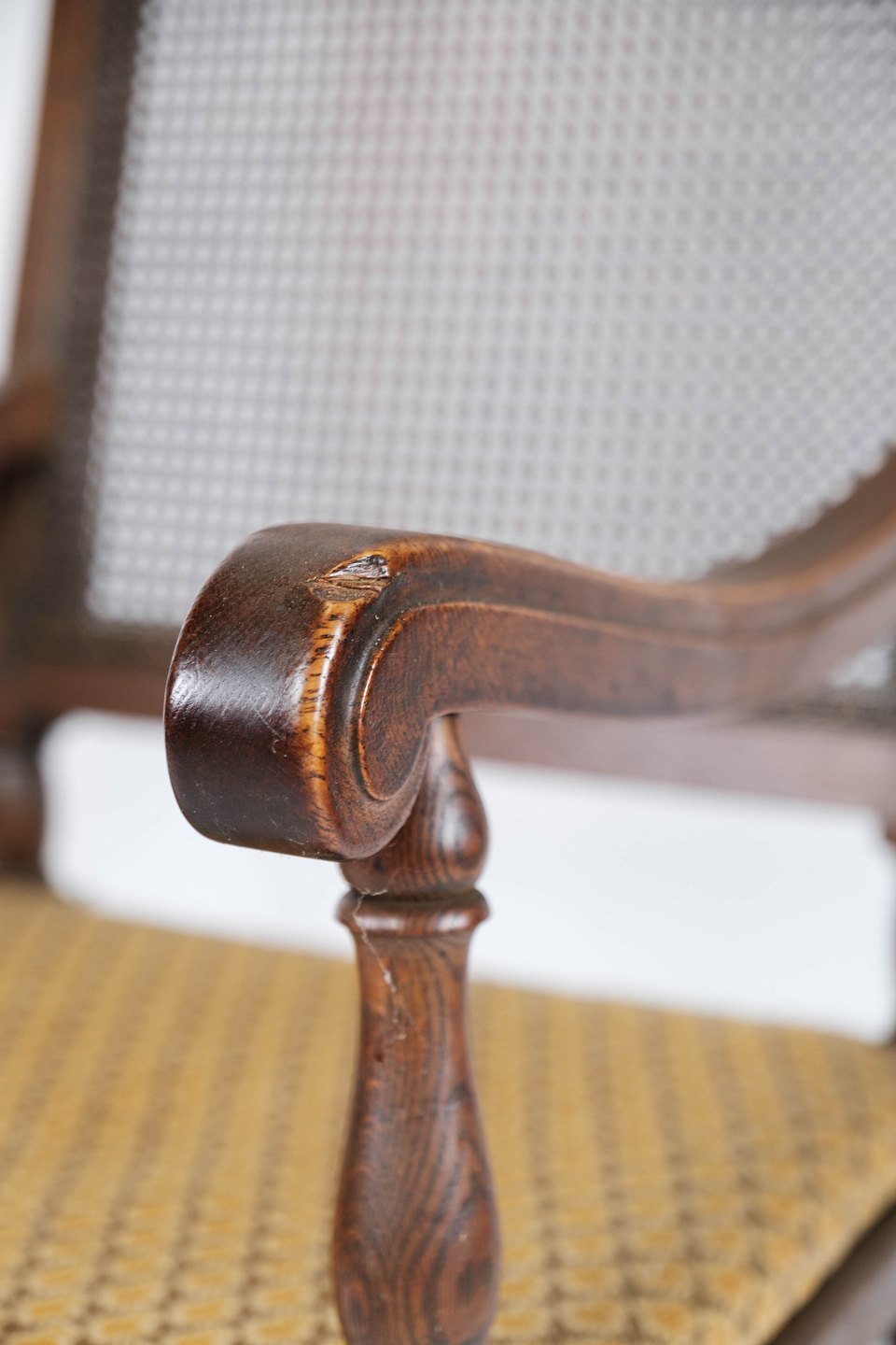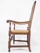 Antik armstol af eg, med original polstring af lyst stof og rørflet, fra 1920erne.