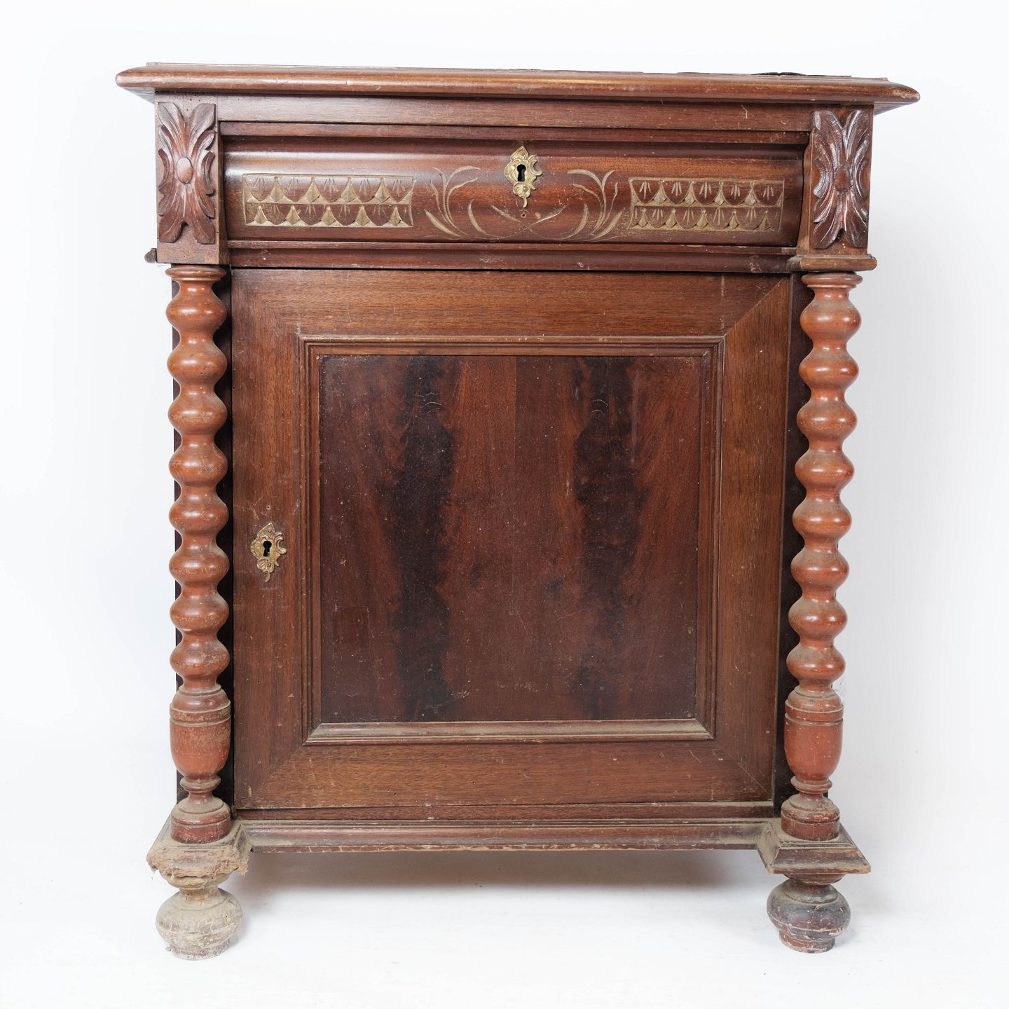 Mindre antikt skab af mahogni dekoreret med udskæringer, fra 1880erne.