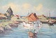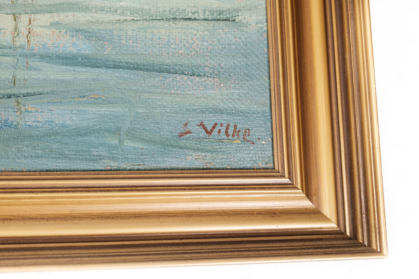 SolgtMaleri på lærred med havnemotiv og forgyldt ramme, signeret Vilke fra 1930erne.