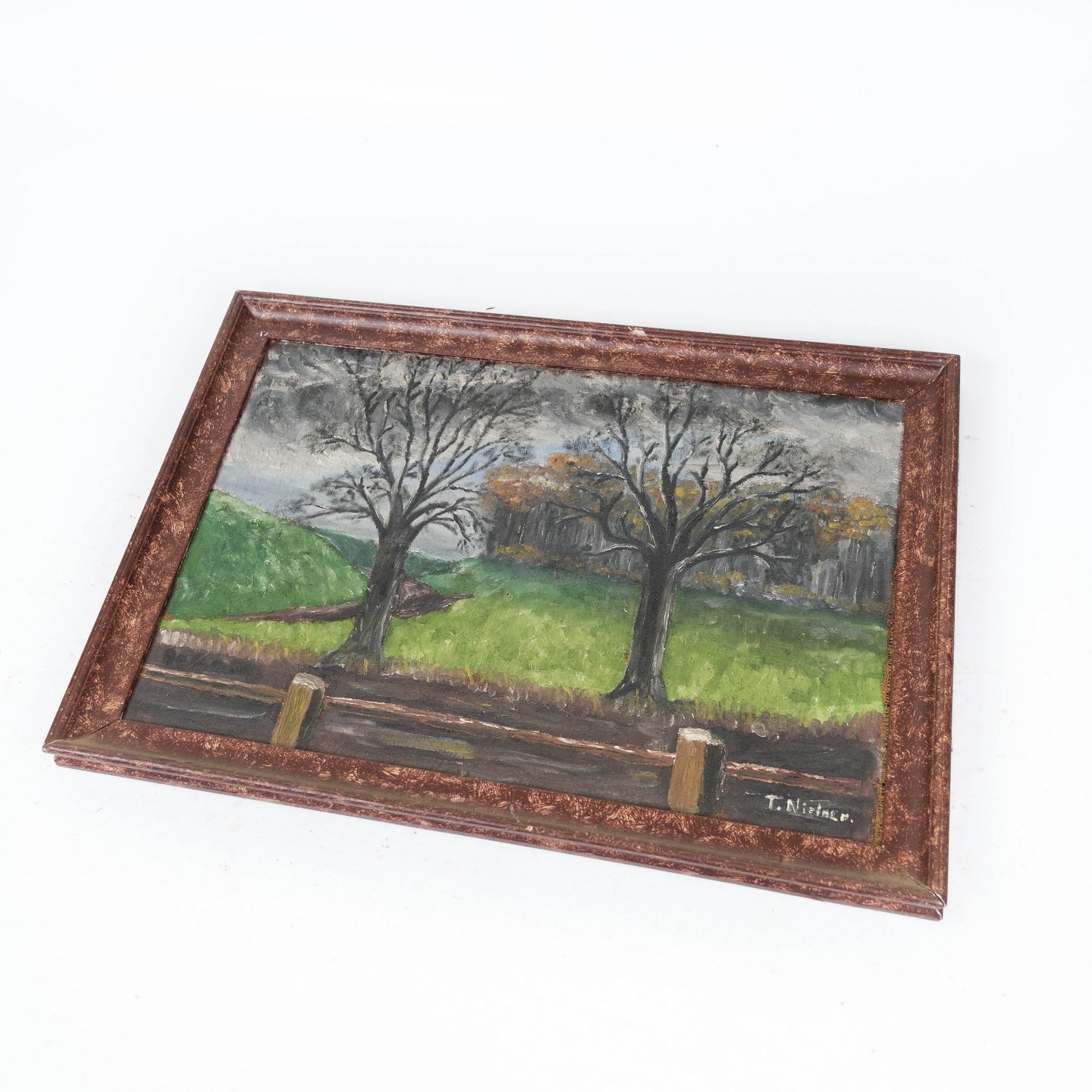 Painting on canvas with nature motif and dark frame, signed T. Nielsen from the 1930s.