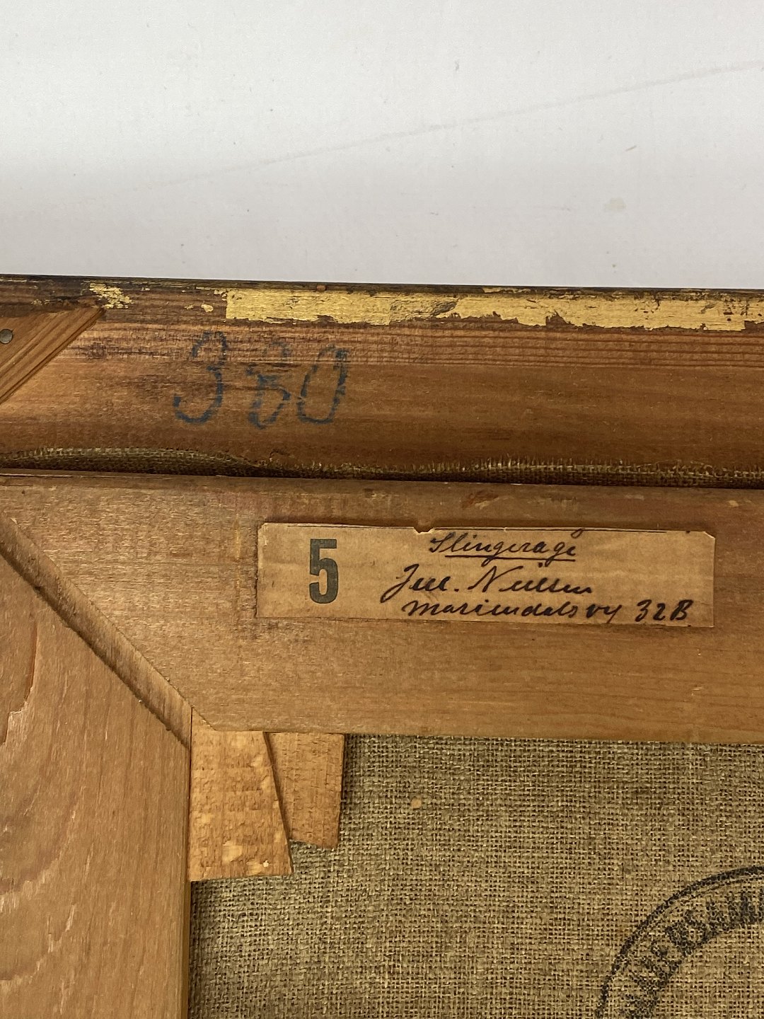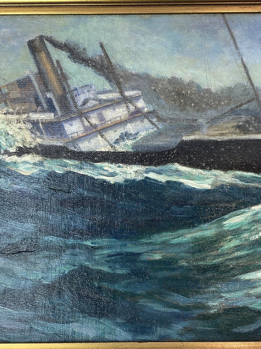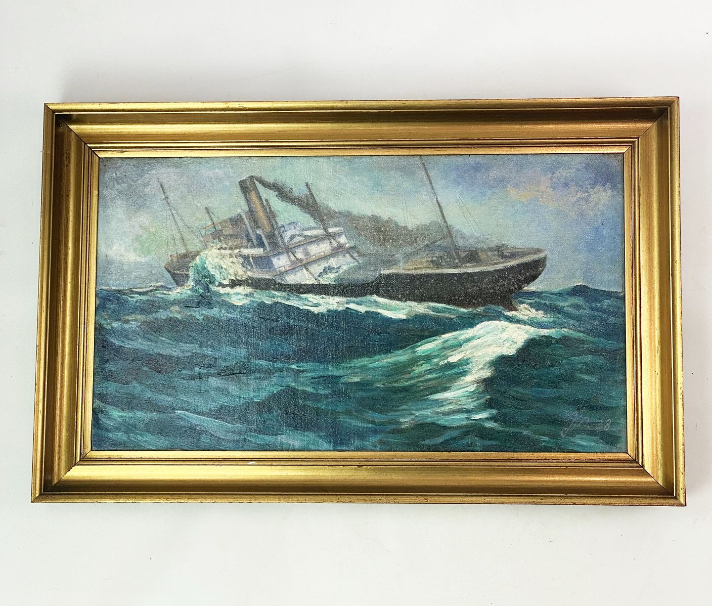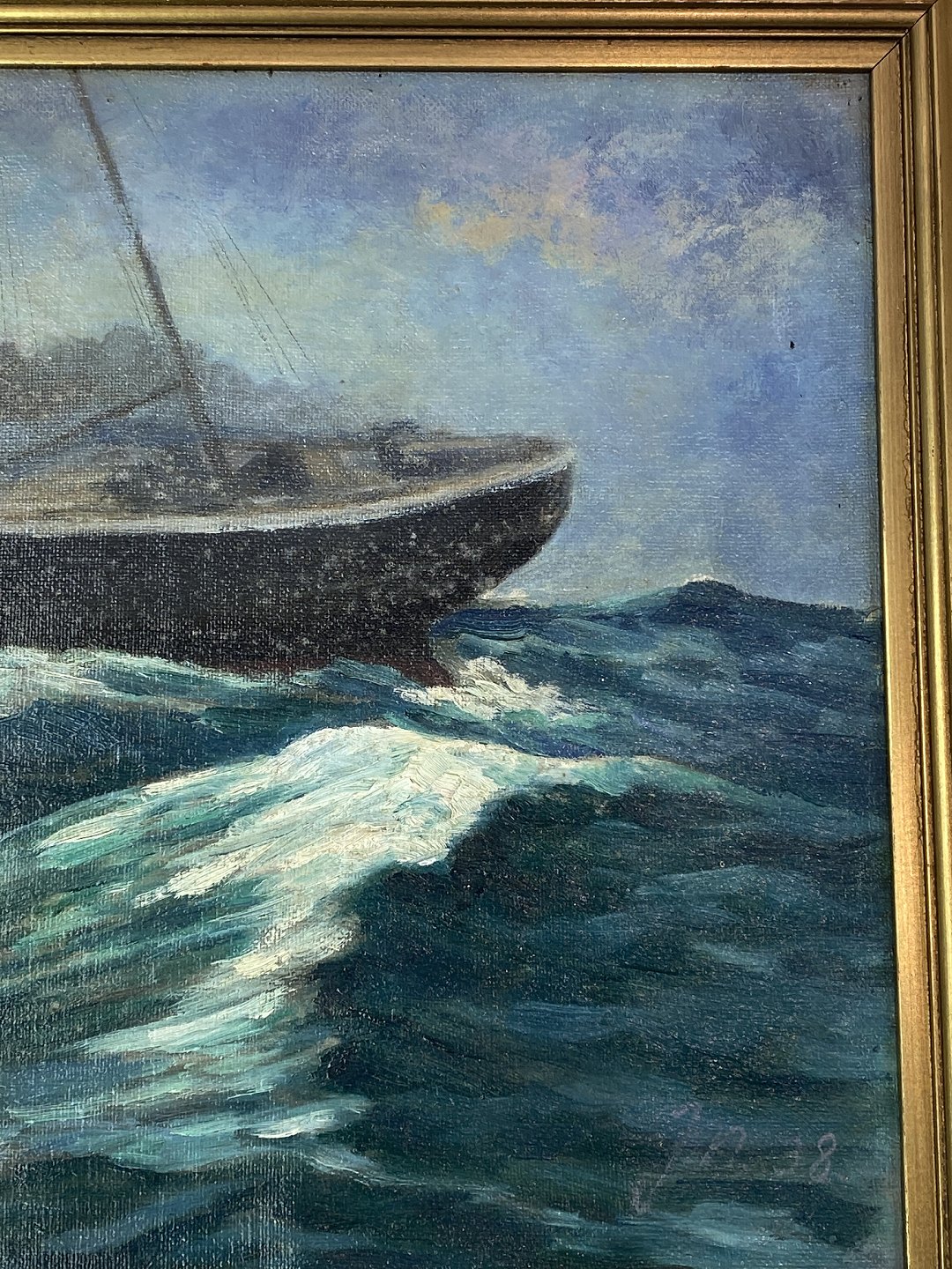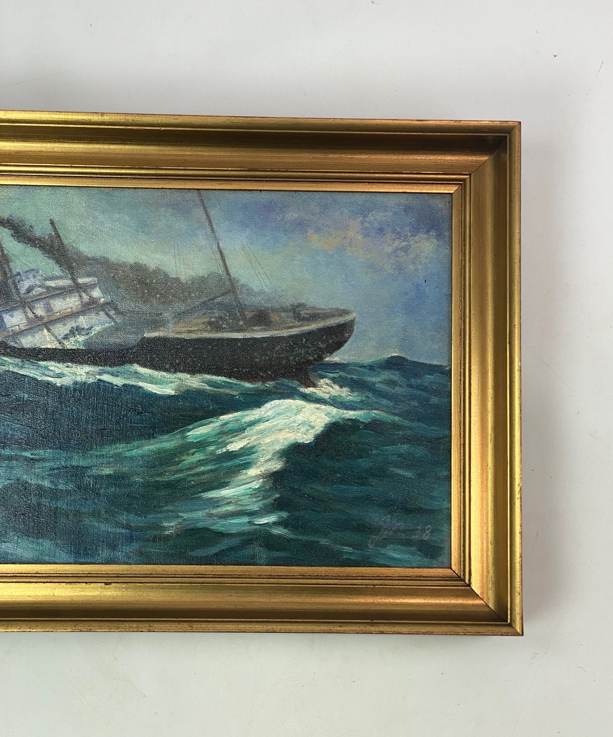 Maleri på lærred med marine motiv og forgyldt ramme signeret JN af Jens Nielsen i 1938.