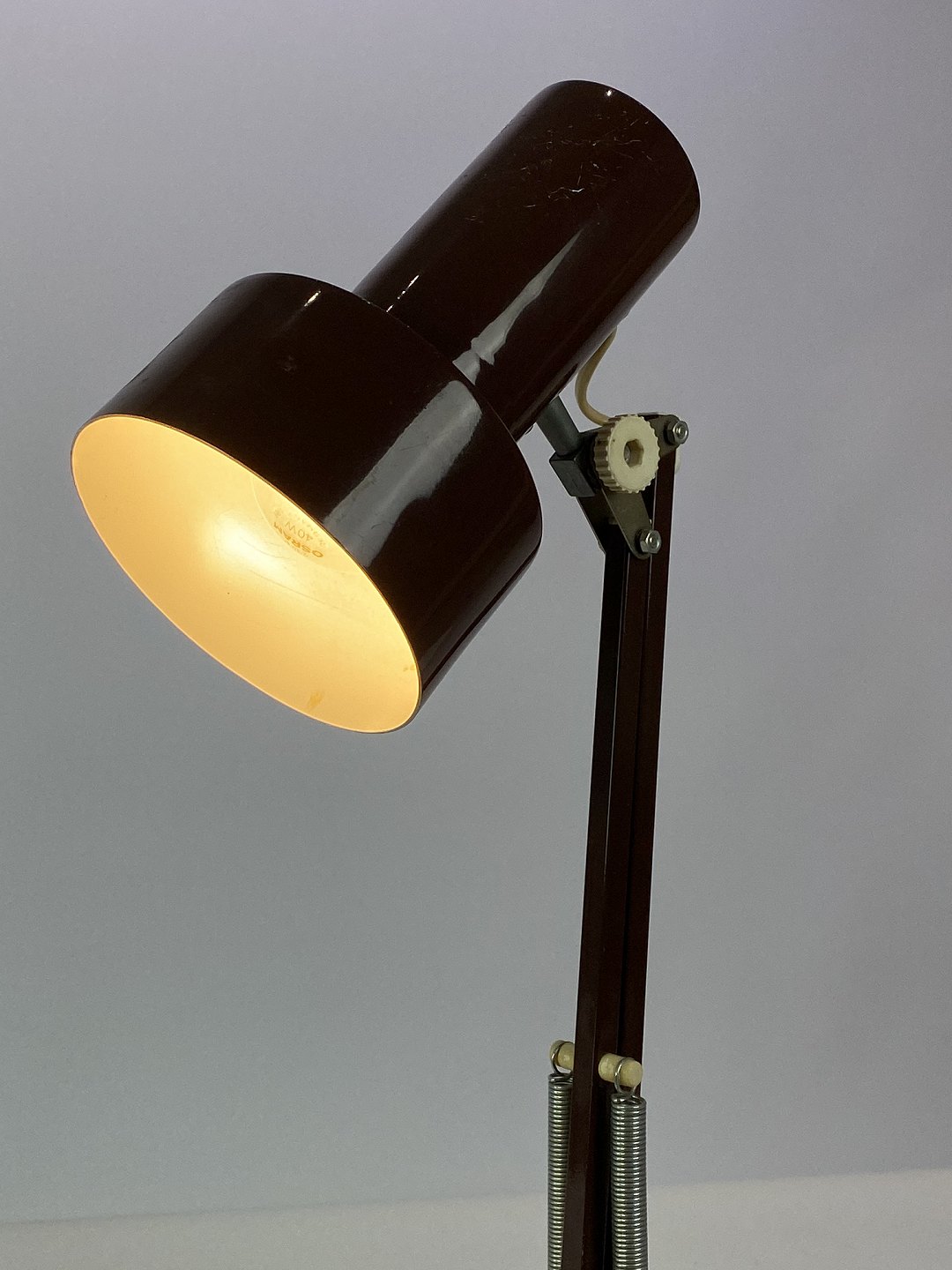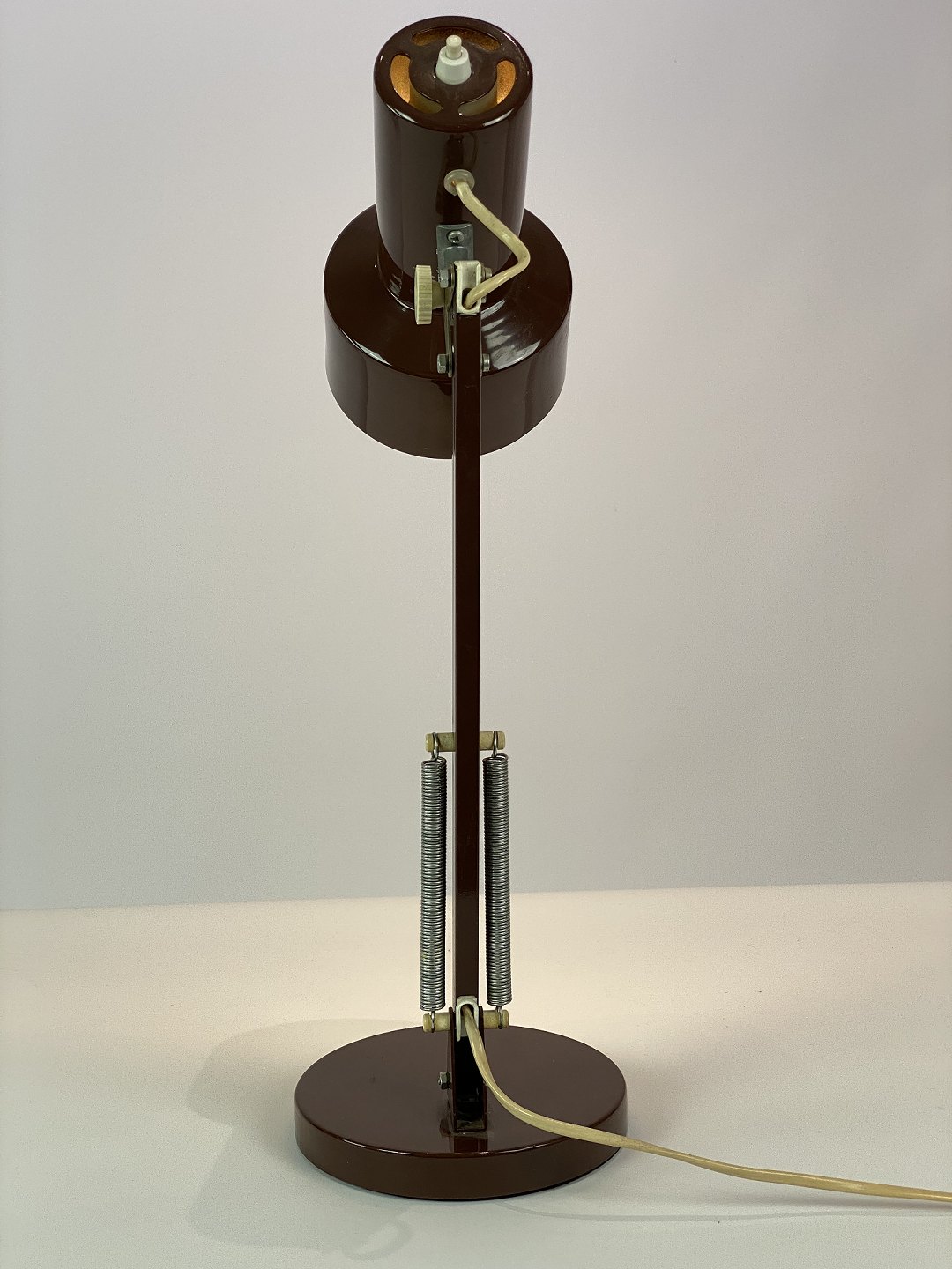 Bordlampe i brun lakeret metal, af dansk design fra 1970erne. Lampen er i flot brugt stand.
