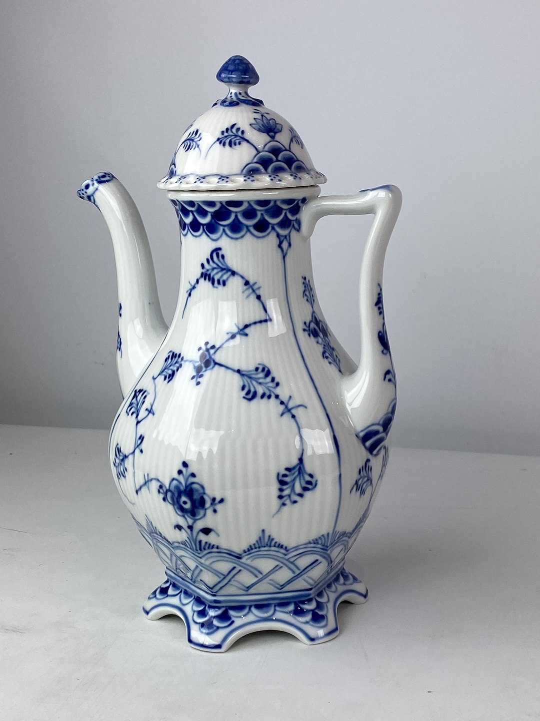 Kgl. Musselmalet helblonde kaffekande, nr.: 1/1202. Kanden er i flot brugt stand.