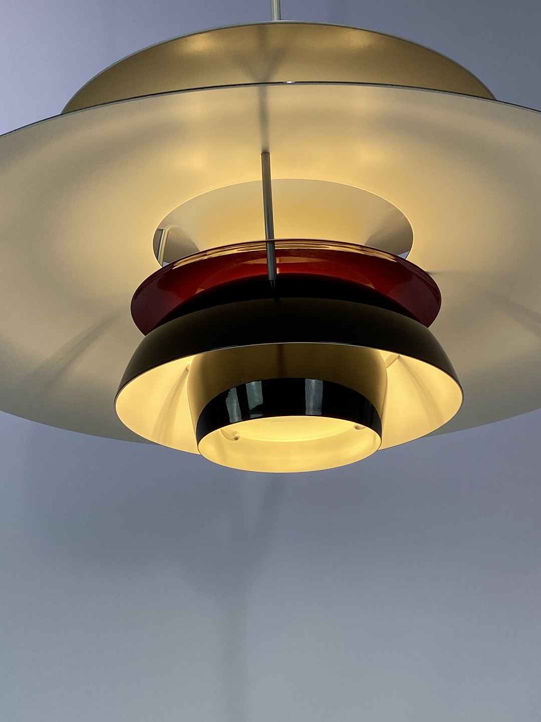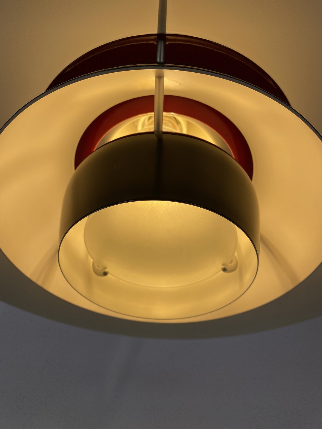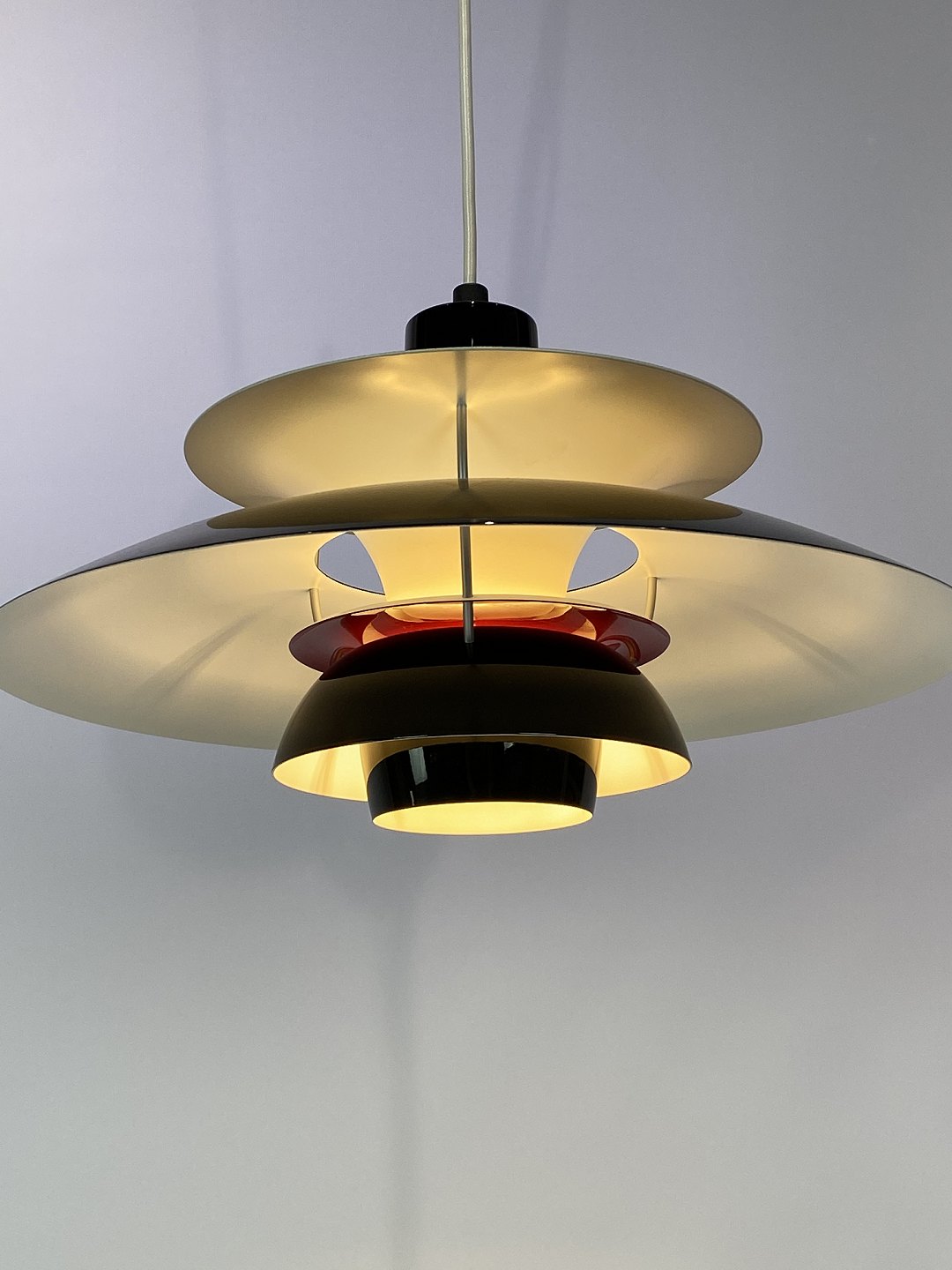 PH5 lamp designed by Poul Henningsen in 1958 and manufactured by Louis Poulsen. The lamp has lacquered metal shades in black, red and white, as well as being a newer model.