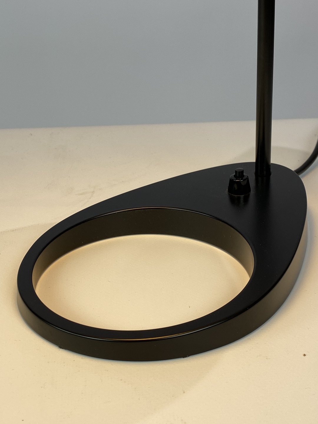 Black table lamp designed by Arne Jacobsen and manufactured by Louis Poulsen. The lamp was originally designed for the SAS Royal Hotel in Copenhagen in 1957 for the hotel's design concept. The lamp here is the original made of steel with a tiltable head, which emits a direct and directional light. It is lacquered white on the inside and black on the outside. The lamp is in great vintage condition.