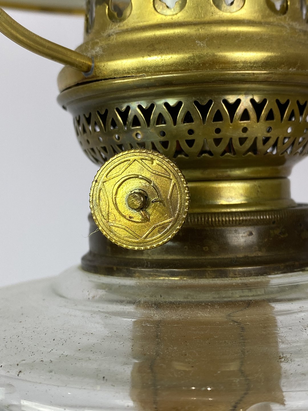 Petroleumslampe af patineret metal og skærm af hvid opalglas fra omkring 1860. Lampen er i flot antik stand.