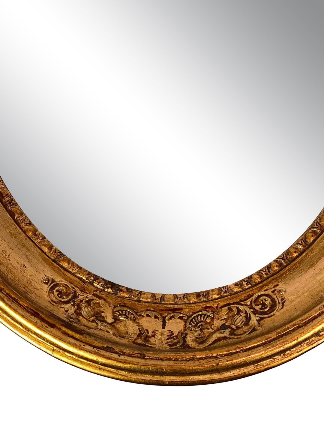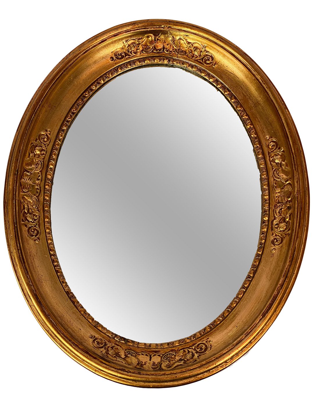 SolgtOvalt spejl med ramme af bladguld, fra 1920erne. Spejlet er i flot antik stand.