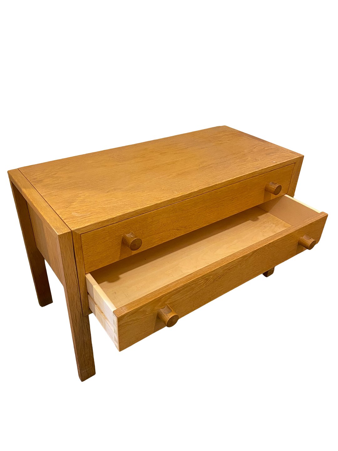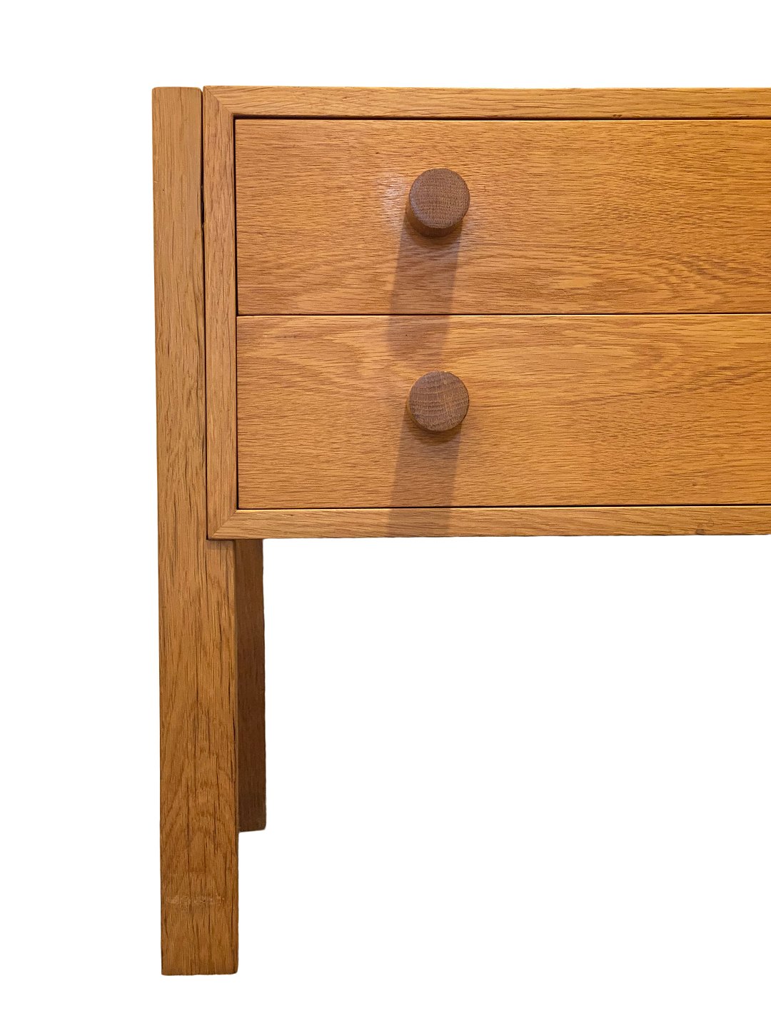Få et stykke dansk designhistorie med dette smukke entre-sæt bestående af et spejl og en lav kommode, begge i lys eg og fra 1960'erne. Dette sæt repræsenterer den karakteristiske stil og æstetik, der var typisk for dansk møbeldesign på det tidspunkt.