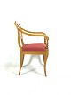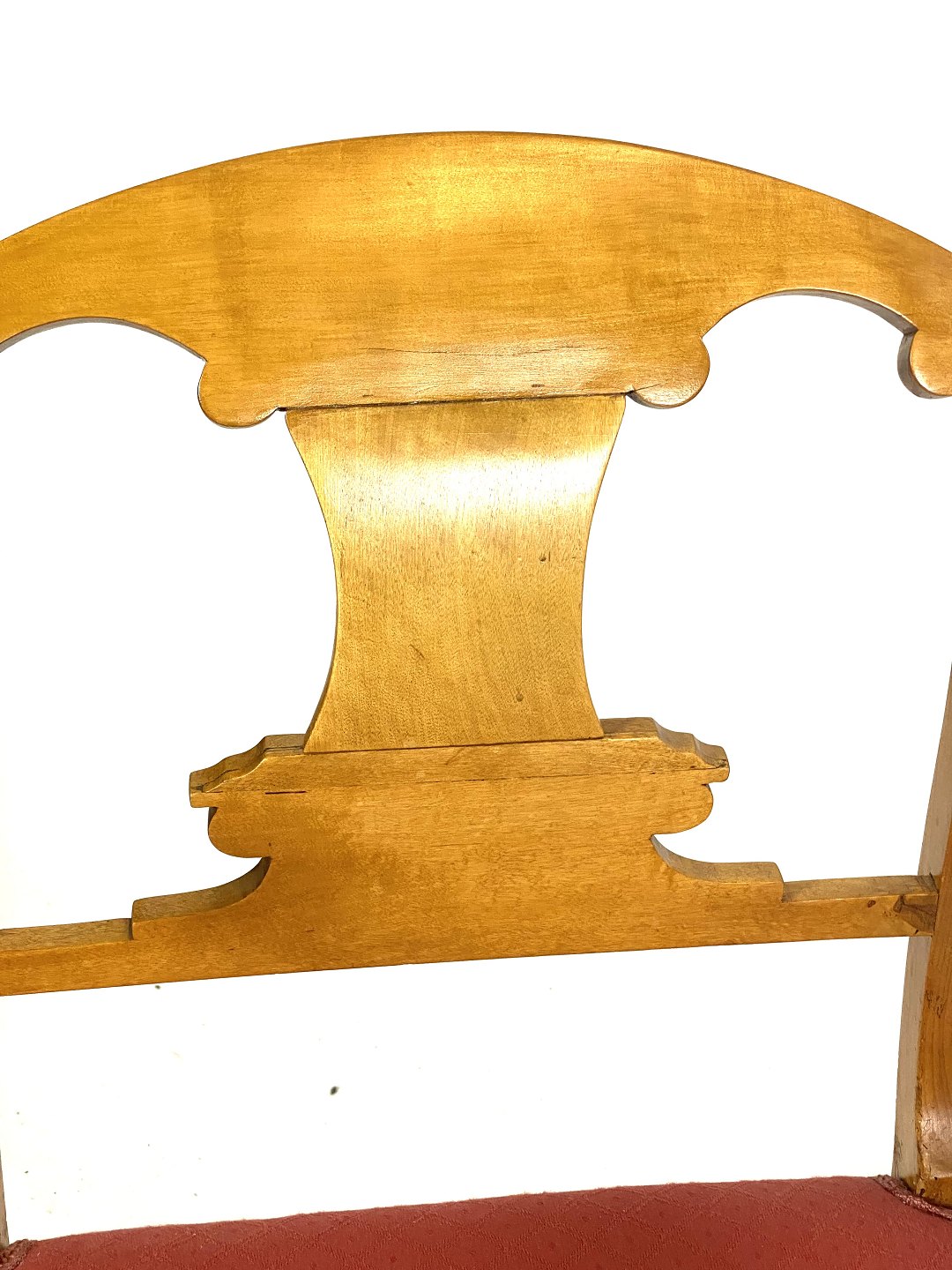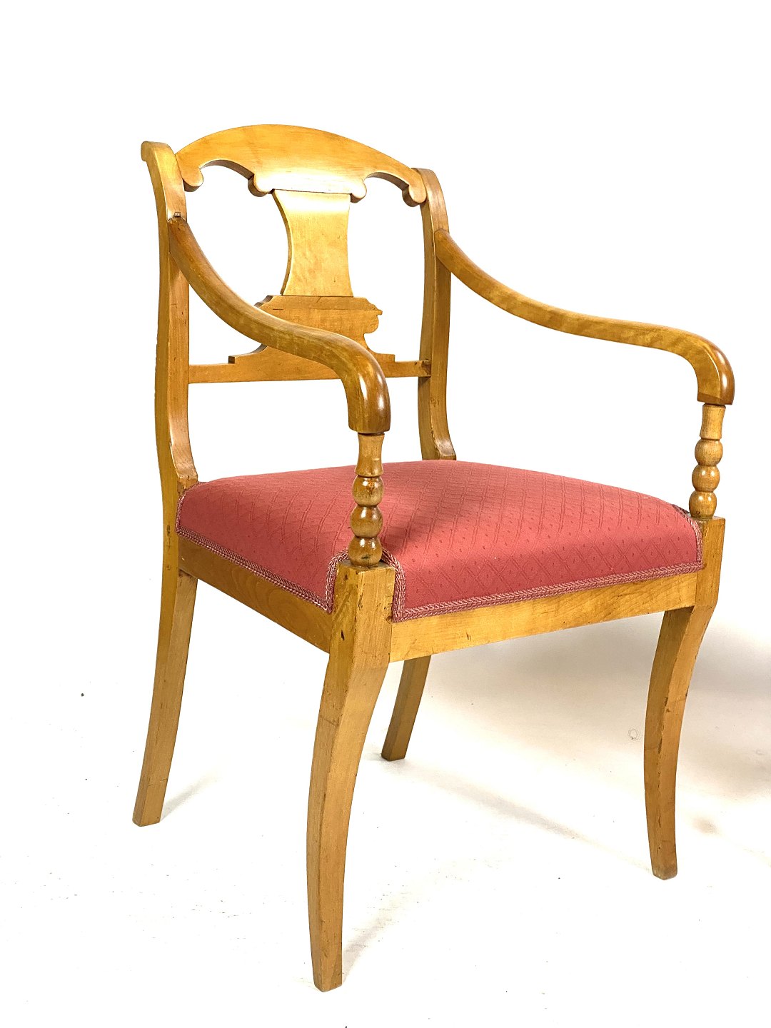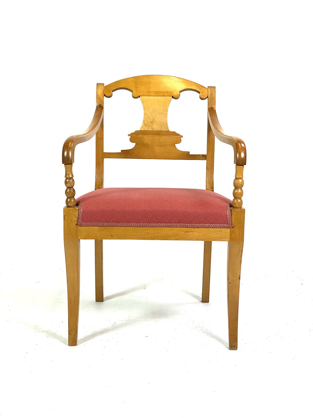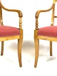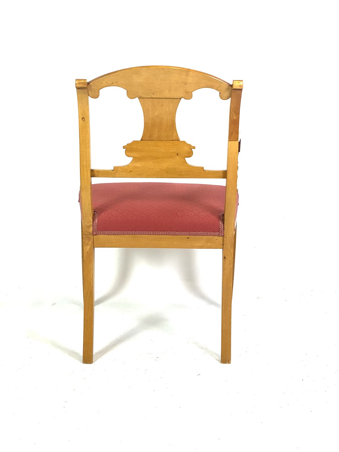 Disse stole, skabt i senempire-stil, er fremstillet af lyst træ, der giver dem en let og elegant fremtoning. Den røde polstring tilfører en varm og indbydende kontrast, samtidig med at den skaber en luksuriøs følelse af komfort og stil.