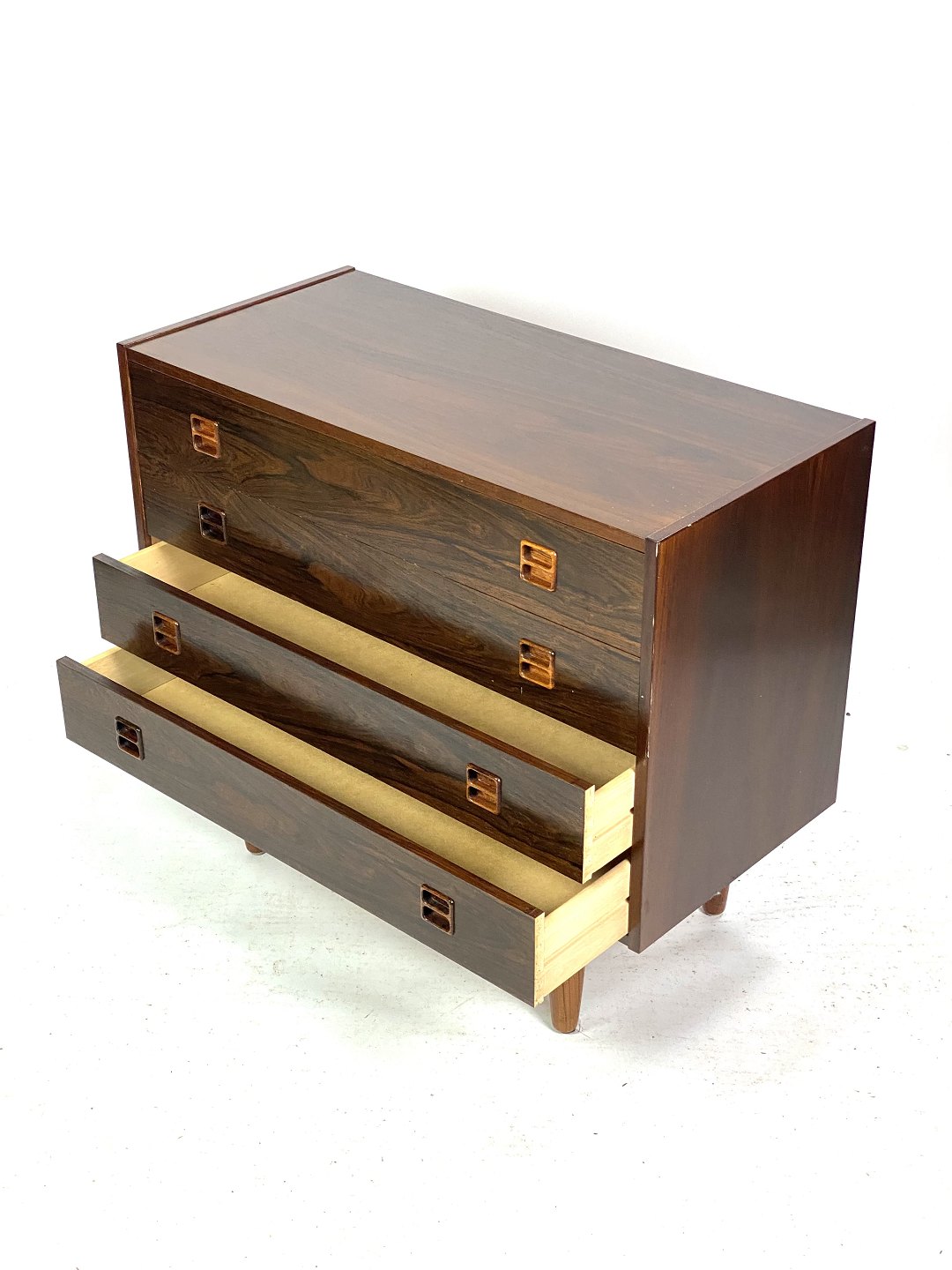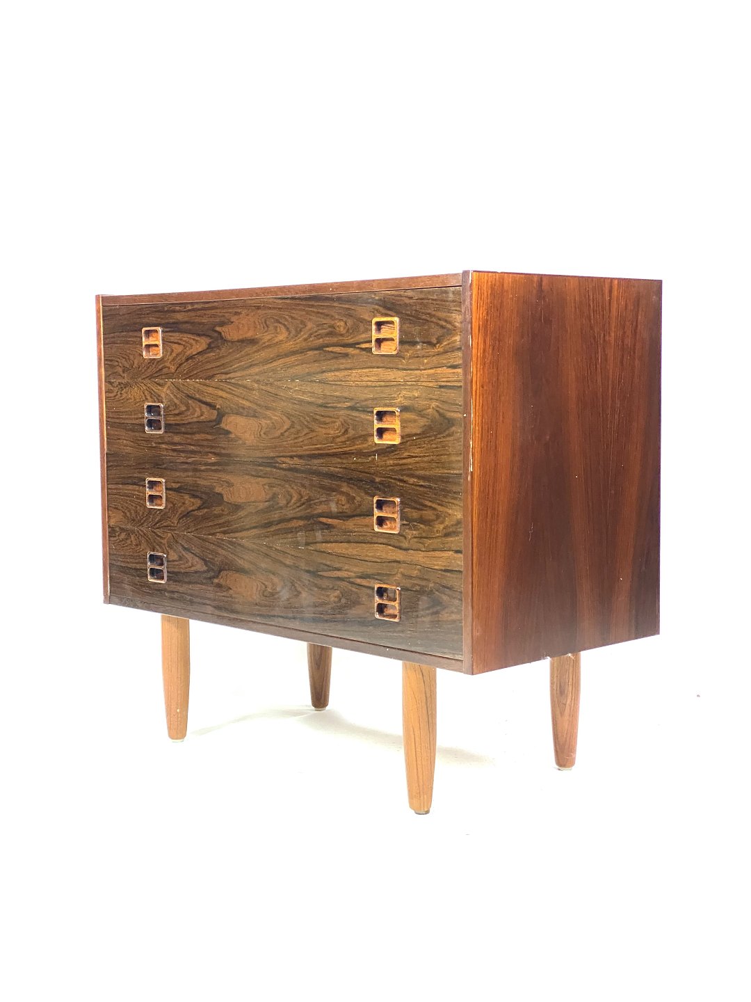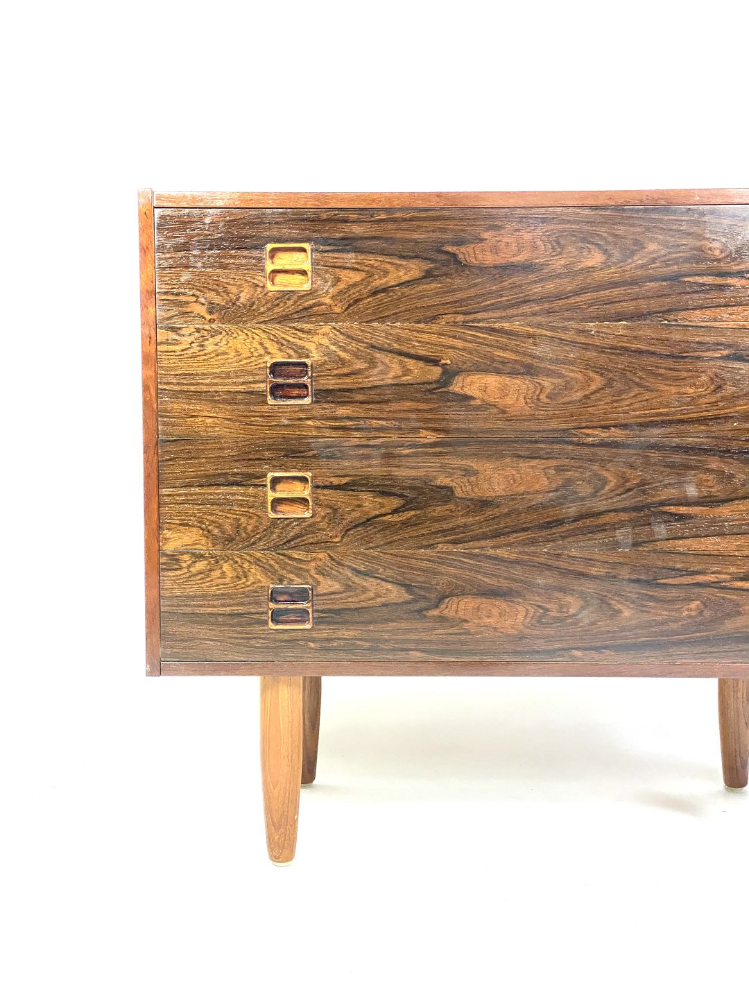 Denne kommode i palisander, designet af danske møbelarkitekter i 1960'erne, er et smukt eksempel på æstetikken fra den tid. Palisandertræet giver kommoden en varm og naturlig glød, mens dens tidløse design bringer et strejf af elegance til ethvert rum. I flot brugt stand viser kommoden stadig sin skønhed og funktionalitet efter årtier med brug. Med sine rene linjer og smukke træmønster er denne kommode en klassiker, der vil tilføre charme og karakter til enhver indretning.
