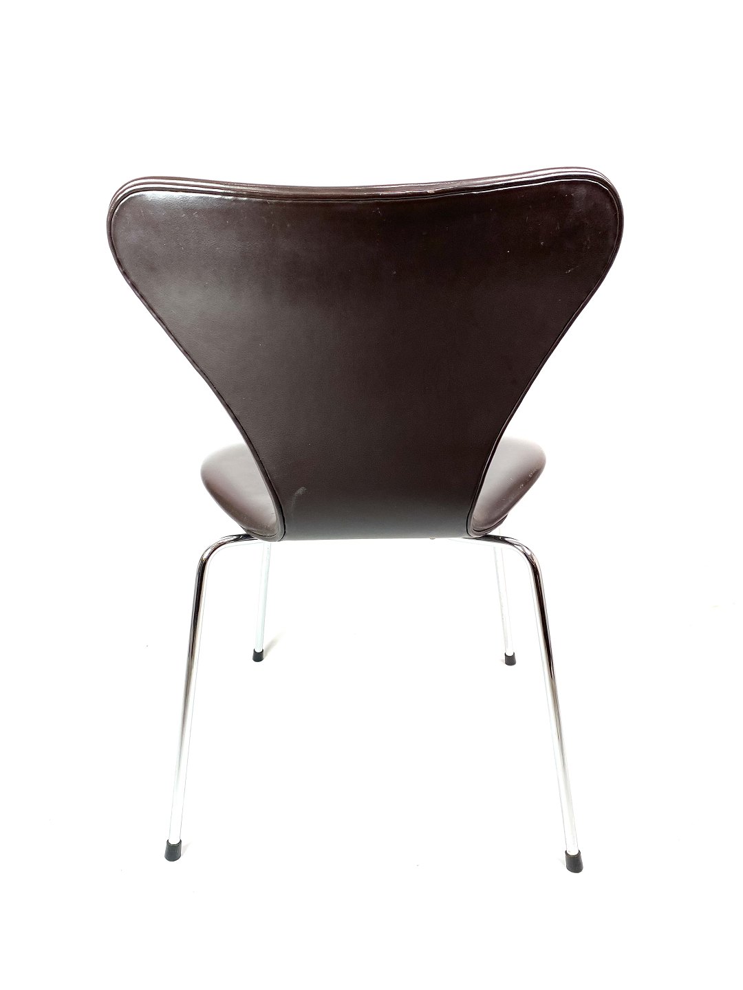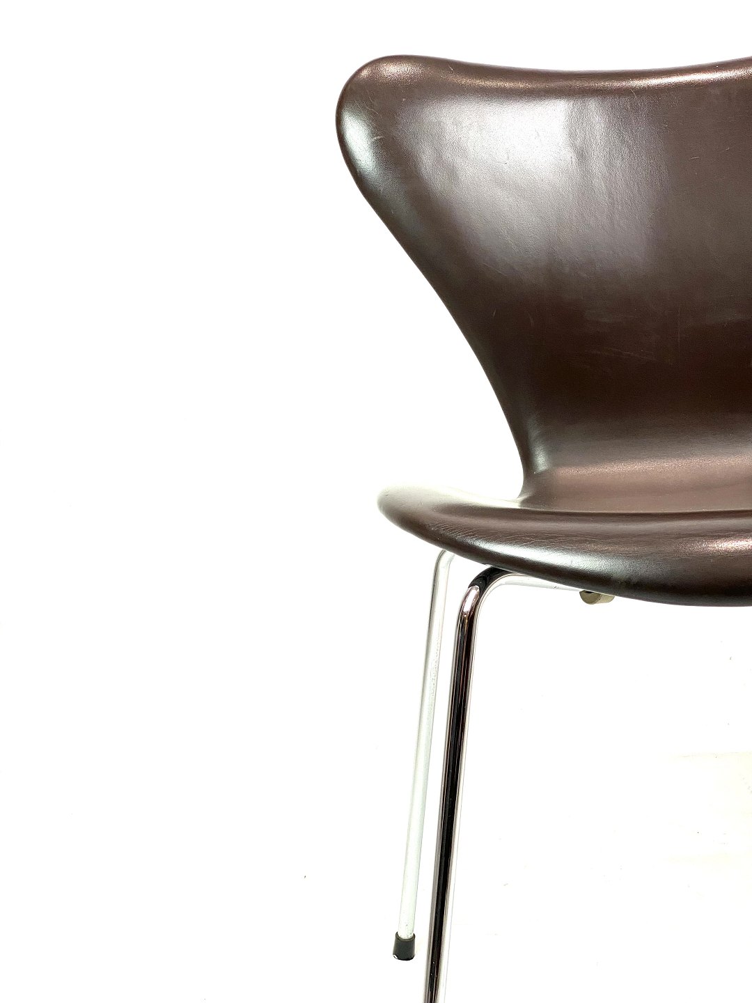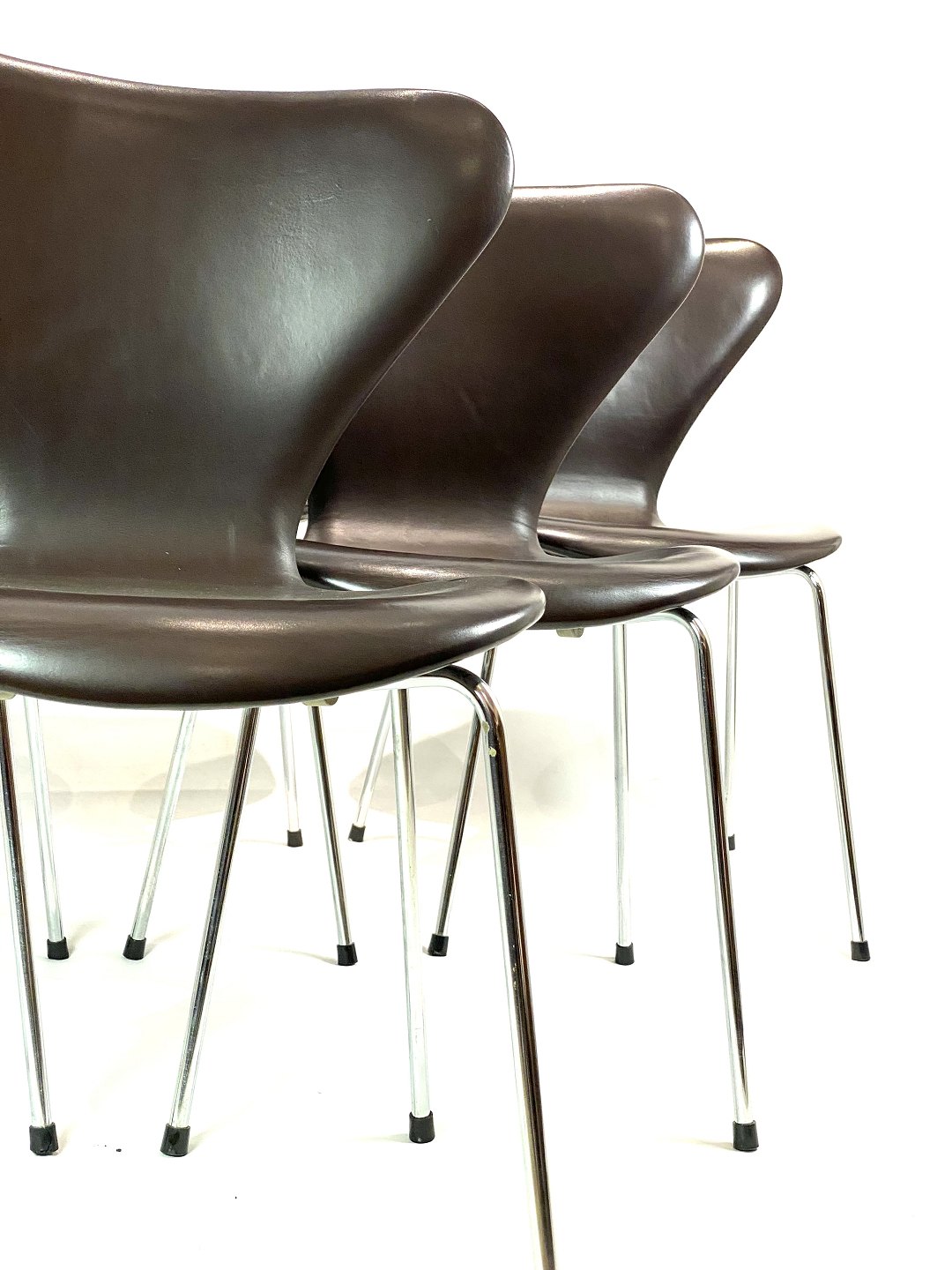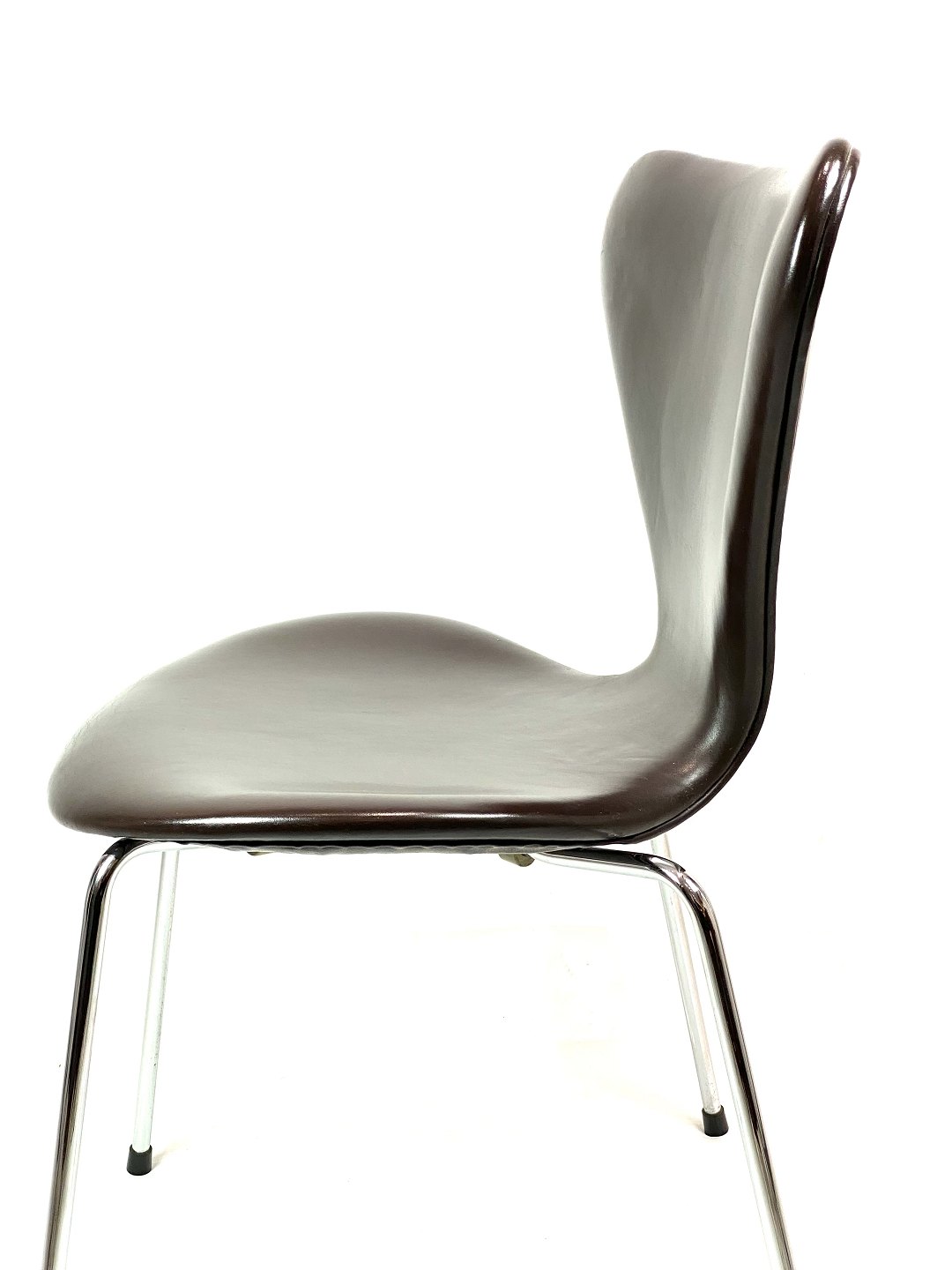 SolgtEt sæt af 6 Syver stole, model 3107, designet af Arne Jacobsen og fremstillet af Fritz Hansen. Stolene er polstret i mørkebrunt elegance læder.