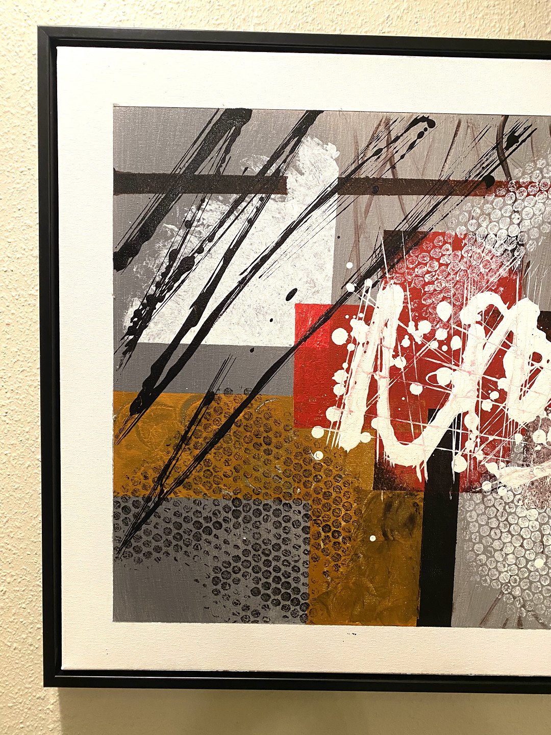 Moderne maleri på lærred med abstrakt motiv signeret O.J. 2021. Maleriet er med sort ramme.