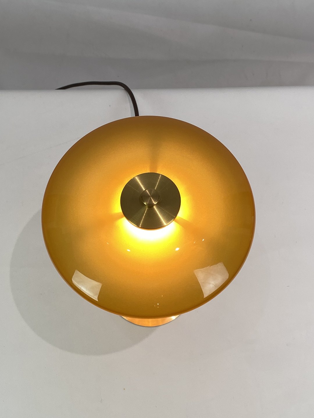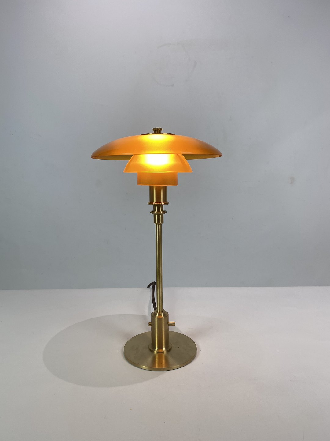 Materiale: Skærme: Mundblæst ravfarvet trelagsglas. Blankt på ydersiden, sandblæst på indersiden. Topplade, fod og stander: Messing, børstet og ubehandlet. Den ubehandlede messing vil ændre sig over tid og udvikle patina. Ledningslængde: 2,8 m. Gennemgående afbryder. Ledning: Brun tekstilledning.