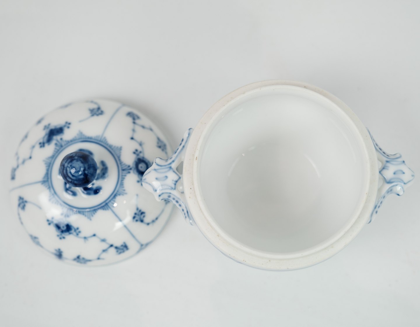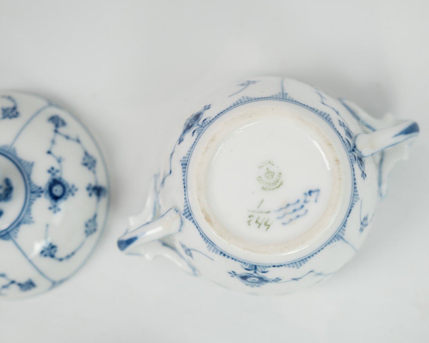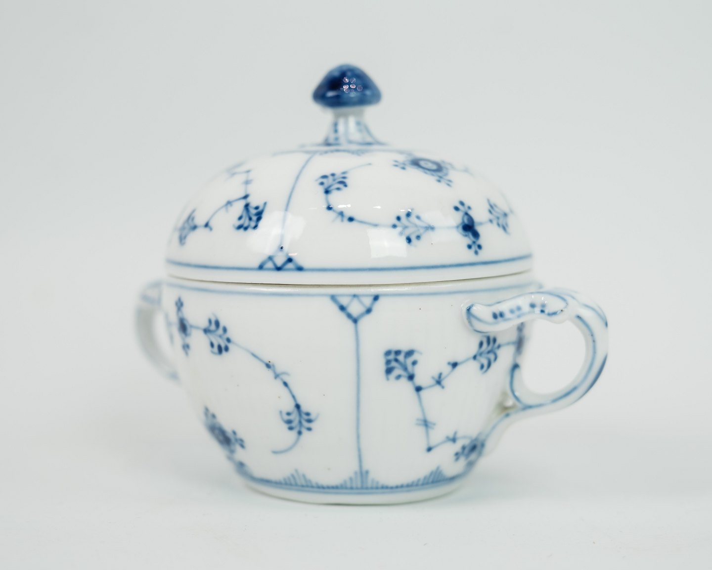 Royal Copenhagen, kgl. musselmalet riflet sukkerskål af porcelæn med låg nr. 244. 5000m2 udstilling