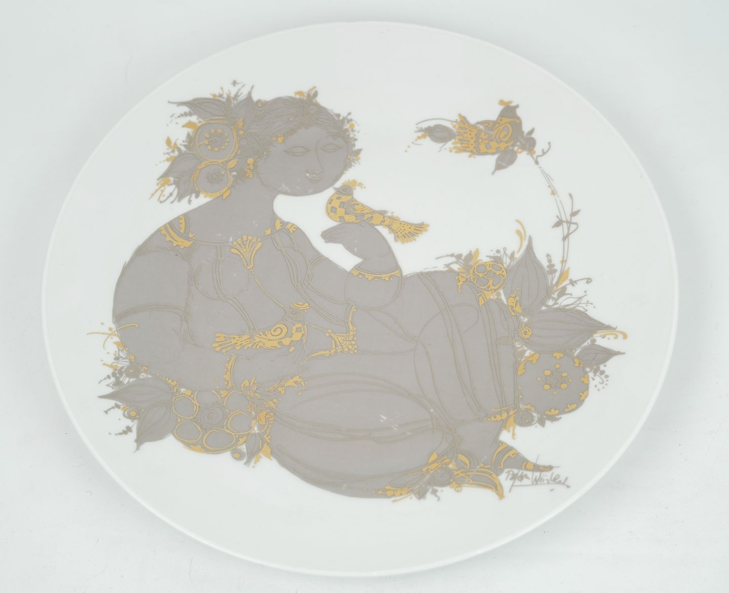 Platte med motiv af dame i guld og grå farver i porcelæn designet Bjørn Winnblad og produceret af rosenthal. Står i meget fin brugt stand.