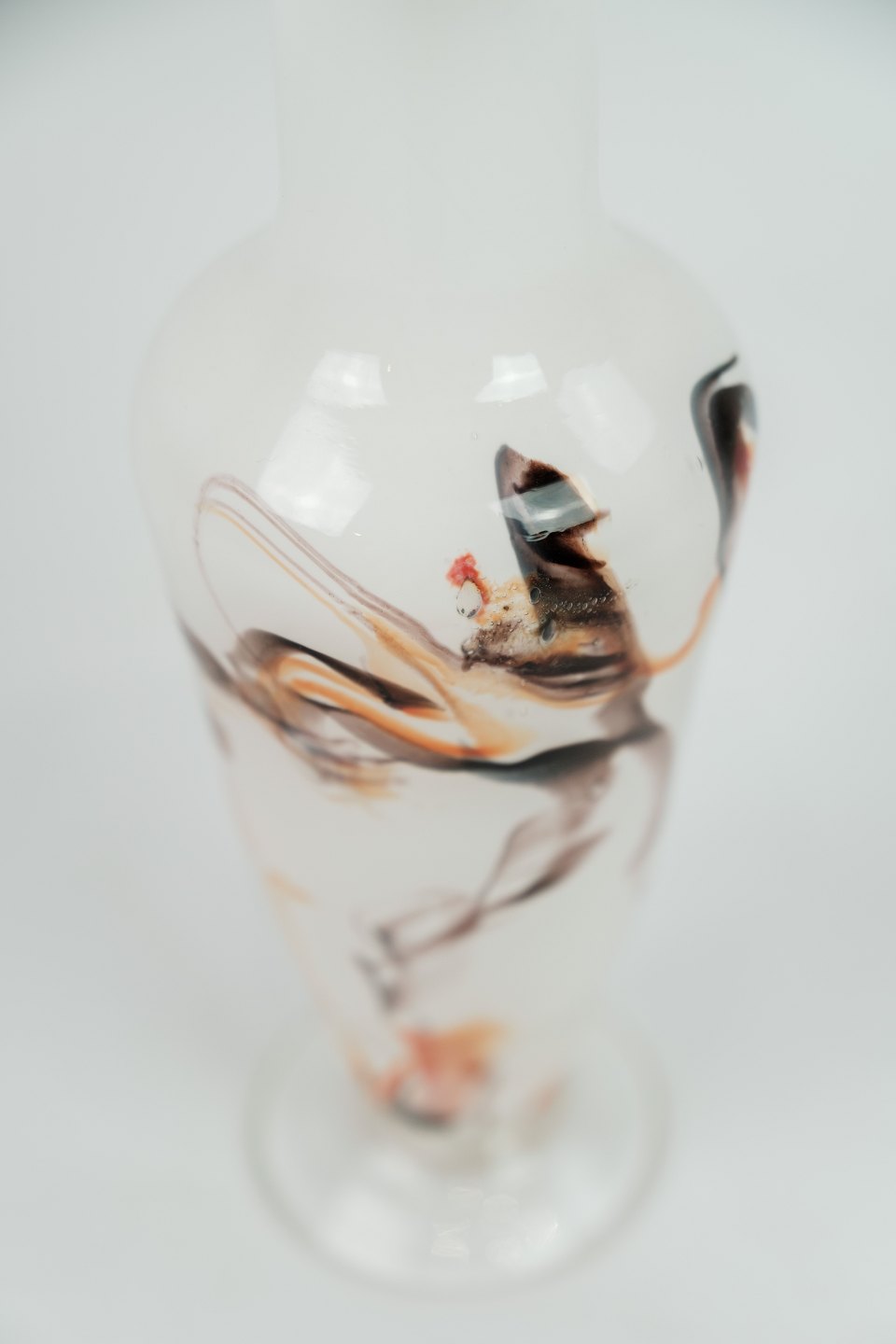 En mælke hvid vase med sammensætningen af gyldne farver fra omkring 1970'erne.