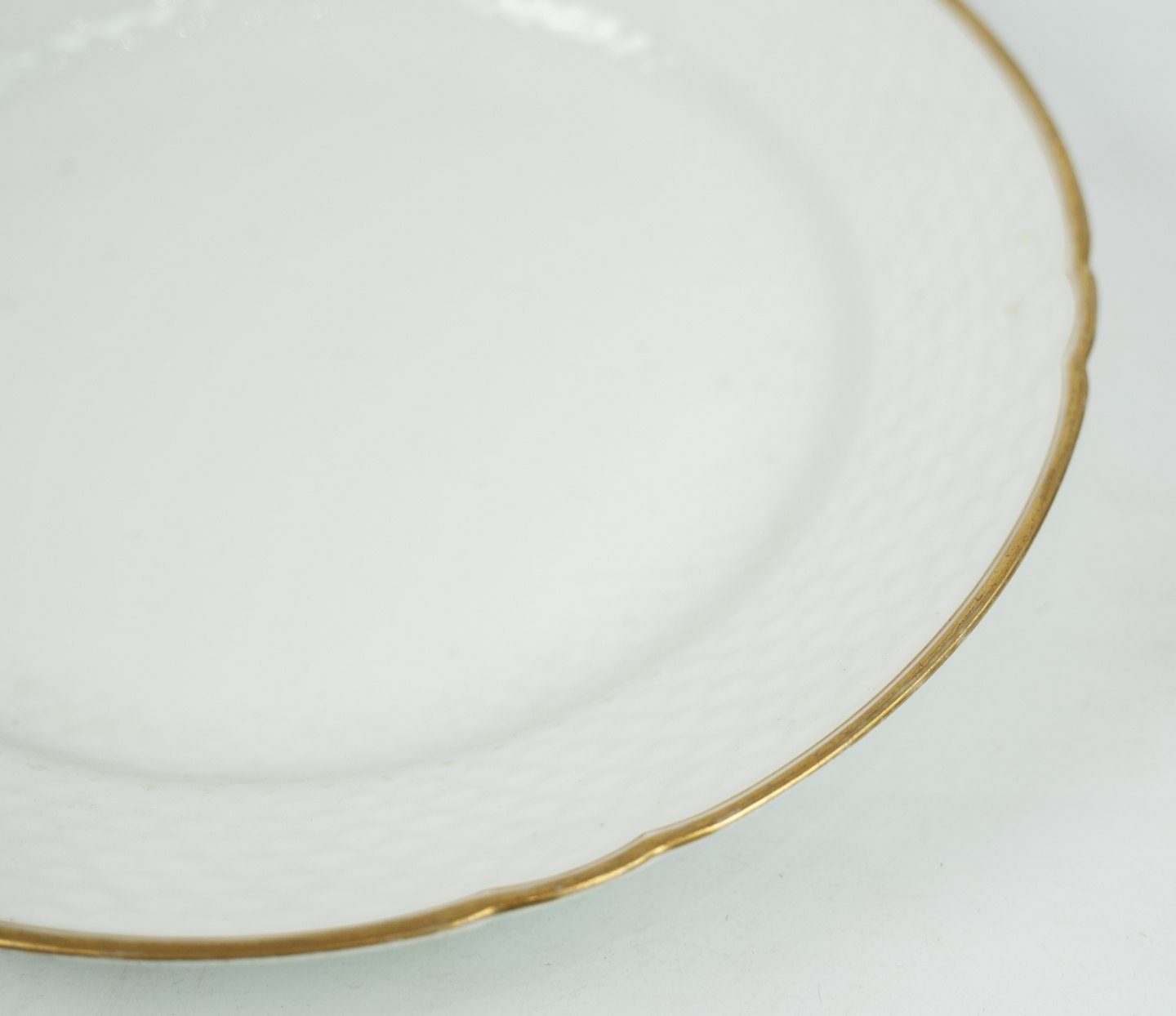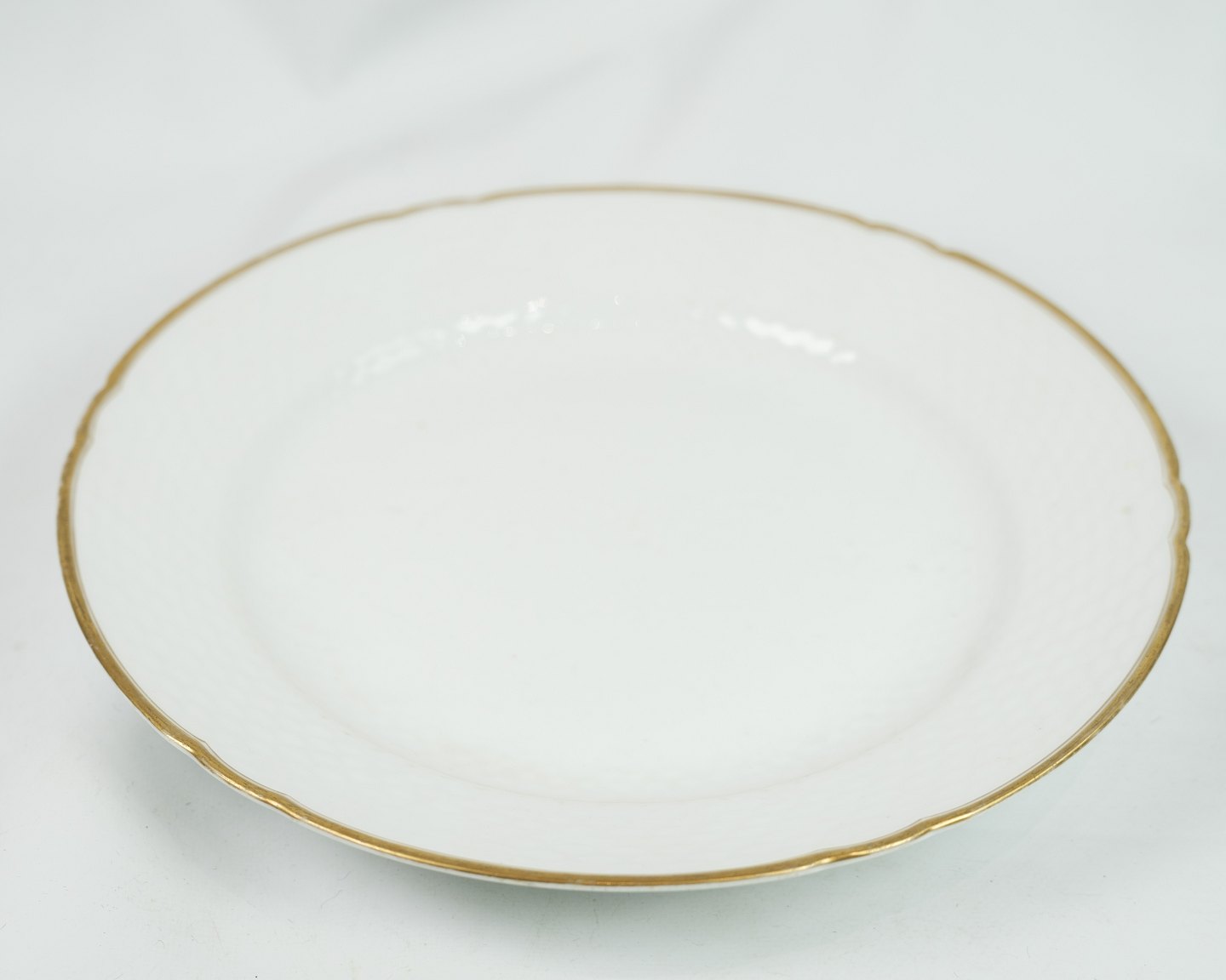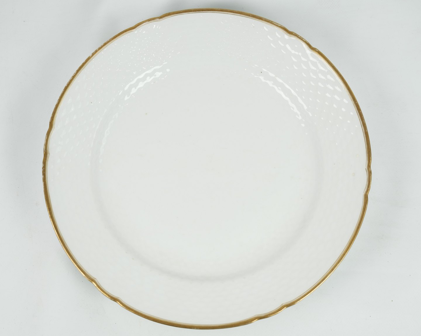 Et rundt fad i Bing & Grøndahl i mønstret Hartmann med en guldkant.