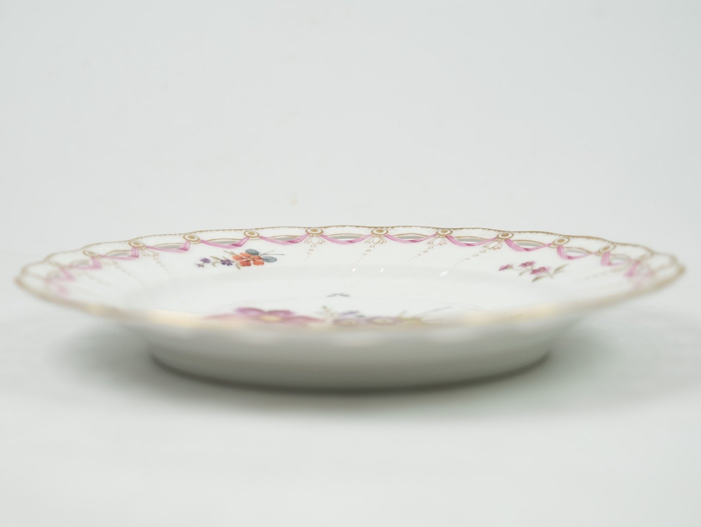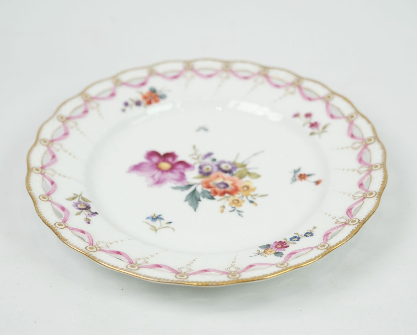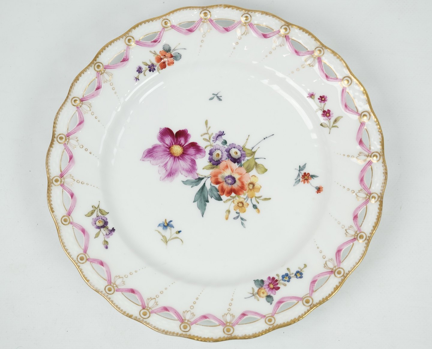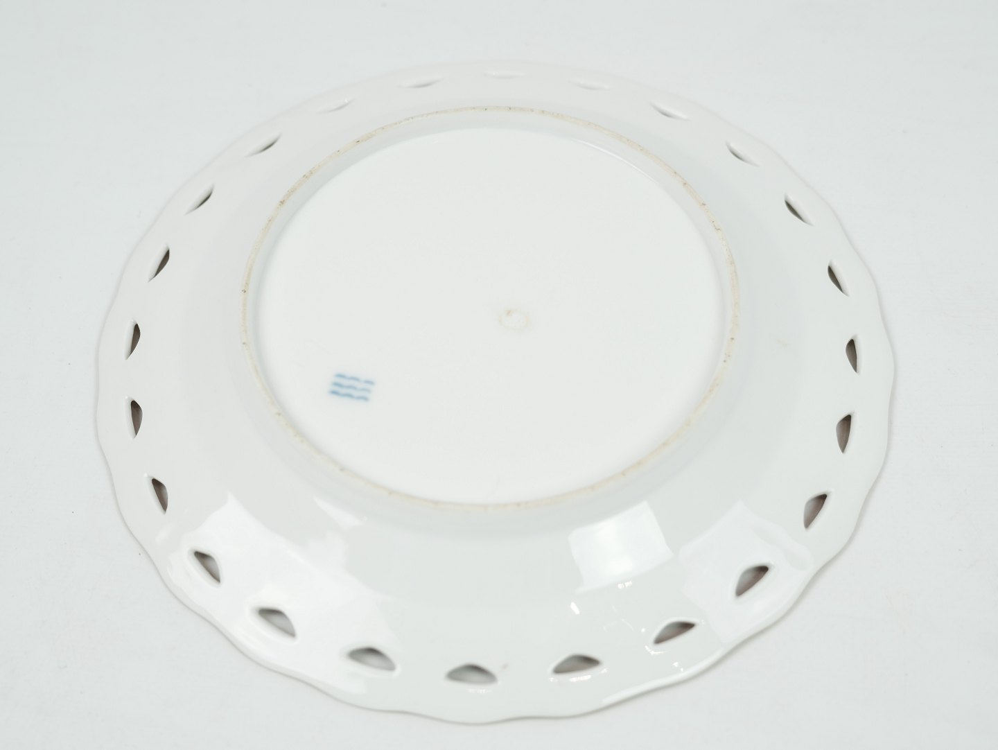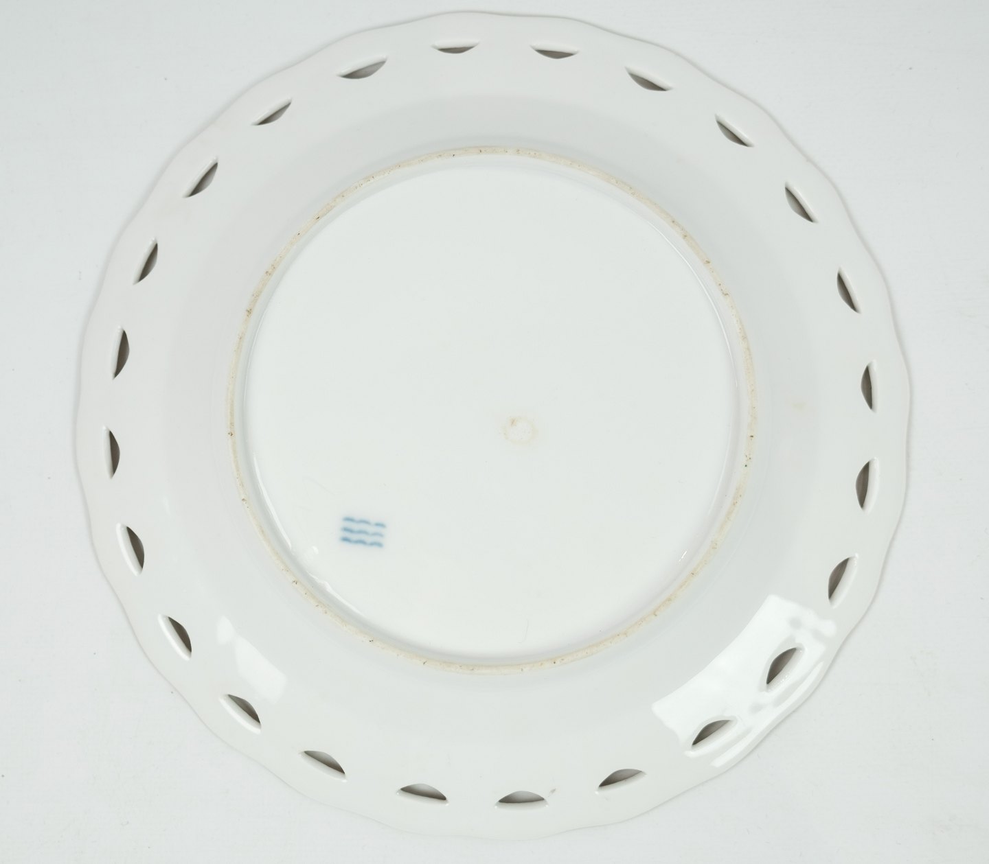 Antique royal plate pierced in patterned Saxon flower with 3 waves. The 3 waves indicate that it is one of the first the royal porcelain factory made in this pattern. Extremely rarely appears whole and without damage