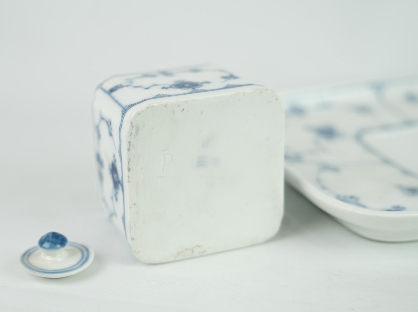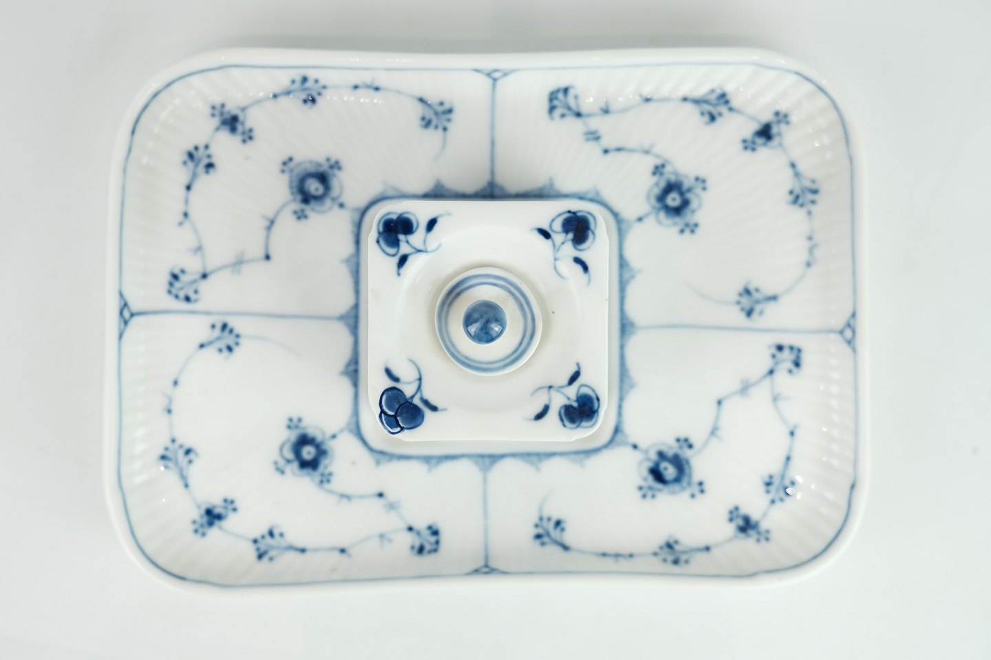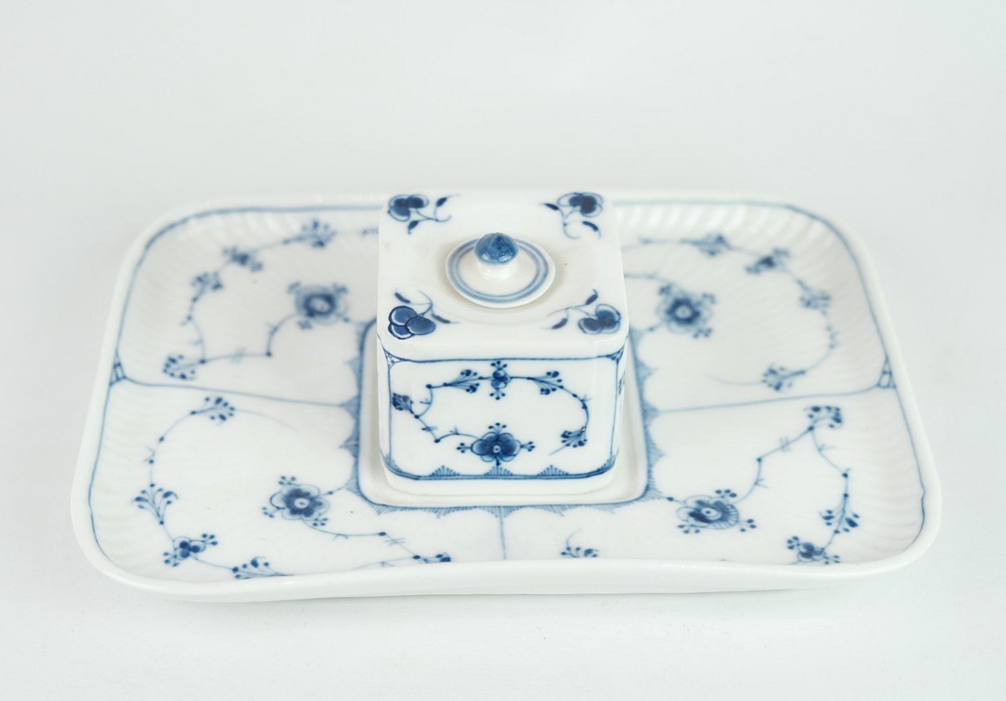 SolgtRoyal Copenhagen kongelig Musselmalet Riflet Bakke / skrivesæt med Blækhus og låg. Nr. 1/128