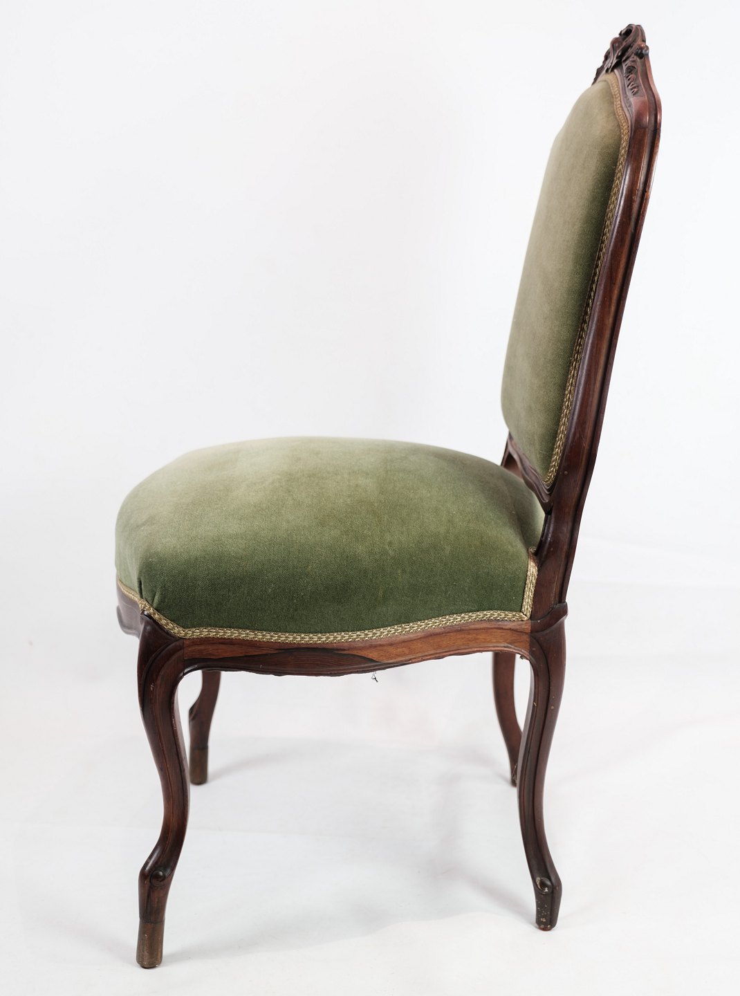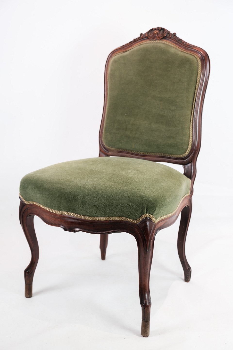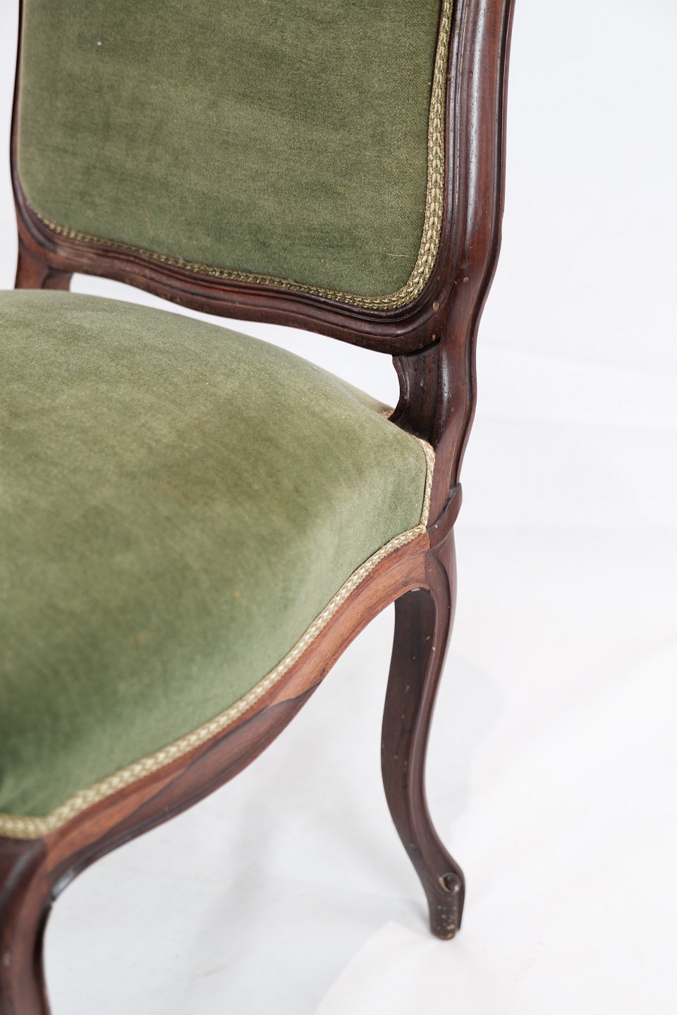 SoldA pair of salon chairs new rococo chairs with green velor fabric in mahogany from around the year 1860s. Both are in fine used condition.