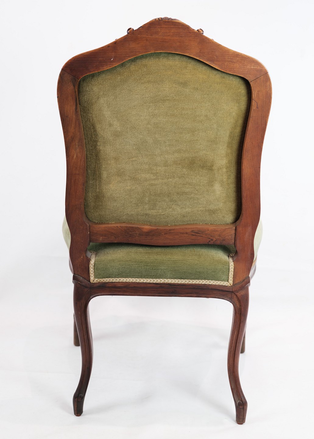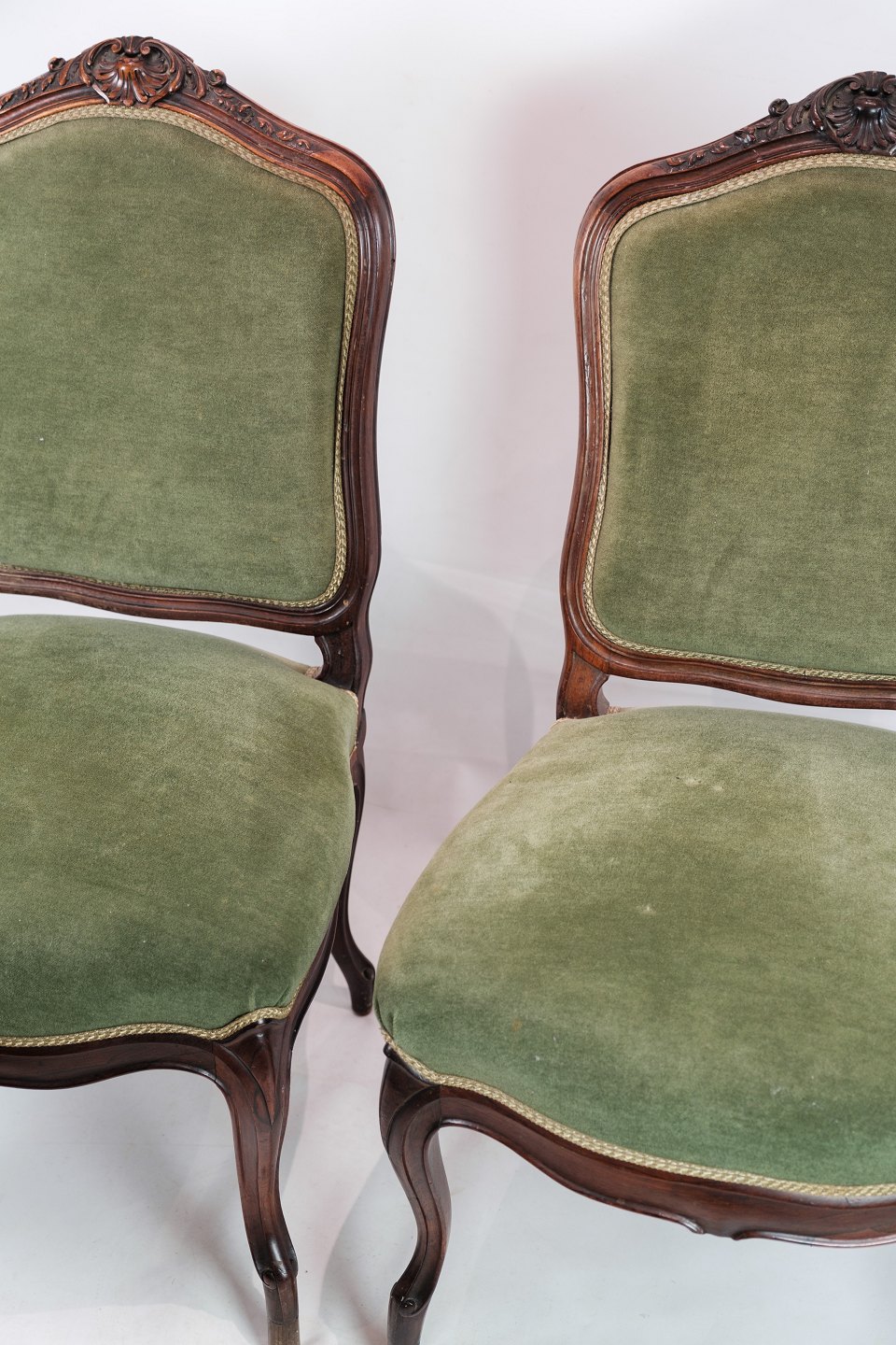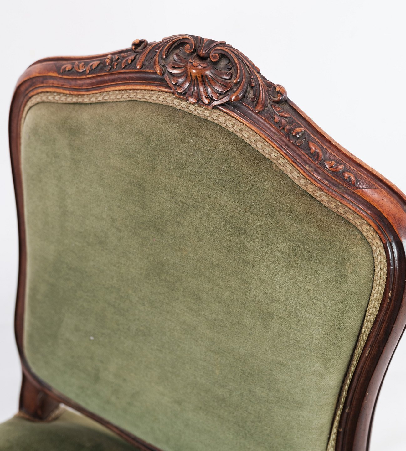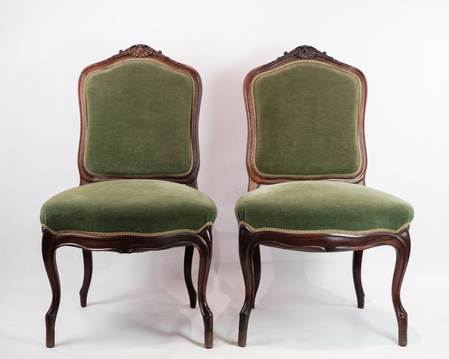 SoldA pair of salon chairs new rococo chairs with green velor fabric in mahogany from around the year 1860s. Both are in fine used condition.