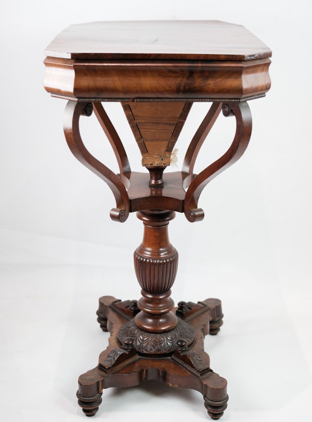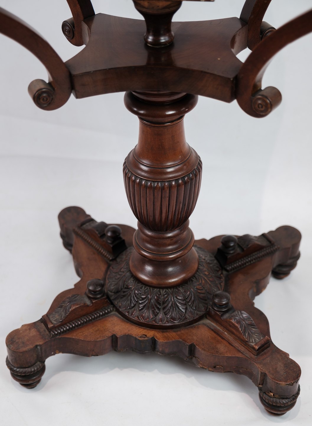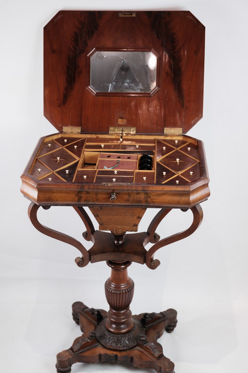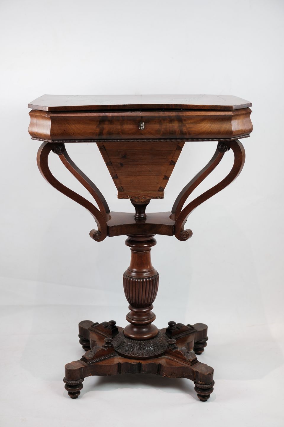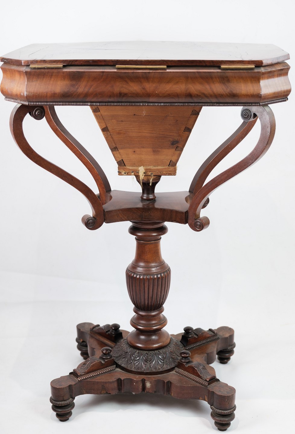 An antique mahogany sewing table on a pillar from around the year 1840s.