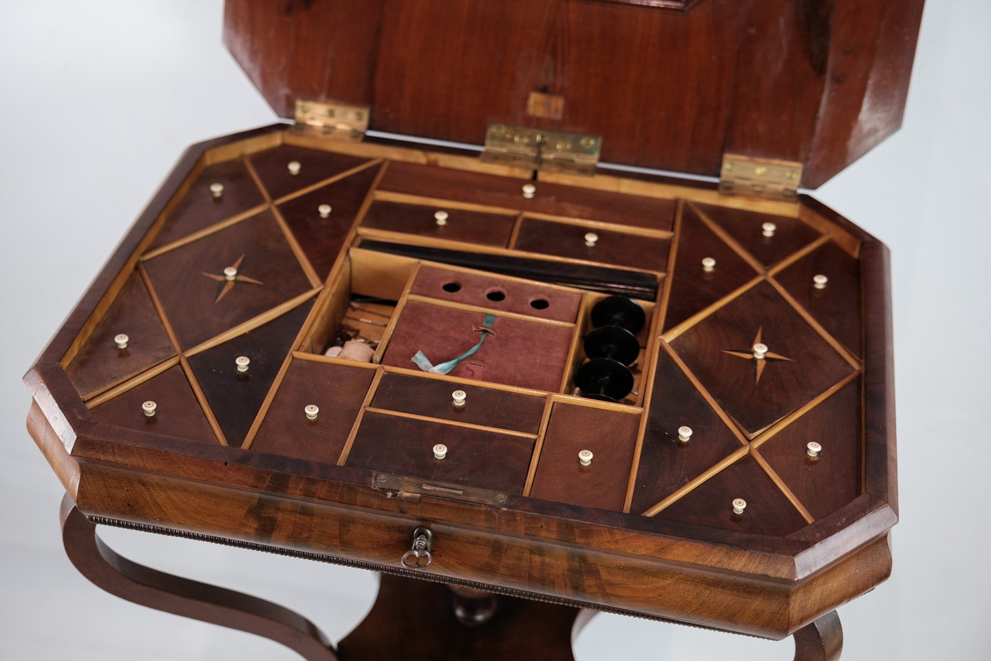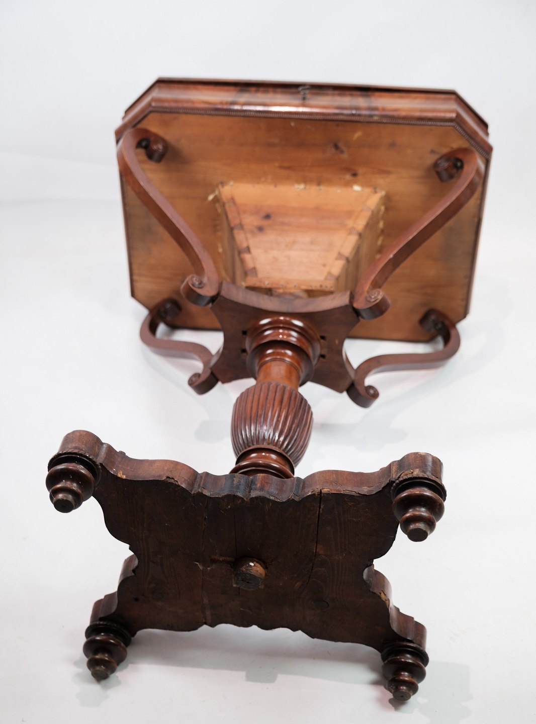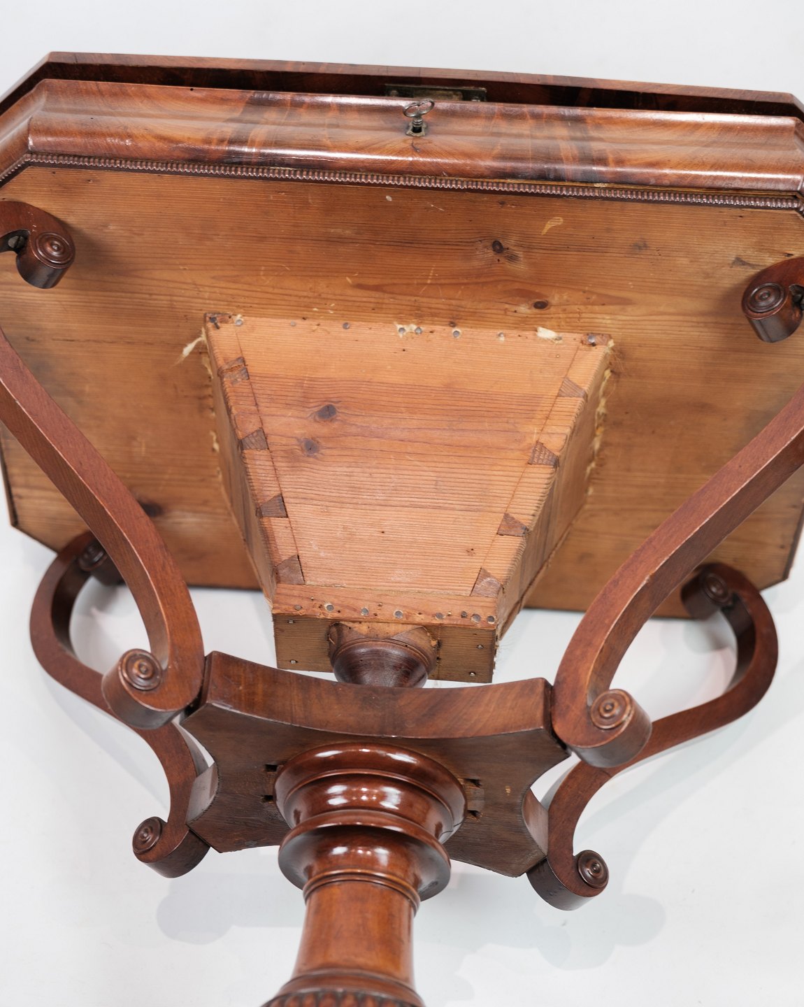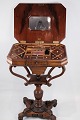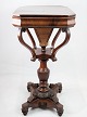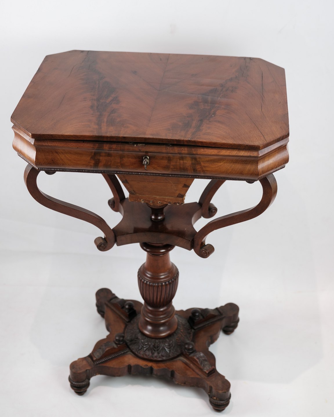 An antique mahogany sewing table on a pillar from around the year 1840s.
