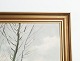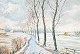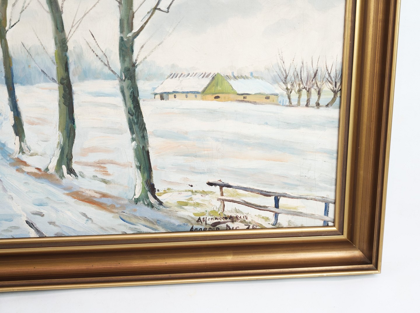 Oil painting on canvas with motif of nature with snow and farmhouses from around the year 1930s.
