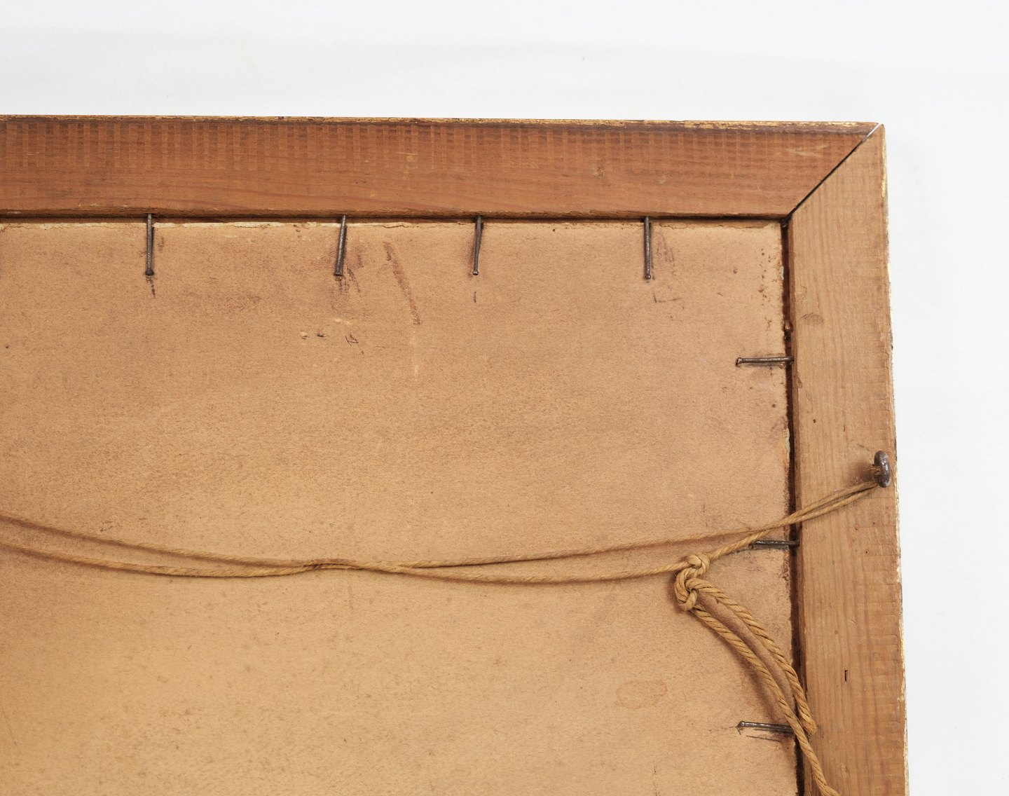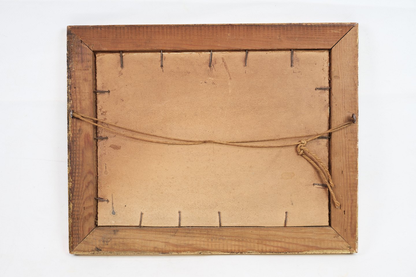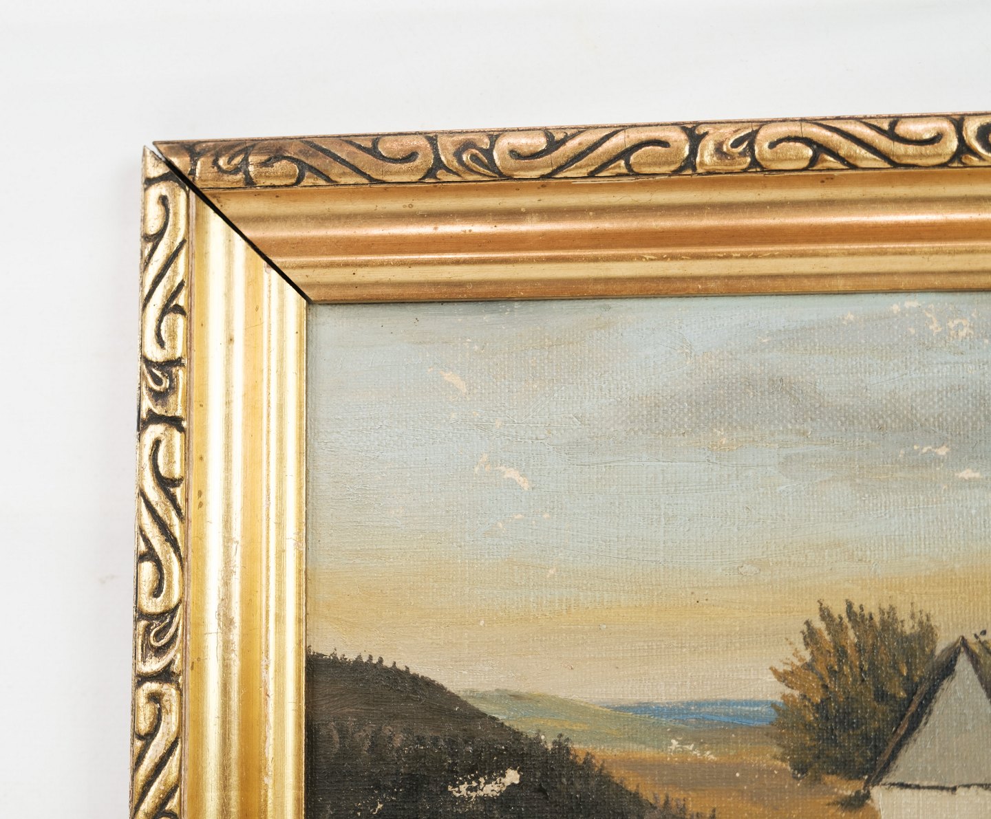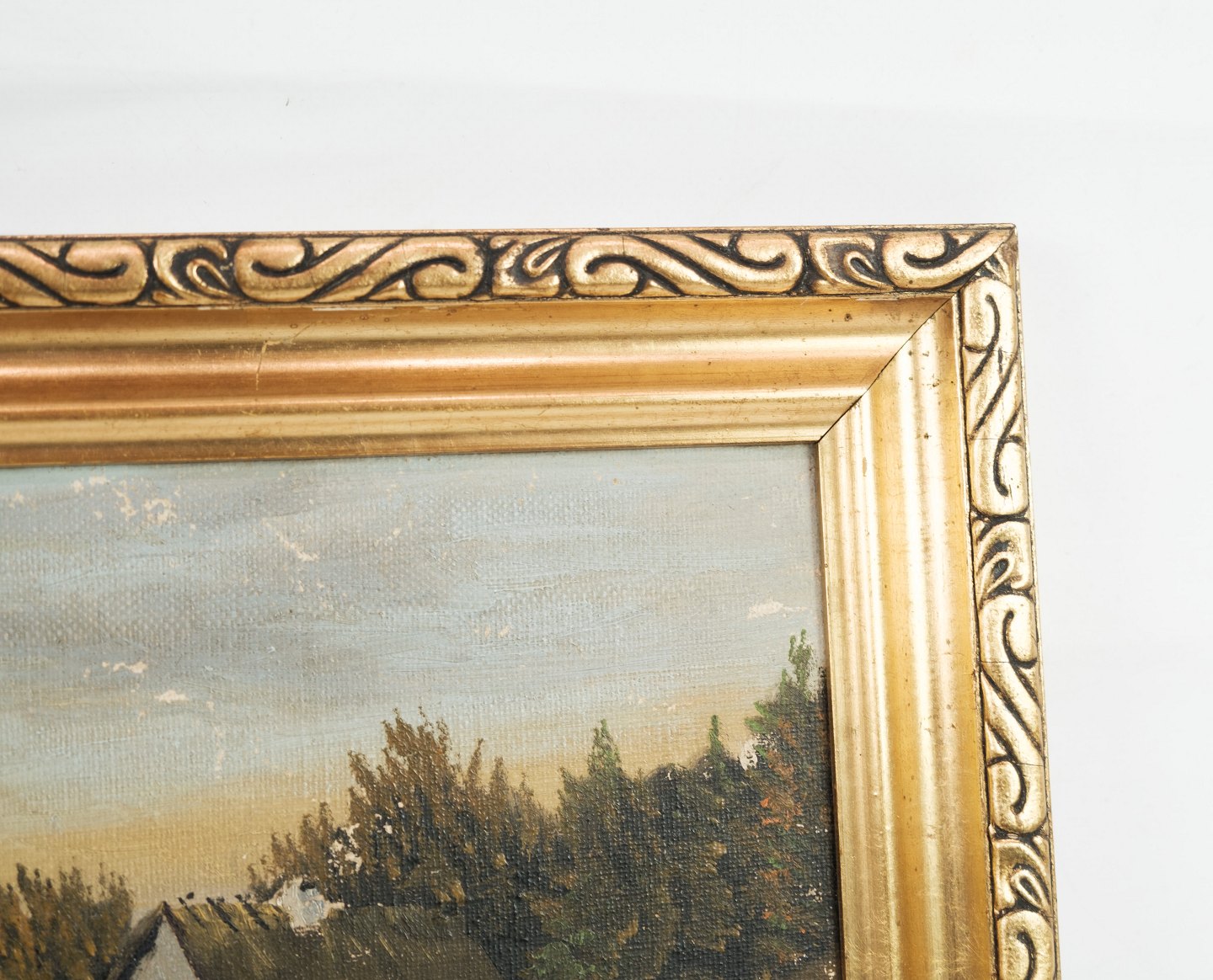 Oil painting of a small farmhouse and gravel road painted on wooden board with gold frame from around the 1940s. In very good used condition.
