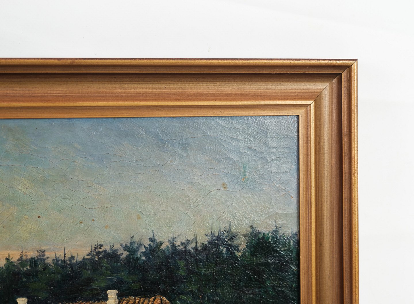 Olie maleri med bonde hus og guld ramme fra omkring 1926. 5000m2 udstilling