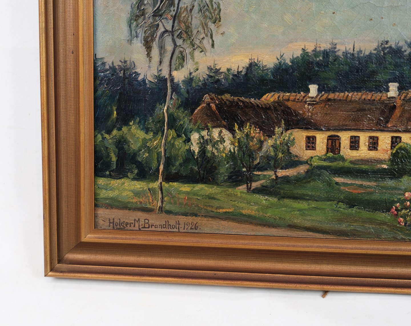 Oliemaleri med bondehus og guldramme fra omkring 1926. Signeret Holger M. Brandholt. Står i meget pæn stand.