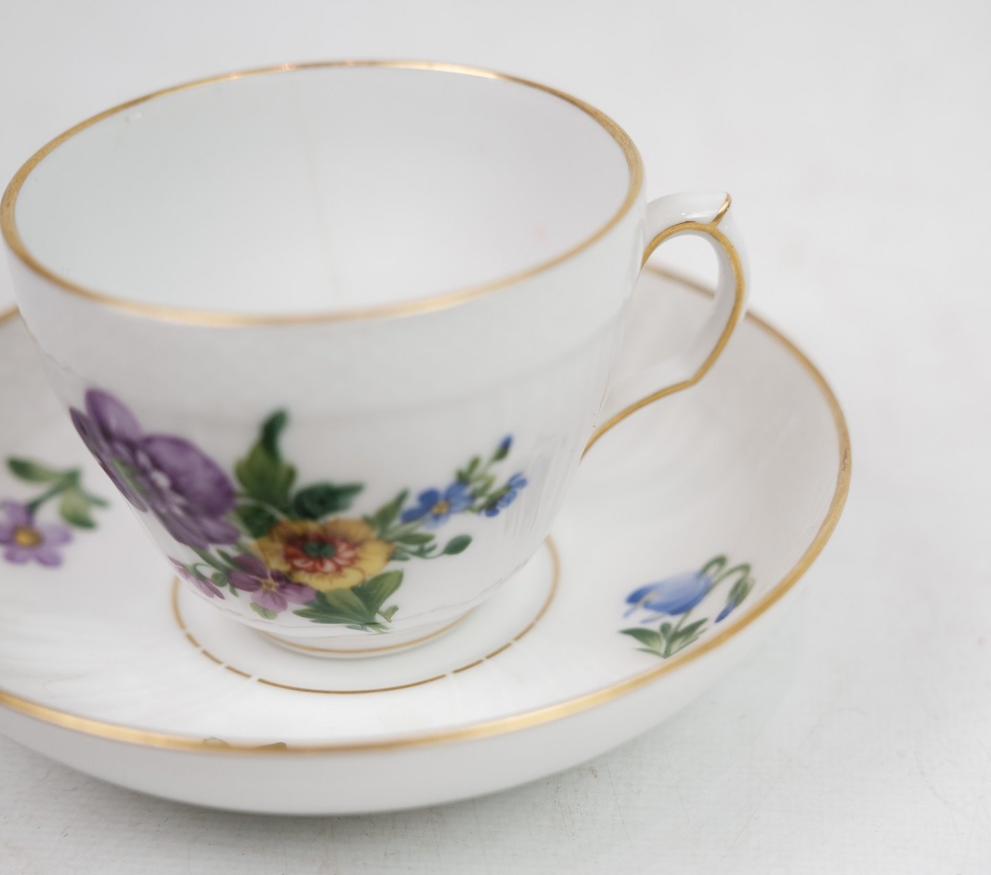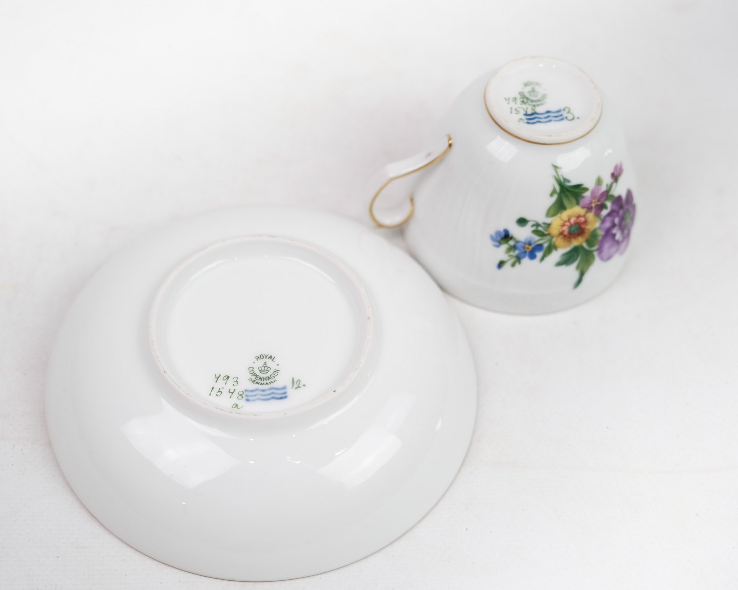 Kaffekop af Royal Copenhagen med underkop i mønstret let saksisk blomst nr. 493 / 1549. 5000m2 udstilling