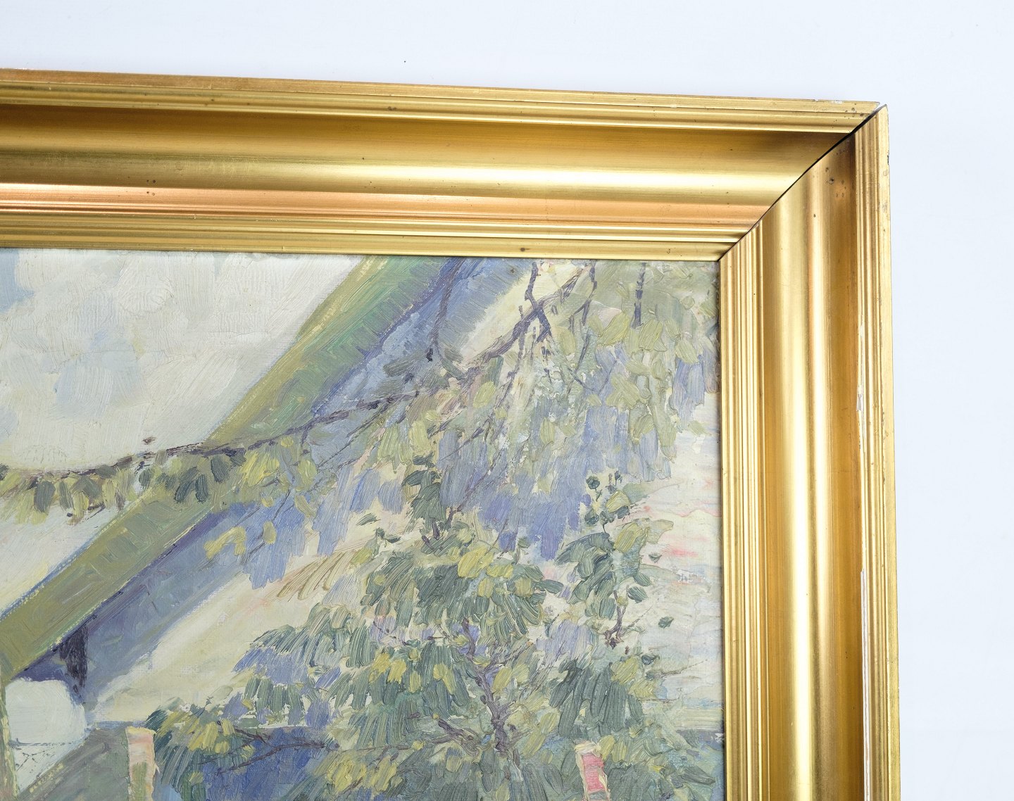 SolgtOliemaleri på lærredet med motiv af hønsegård og marker malet af Johan Jacobsen (1883-1953) fra omkring 1940'erne. Står i meget fin brugt stand med original forgyldt ramme.