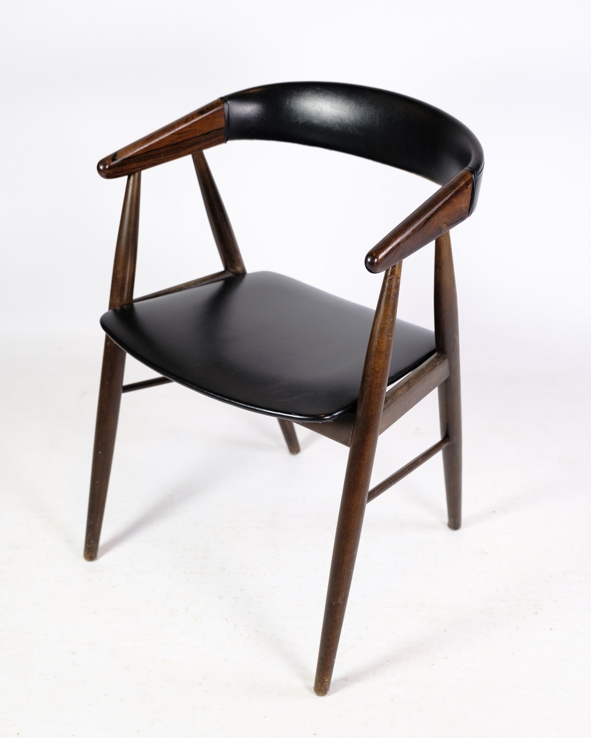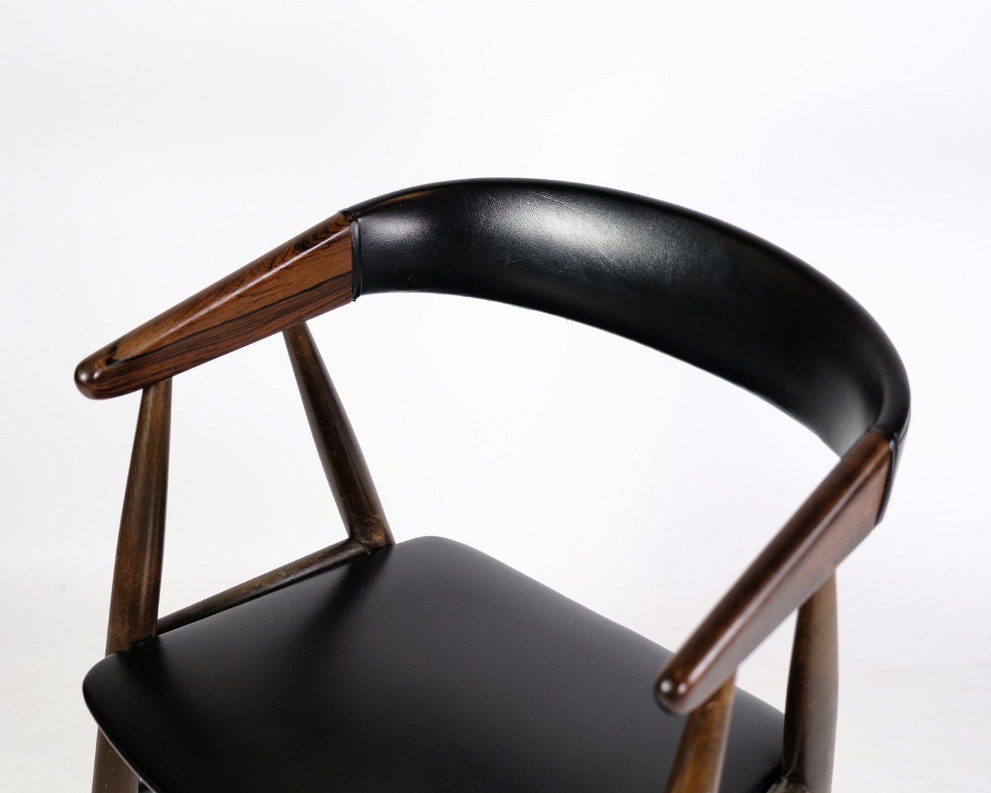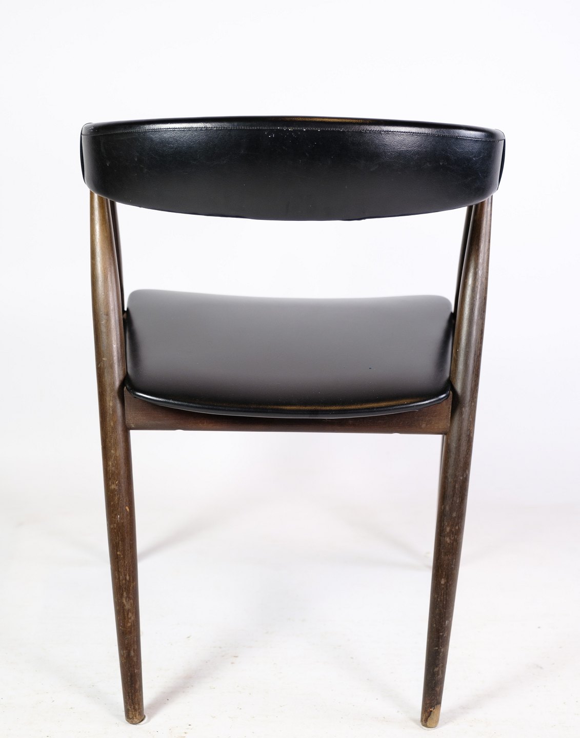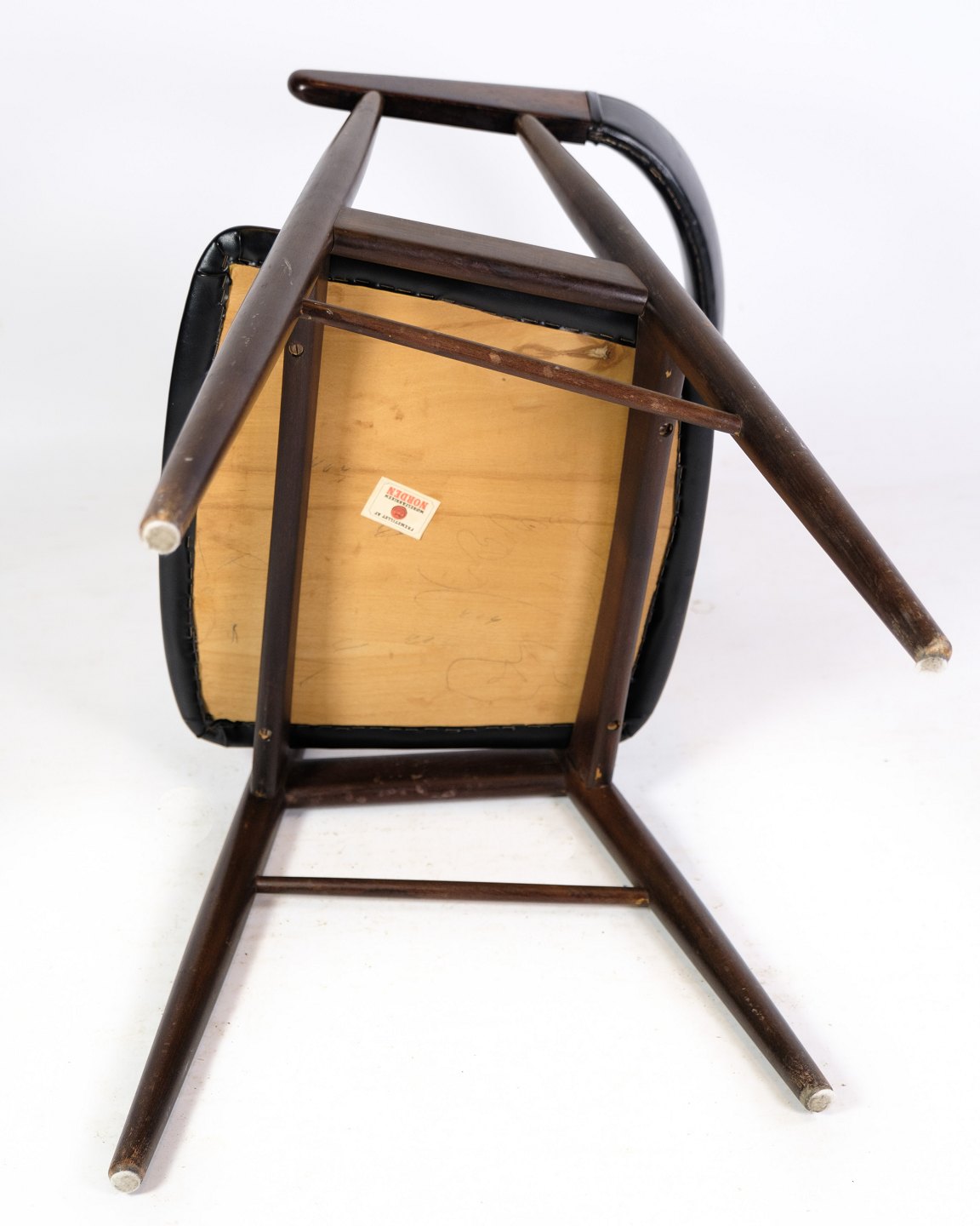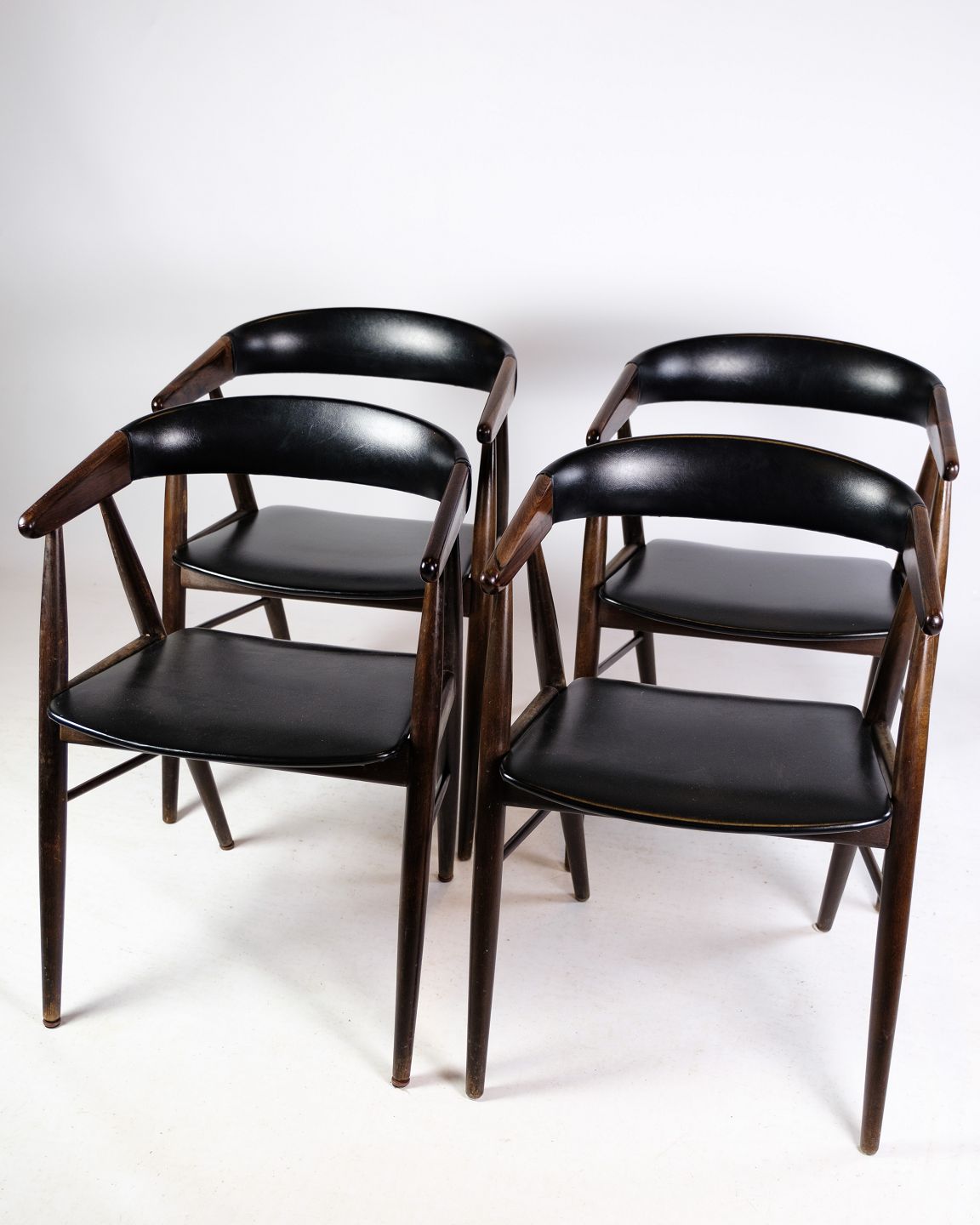 SolgtSæt af fire stole i palisander i sort læder tegnet af Aksel Bender og Ejnar Larsen formgivet i 1960'erne. De står alle i meget god vintage stand. Sælges kun som et sæt på fire