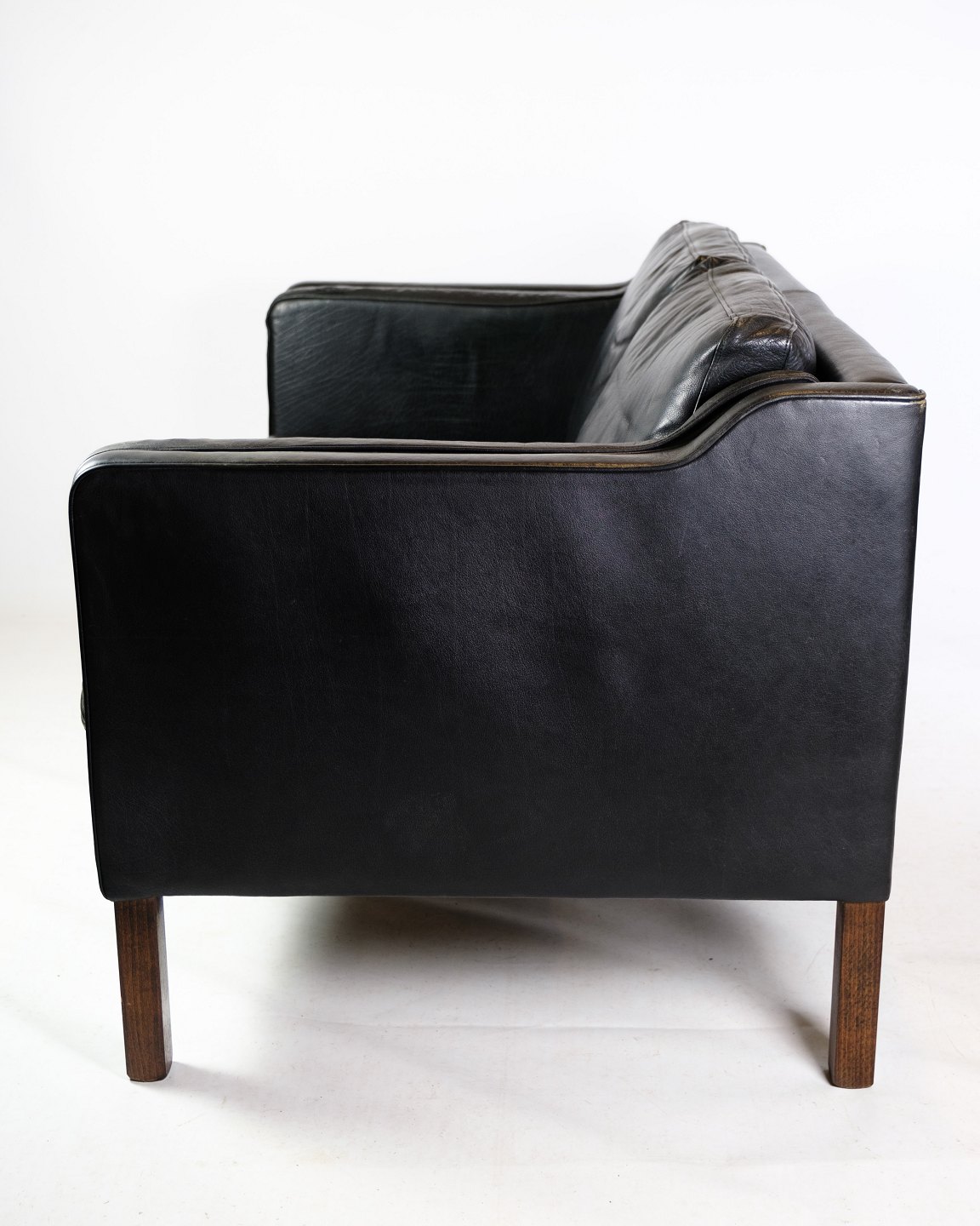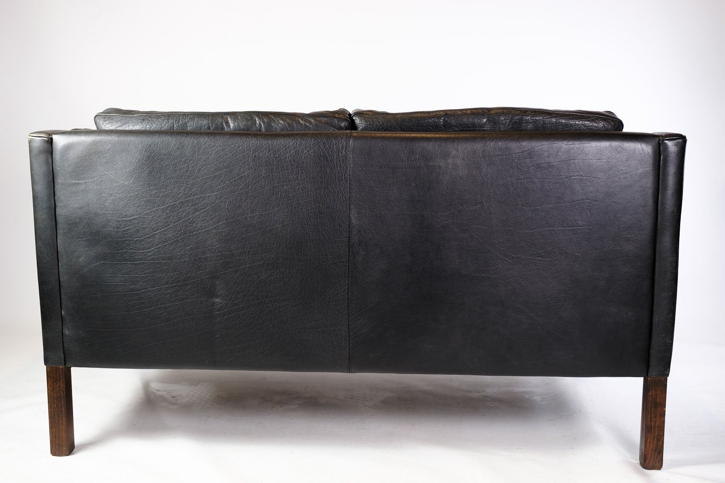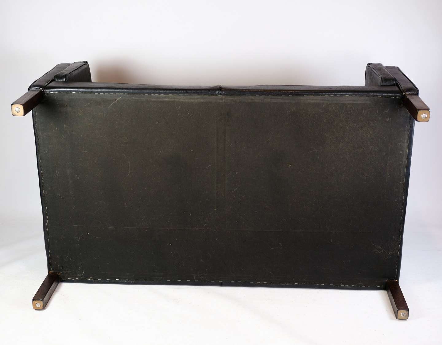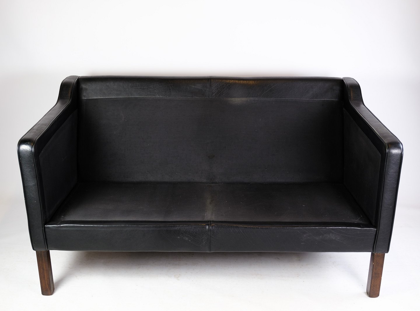 A two-seater sofa upholstered in black leather made by Stouby Møbelfabrik in the 1960s.