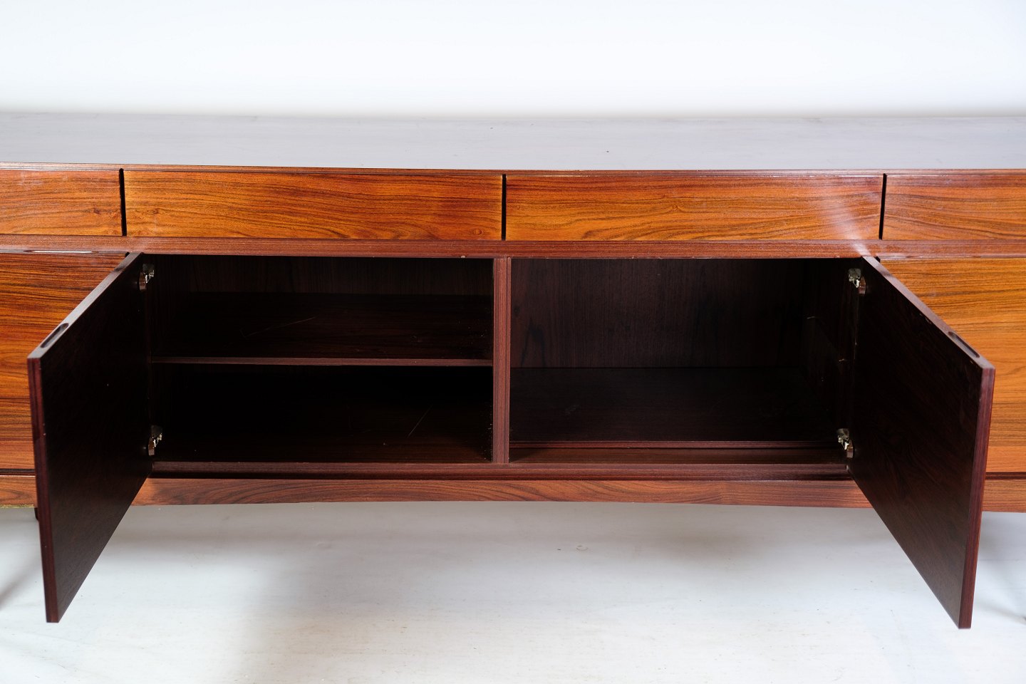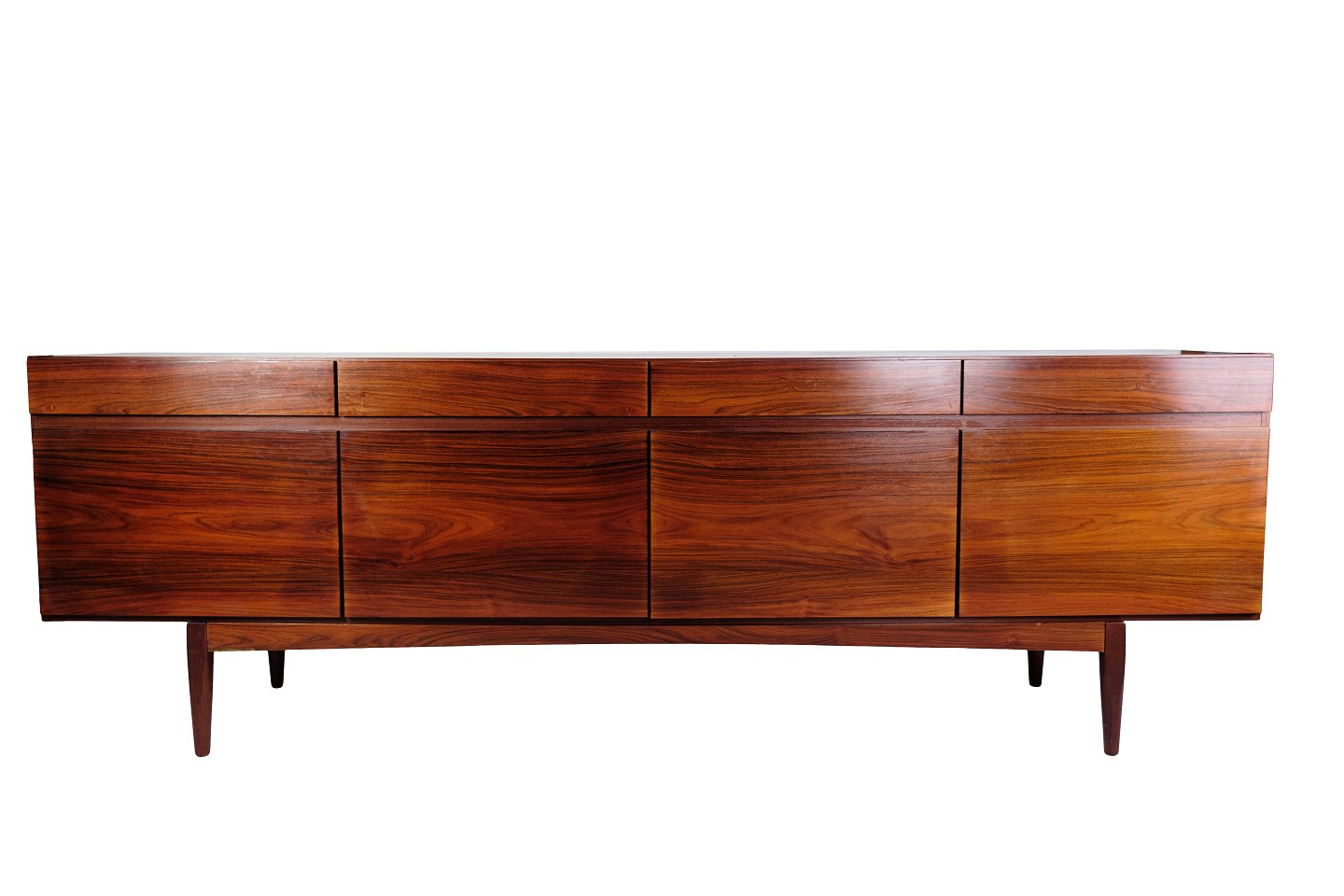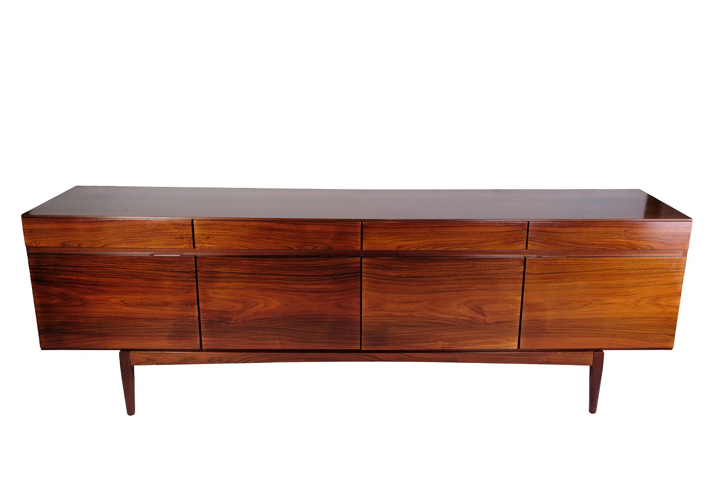 SoldRosewood sideboard designed by Ib Kofod-Larsen, model FA66 manufactured at Faarup Møbelfabrik in the 1960s. A low free-standing sideboard of the highest quality. It is veneered with rosewood with a very beautiful structure. In the front it has four drawers, as well as four doors, where there are both shelves and pull-out trays.