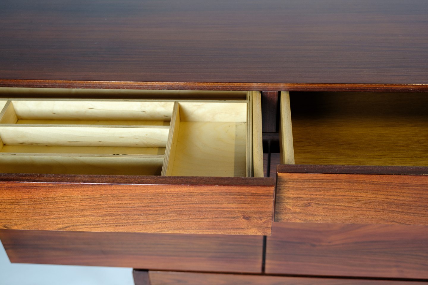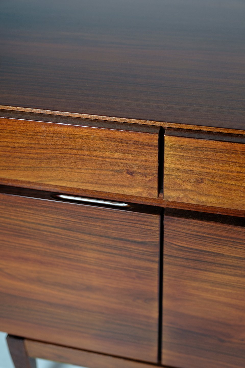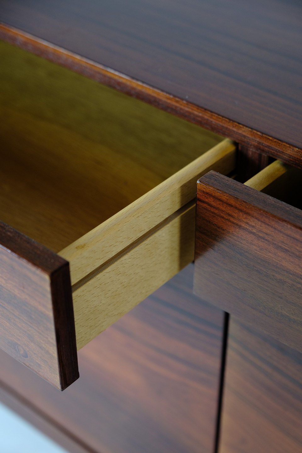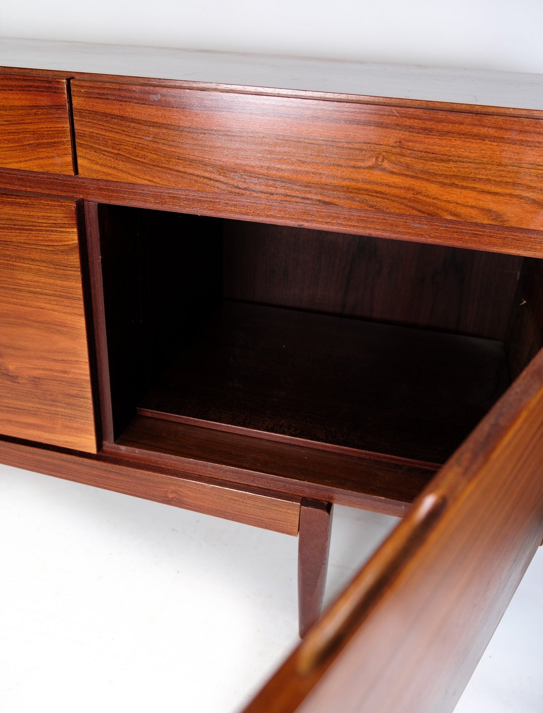 SoldRosewood sideboard designed by Ib Kofod-Larsen, model FA66 manufactured at Faarup Møbelfabrik in the 1960s. A low free-standing sideboard of the highest quality. It is veneered with rosewood with a very beautiful structure. In the front it has four drawers, as well as four doors, where there are both shelves and pull-out trays.