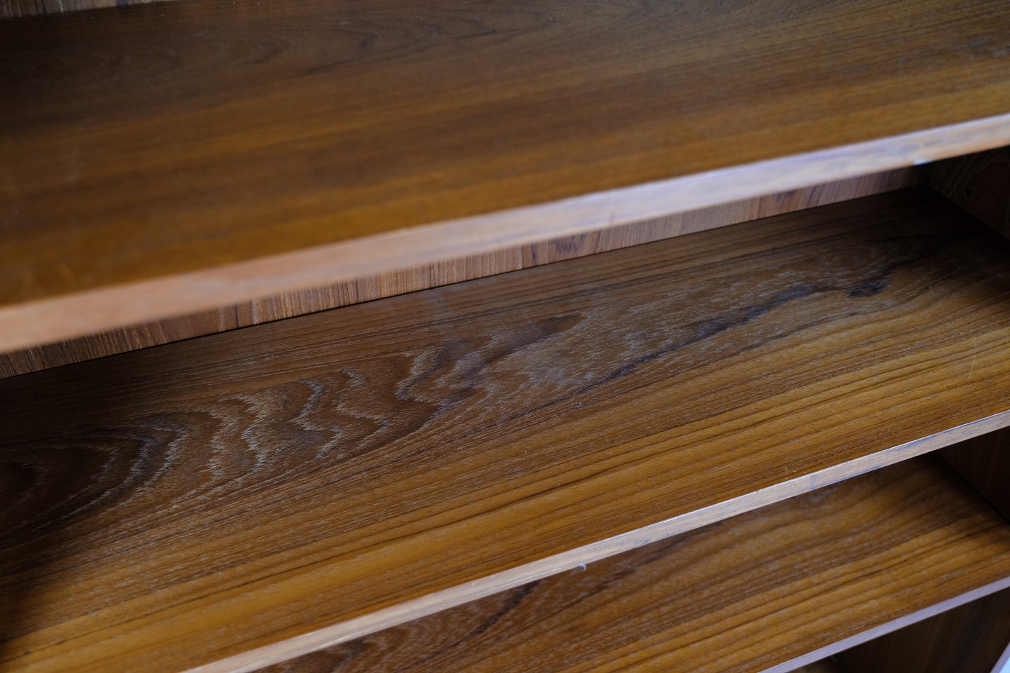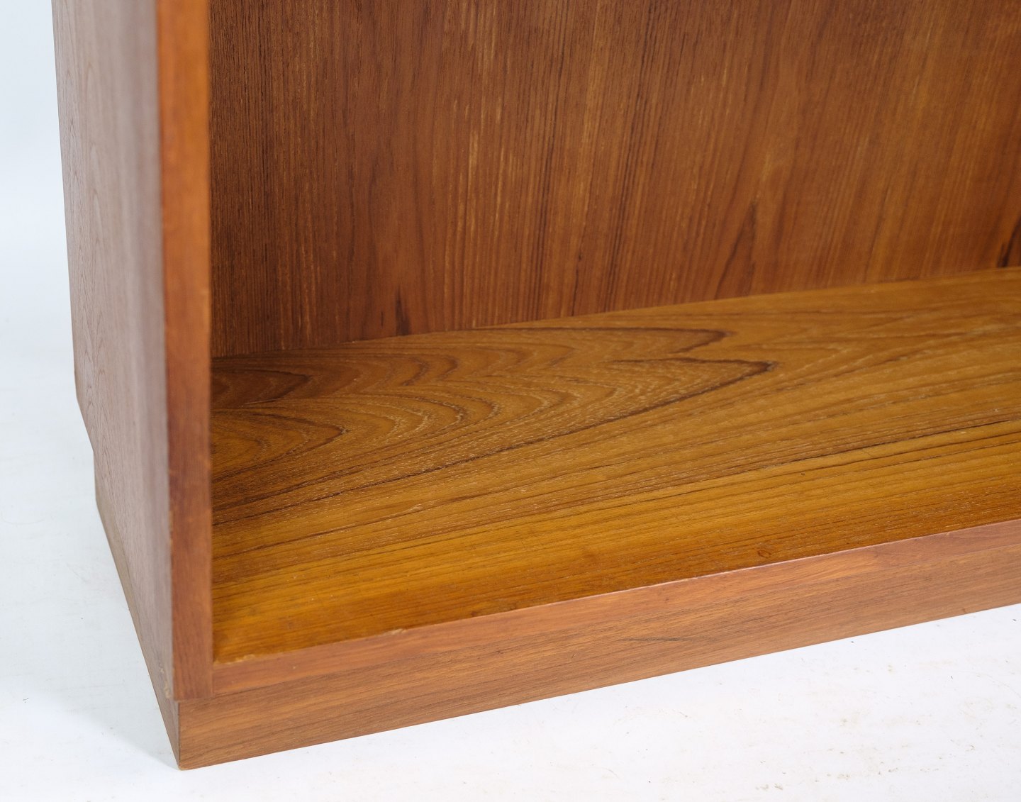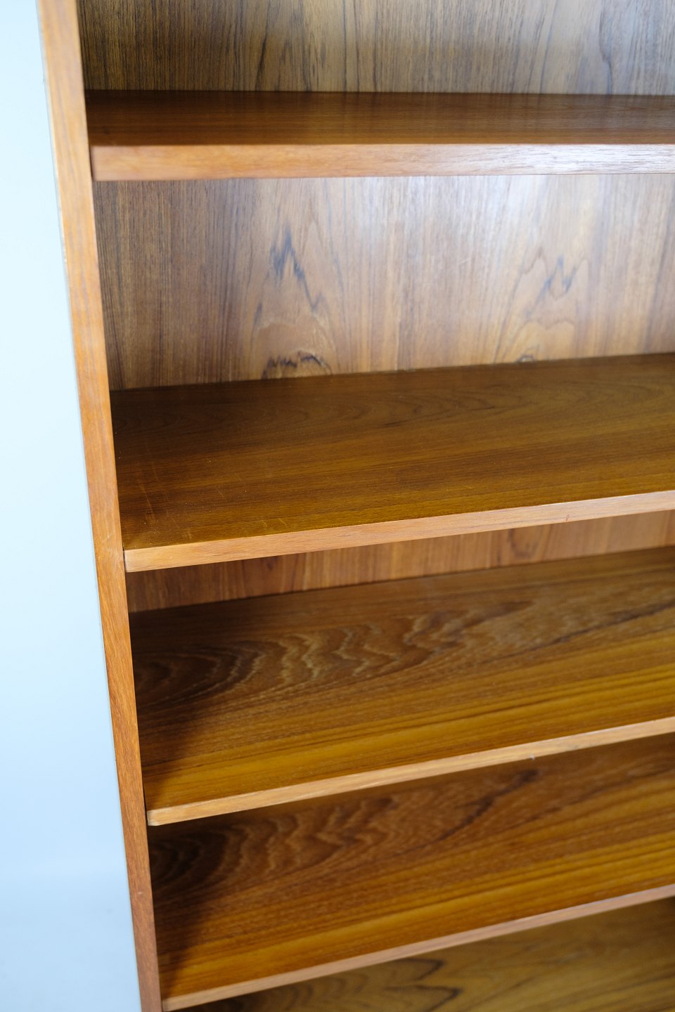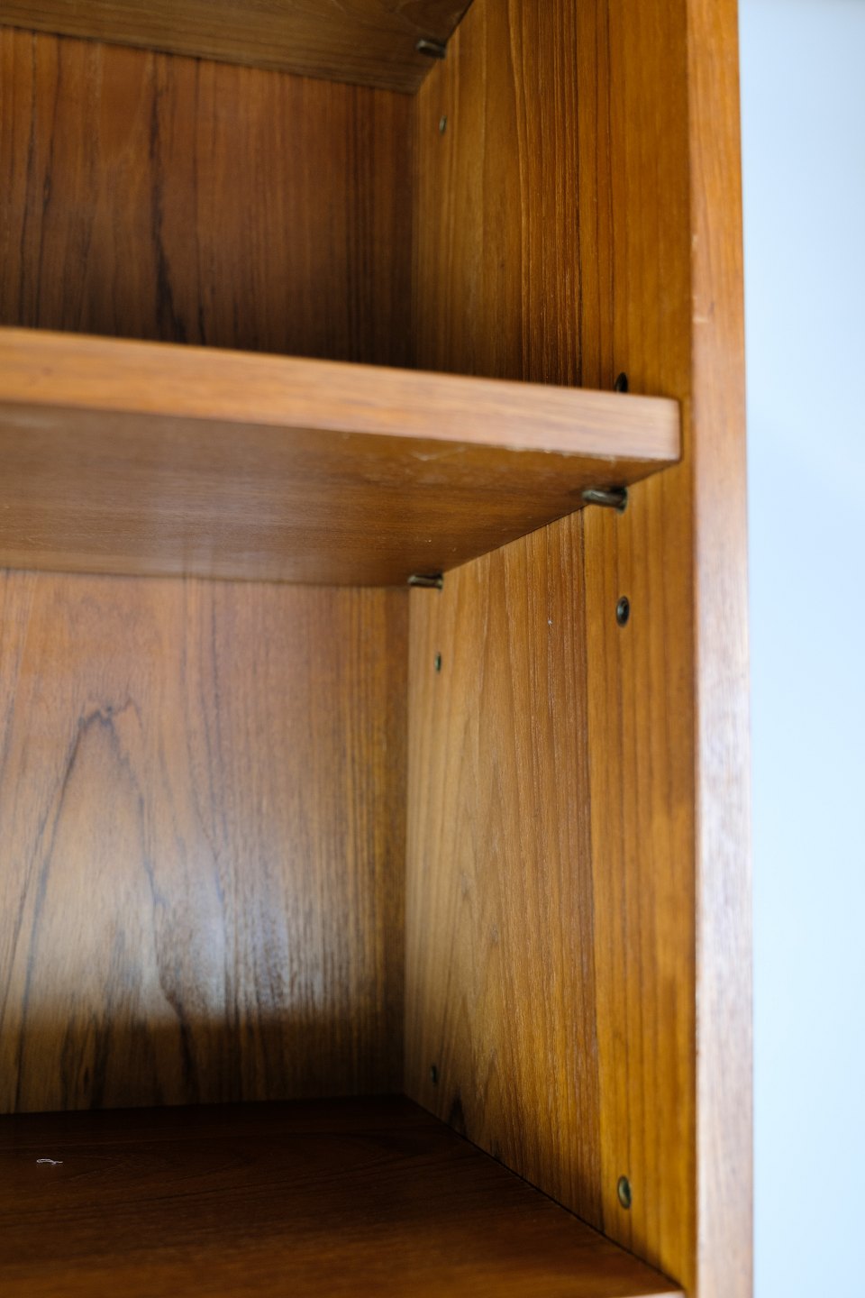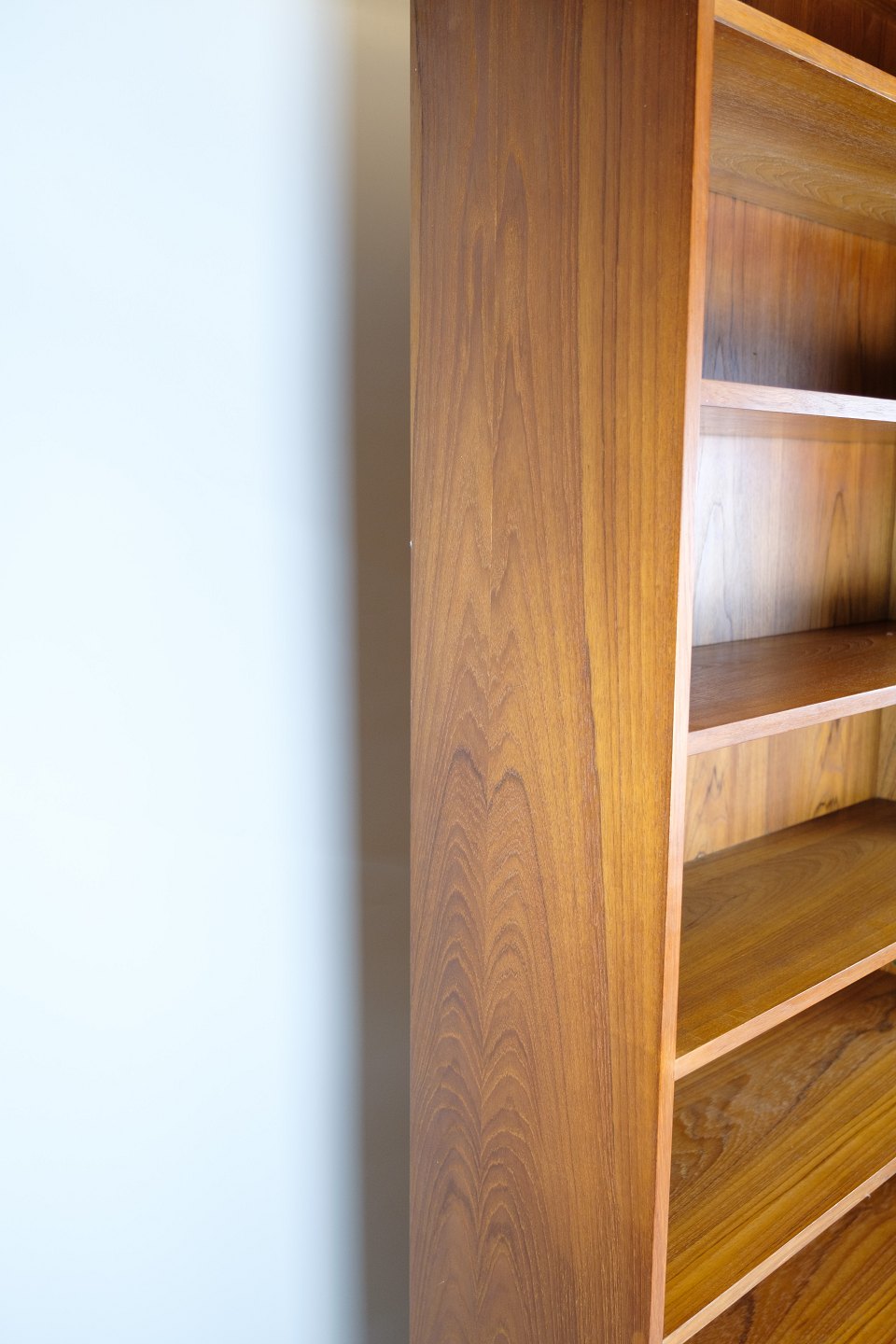 SolgtBogreol med flytbar hylder i teaktræ af dansk design fra omkring 1960'erne. Reoler af høj kvalitet. 3 stk på lager.