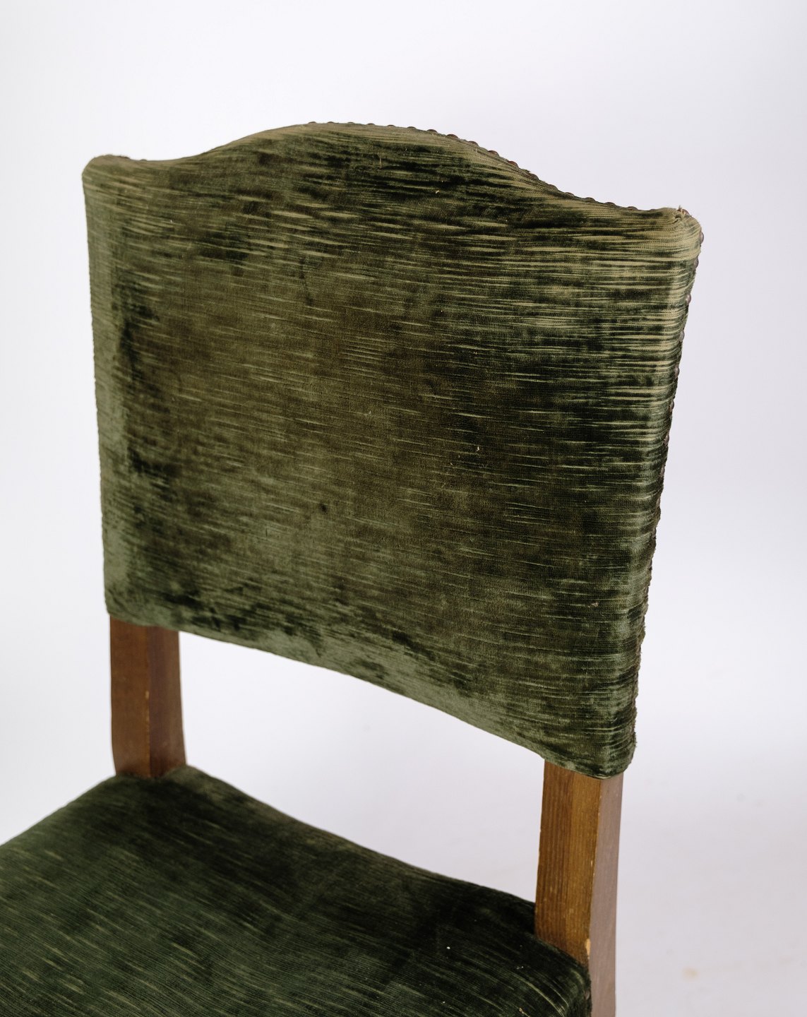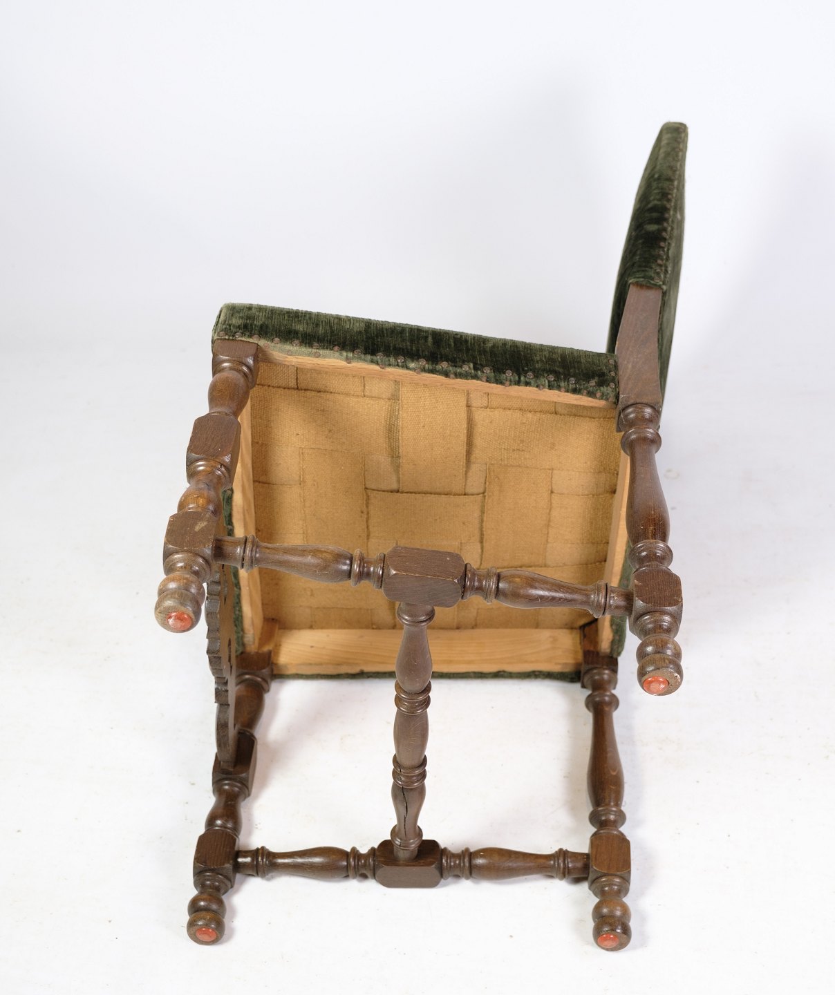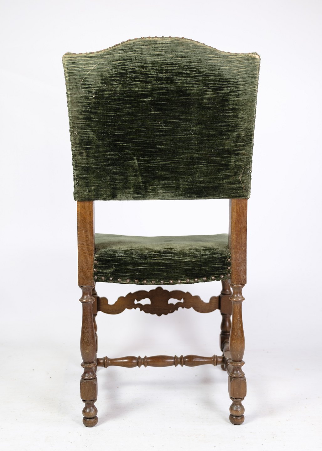 2 oak chairs in Renaissance style upholstered with green velor fabric from around the 1930s