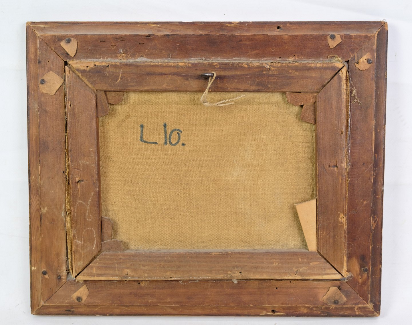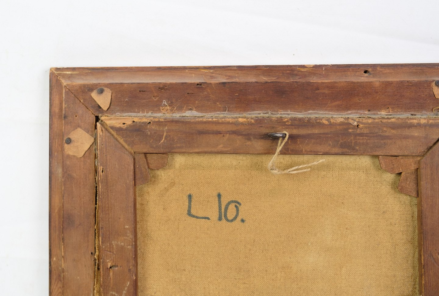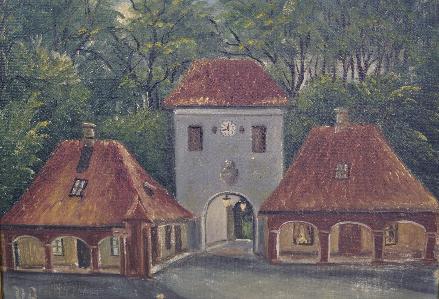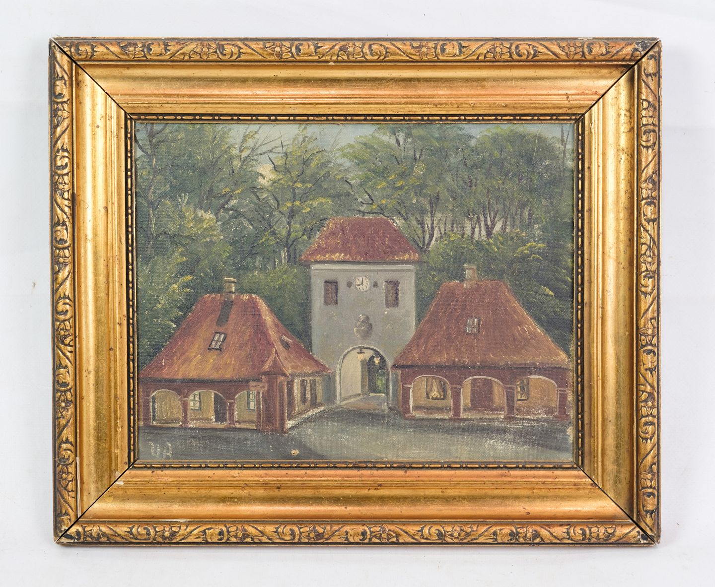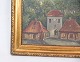 Oliemaleri på lærredet med motiv af bygning og skov med guld ramme fra omkring år 1920'erne.