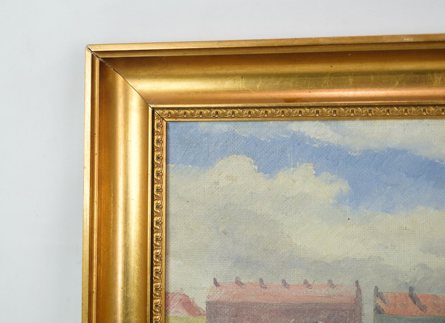 Oliemaleri på lærredet med motiv af landsby med guldramme fra omkring år 1930'erne.