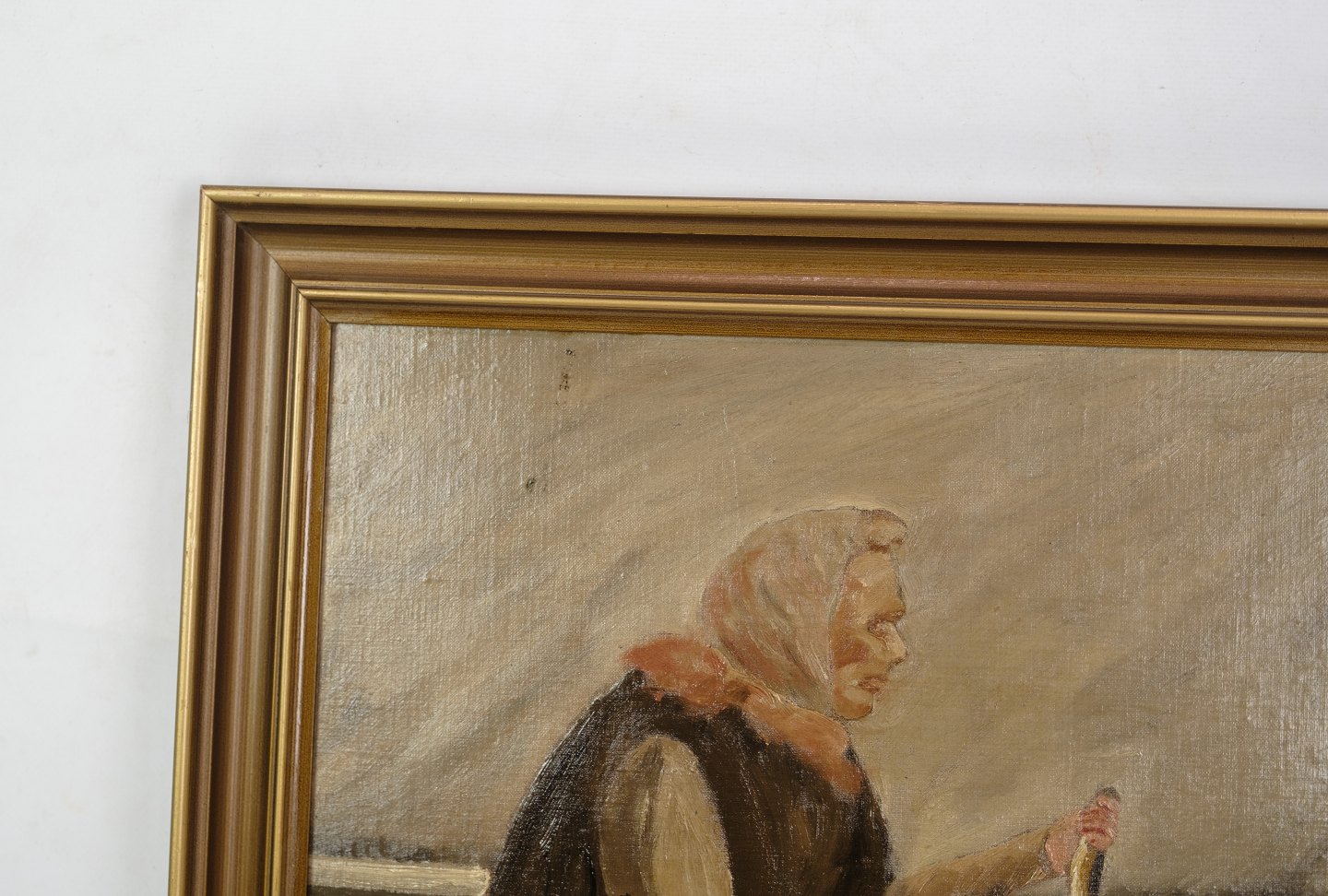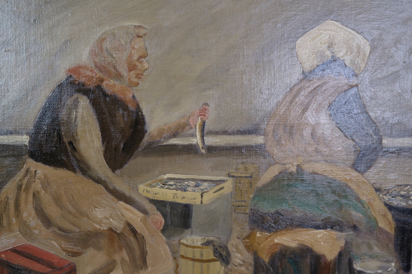 Oil painting painted on wooden plate with motif of fish wives from an old beach in Copenhagen from around the 1930s. Signed