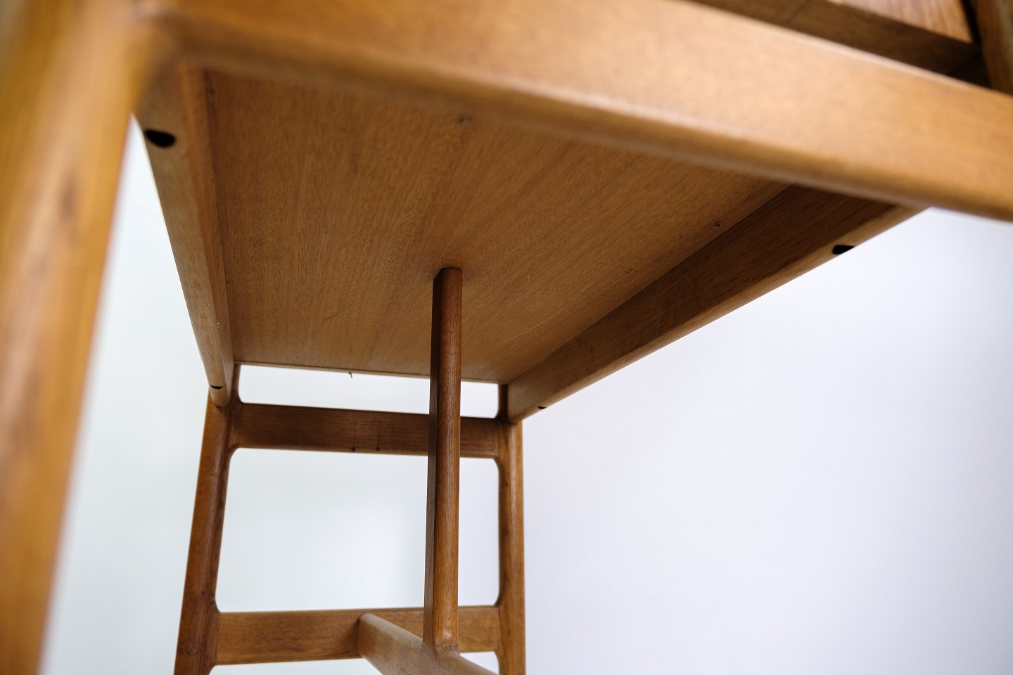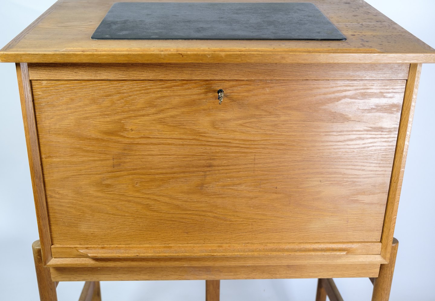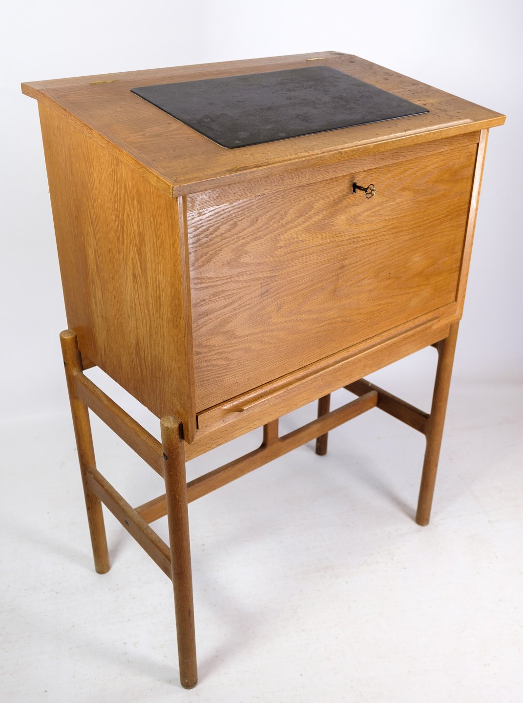 Skrivepulten er et godt eksempel på dansk møbeldesign fra 1960'erne, hvor funktionalitet og enkelhed var i fokus. Designet er slankt og elegant, og den enkle linjeføring giver et moderne udtryk. Den medfølgende nøgle tilføjer en ekstra sikkerhedsfunktion og et strejf af vintage-charme.