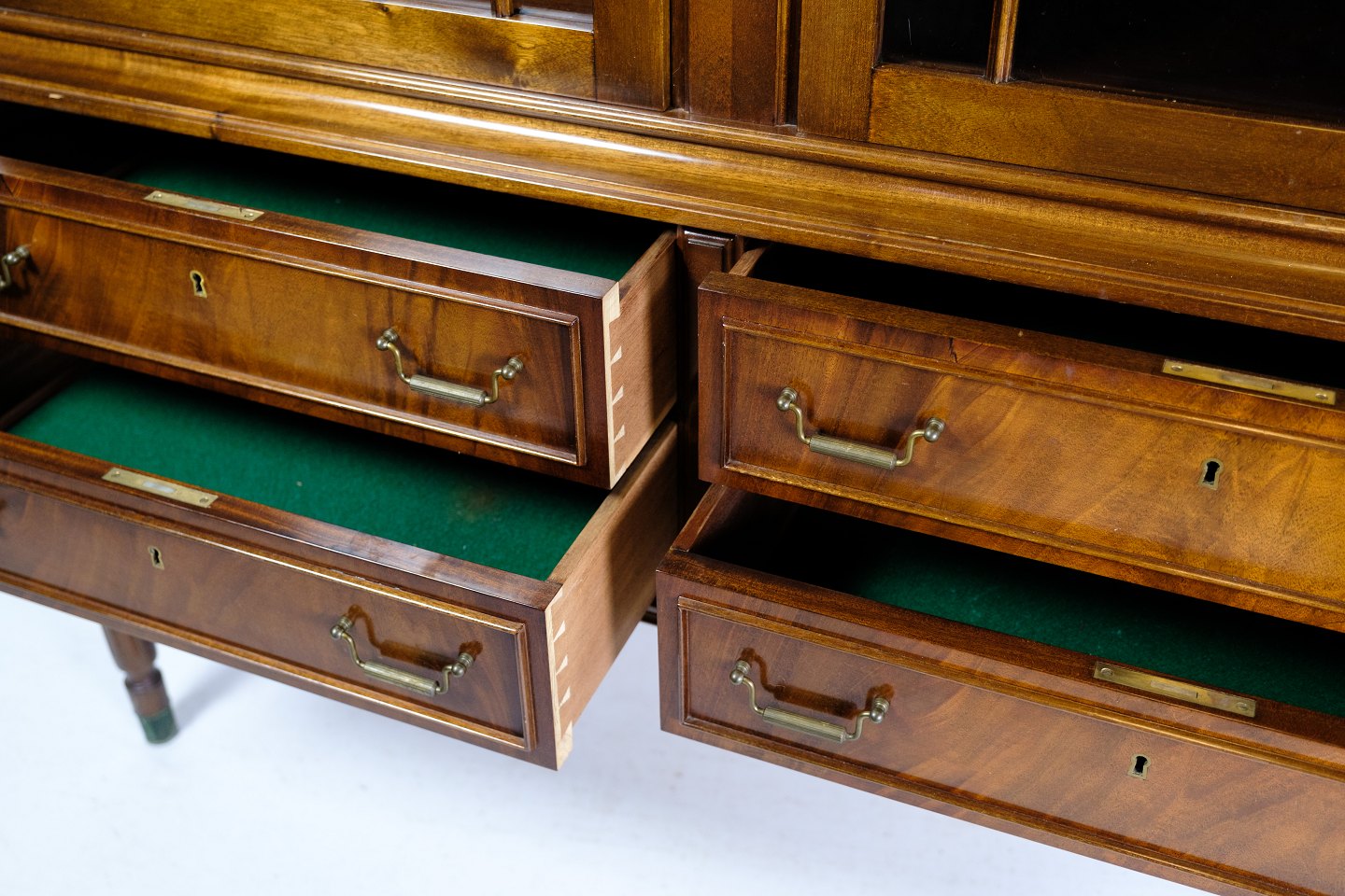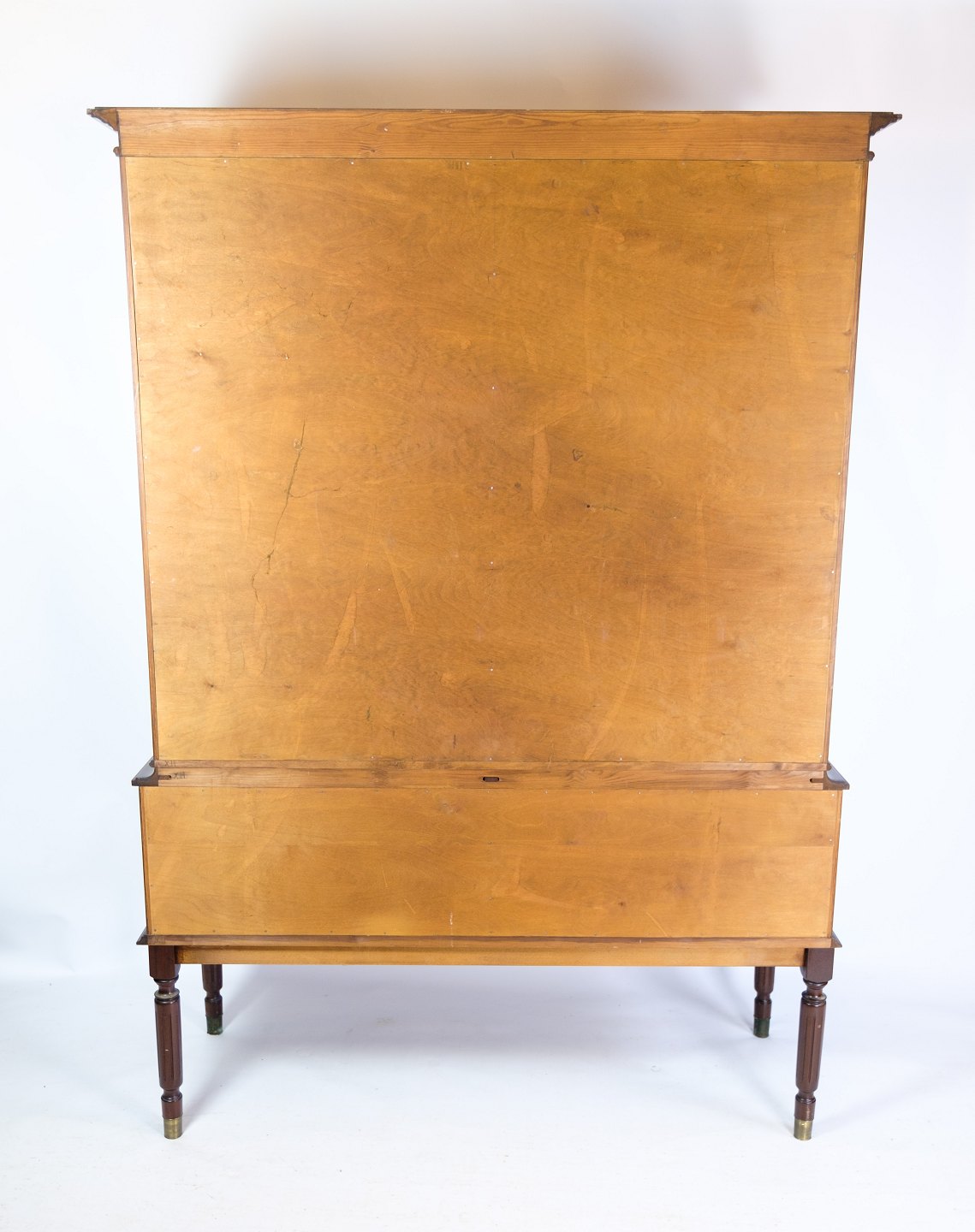 Det er en perfekt repræsentation af Hepplewhite-stilen med dens karakteristiske delikate linjer, symmetri og fine håndværk. Mahognitræet tilføjer varme og rigdom til rummet og fremhæver skabets fine detaljer.