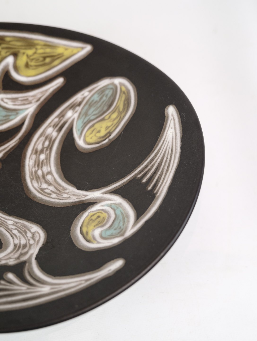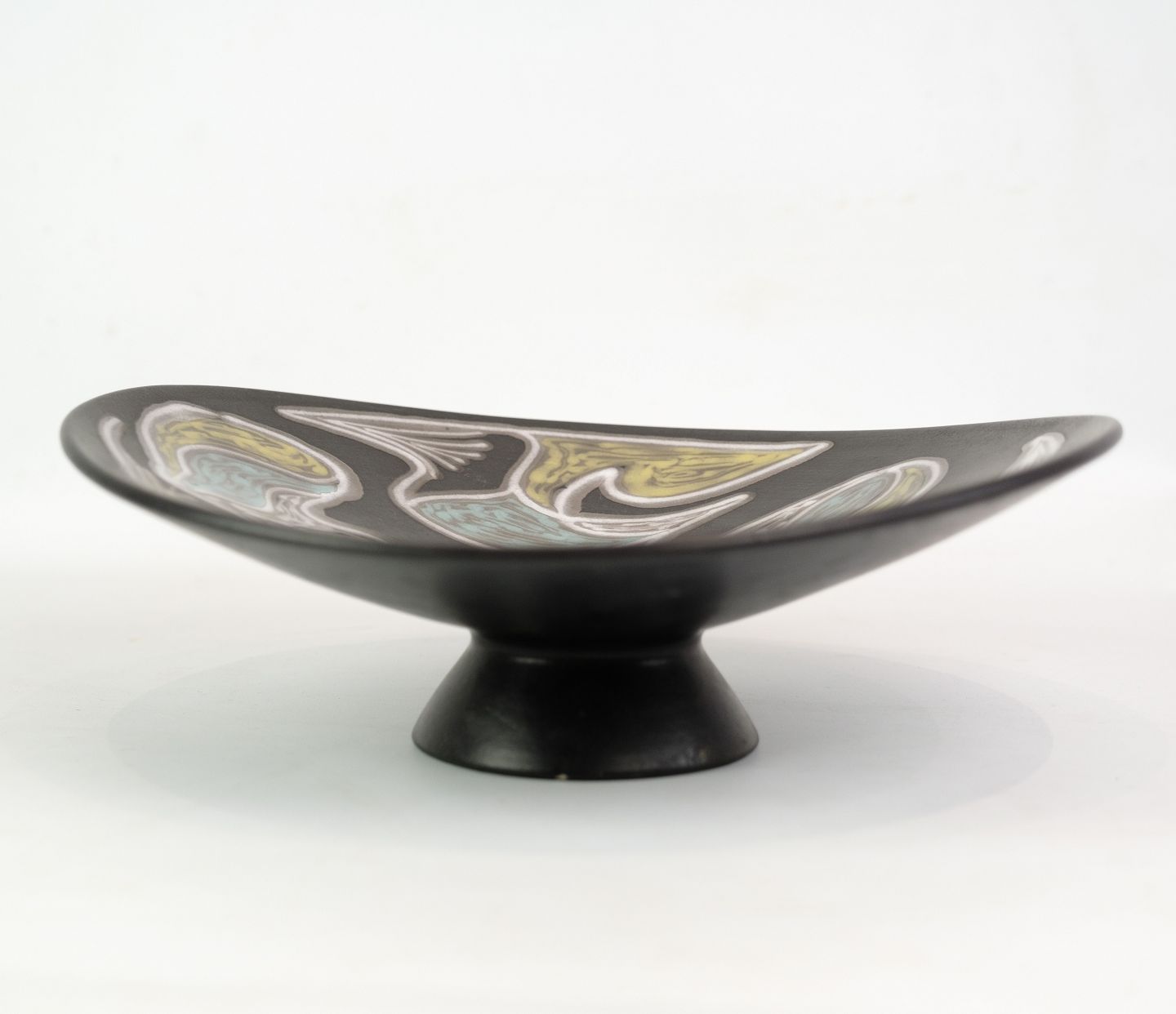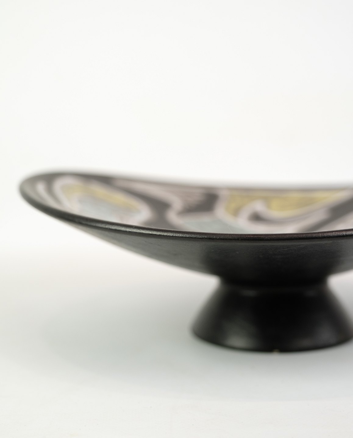 Stort fad på fod fra Søholm keramik designet af Holm Sørensen i 1950'erne. Det er efterfølgende blevet dekoreret af Svend Aage Jensen med farverne hvid, gul og lyseblå.