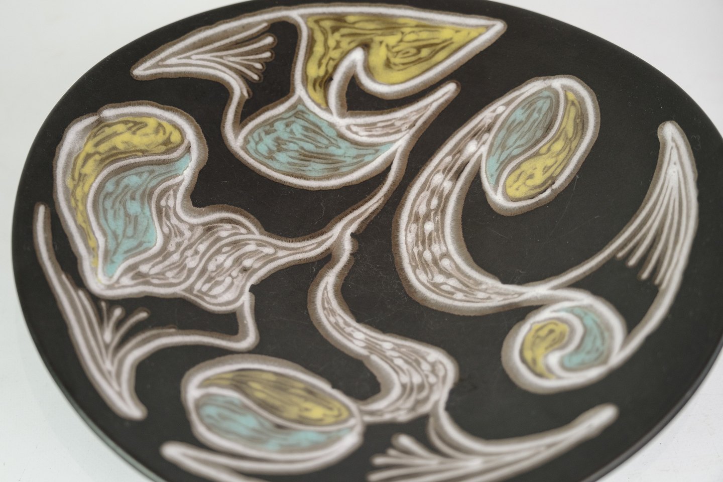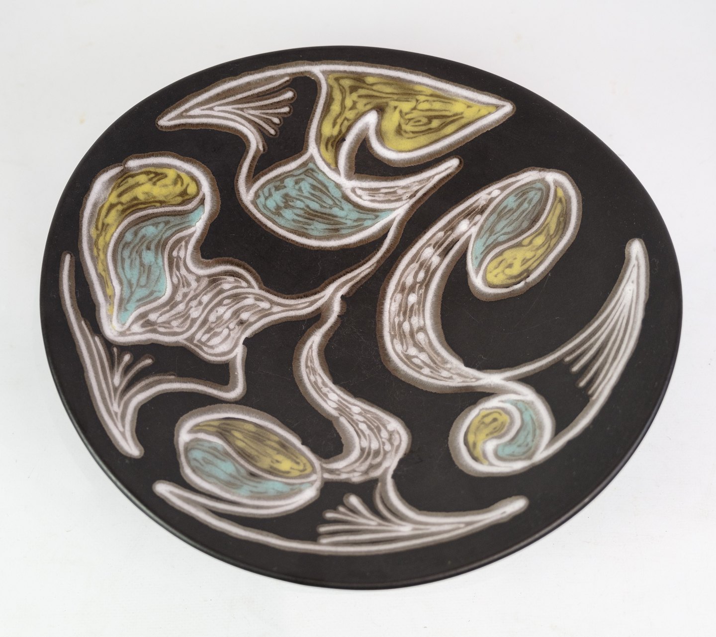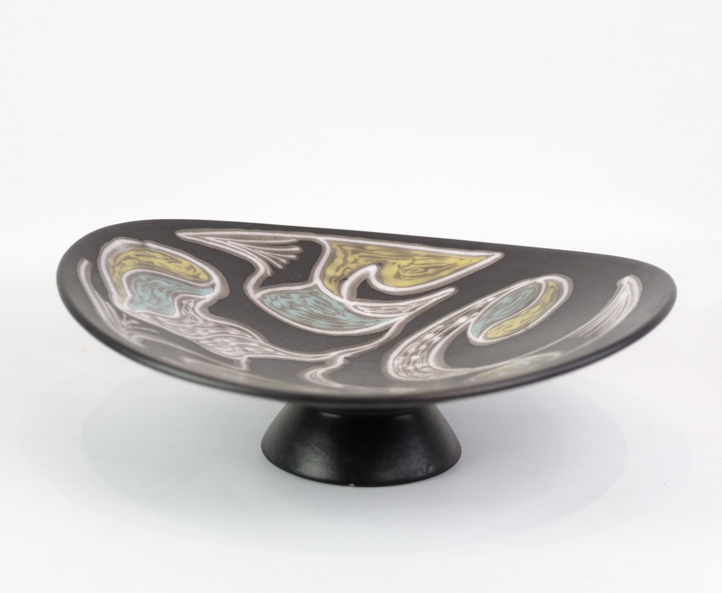 Stort fad på fod fra Søholm keramik designet af Holm Sørensen i 1950'erne. Det er efterfølgende blevet dekoreret af Svend Aage Jensen med farverne hvid, gul og lyseblå.
