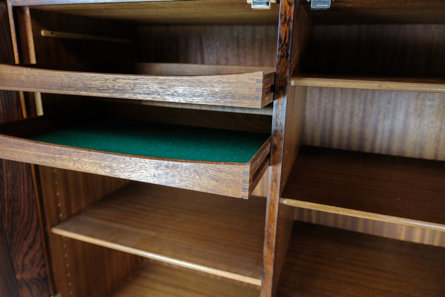 Dette skab, designet af Johannes Andersen og fremstillet af Bernhard Pedersen & Søn i Danmark i 1964, repræsenterer det bedste inden for dansk møbelhåndværk fra midten af det 20. århundrede.