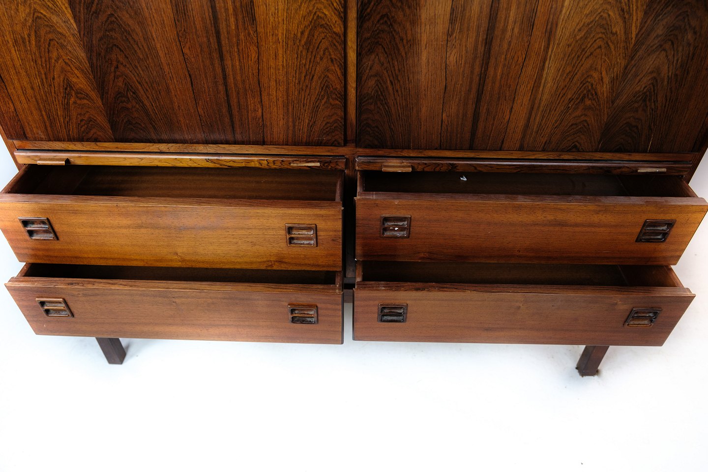 Skabets enkle, elegante design og brug af palisandertræet giver det en tidløs appel. De to låger og fire skuffer tilbyder praktisk opbevaringsplads, mens det smukt graverede palisandertræ tilføjer varme og karakter til ethvert rum.