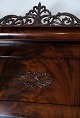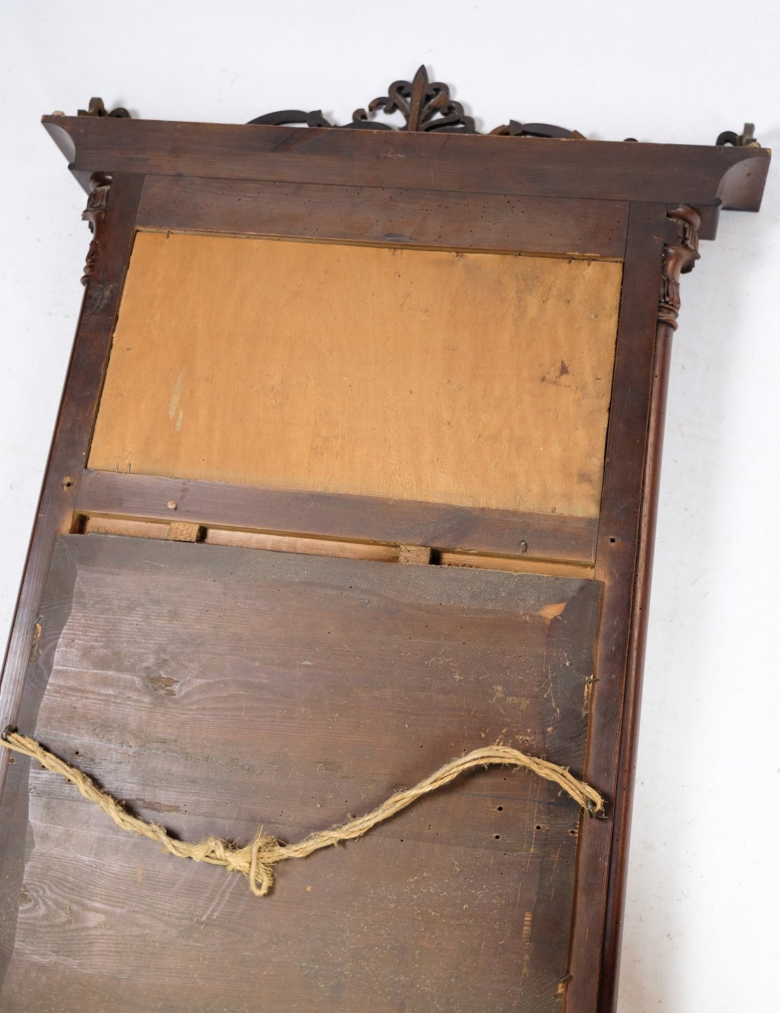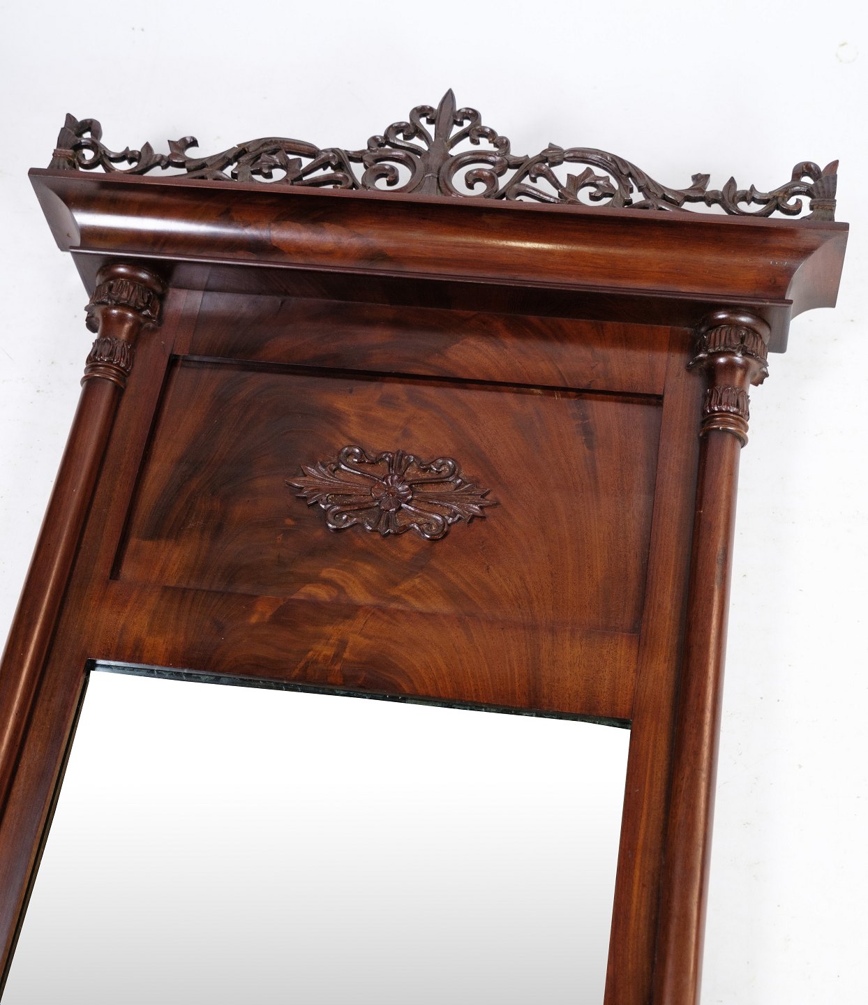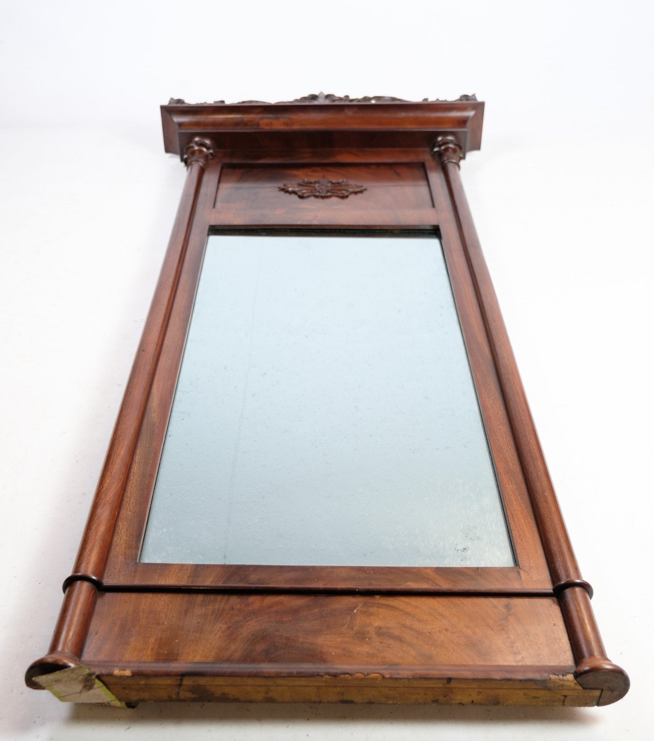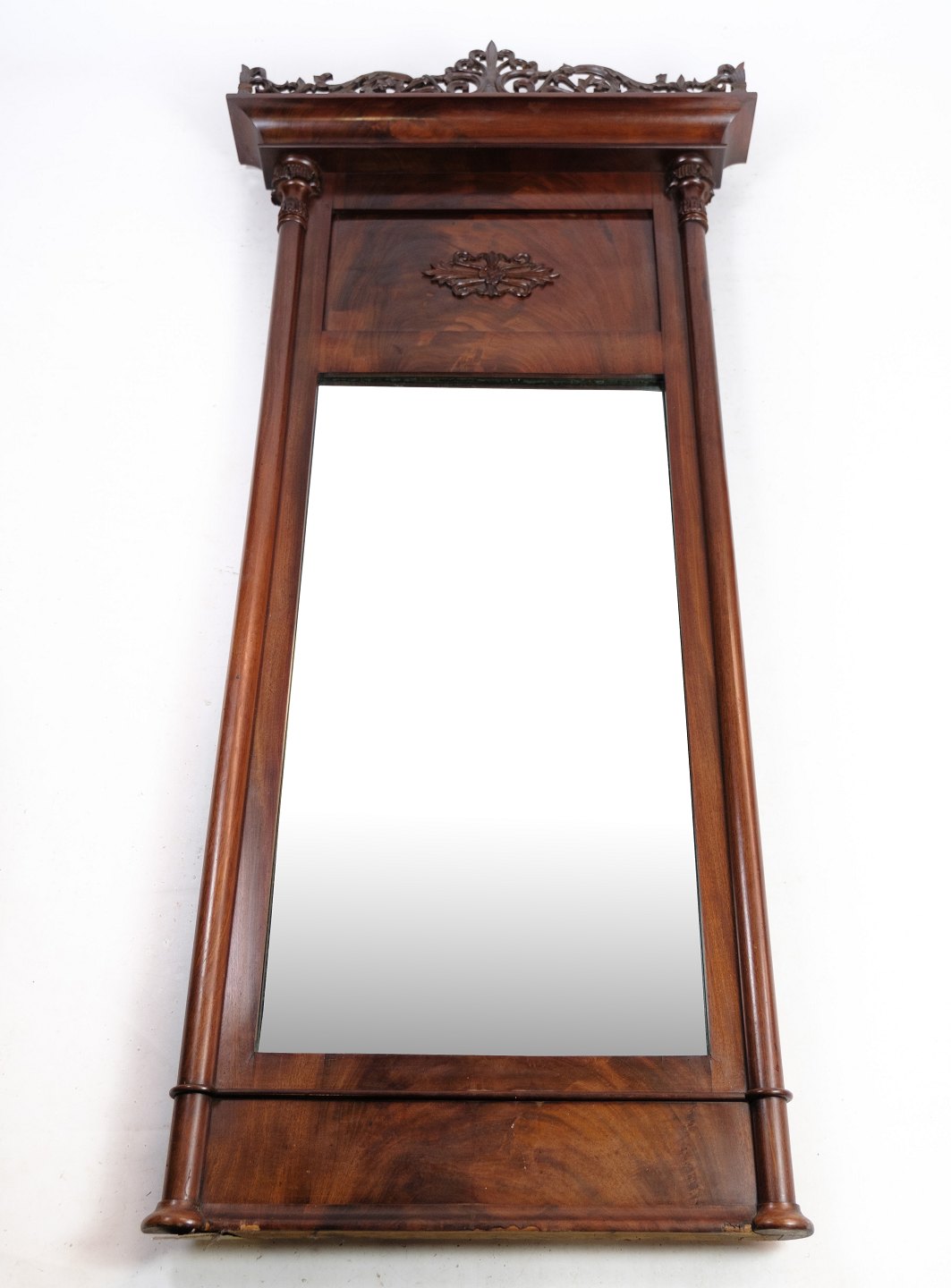 Mirror of hand-polished mahogany, from the late Empire period with carvings made in Denmark from around the 1840s.